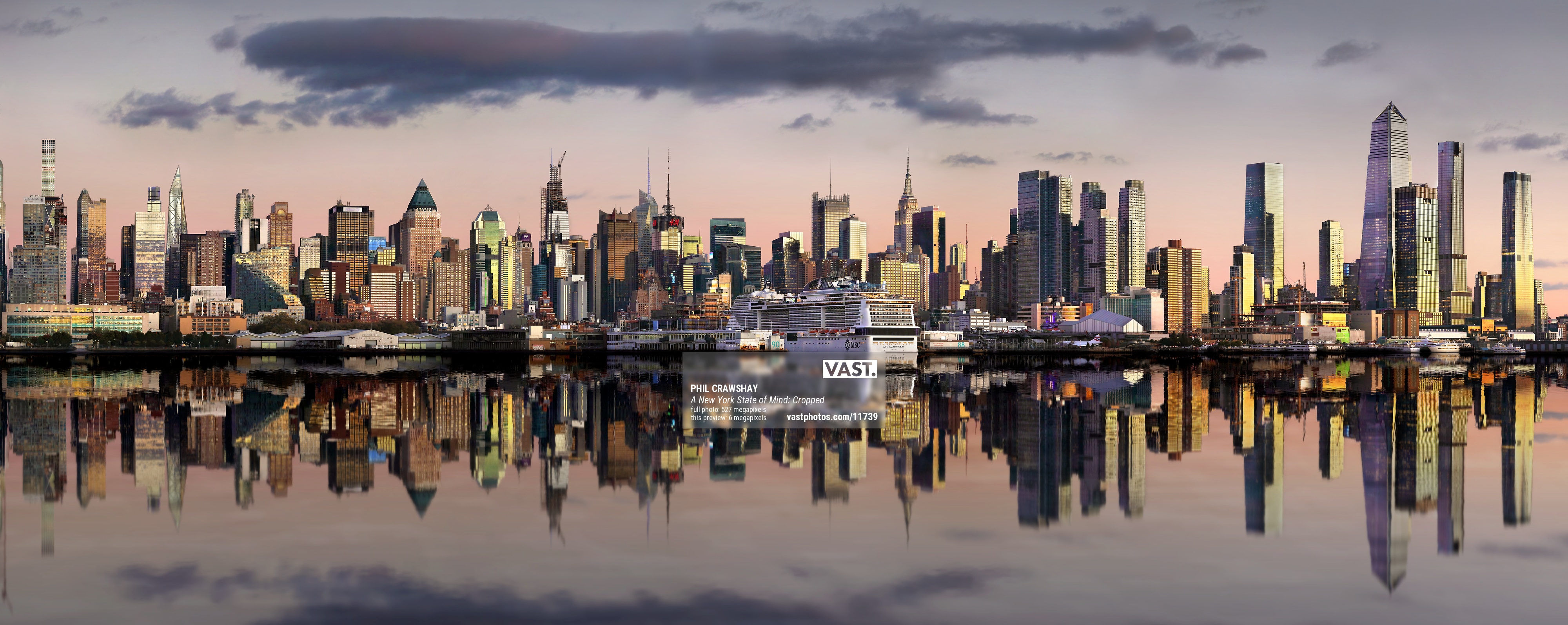 This was the third attempt at capturing this incredible skyline view of New York City from the New Jersey side. On the other attempts it was either too cloudy or raining, the Hudson was too choppy or the wind was too strong creating camera shake which can ruin the panorama as one blurred image in the 120 that make this image up can ruin the whole thing. Eventually I got the right weather and conditions to capture this stunning view.
