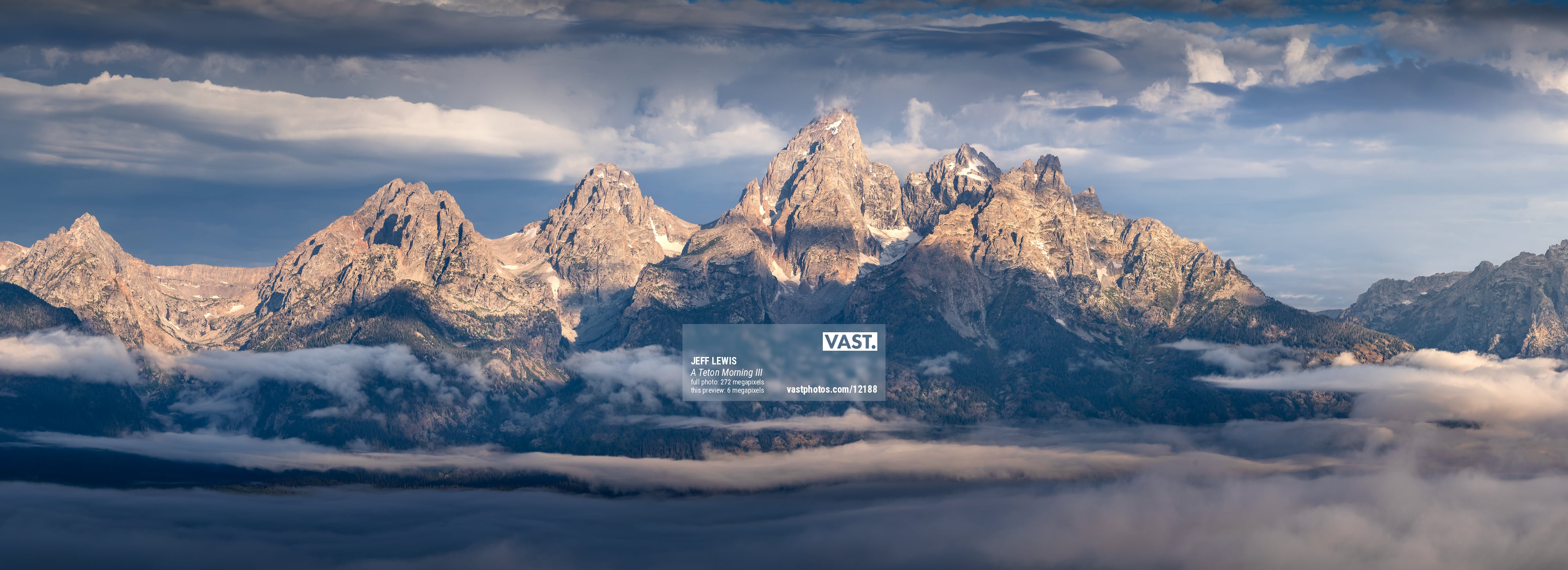 The scene was incredibly dynamic, with clouds drifting over the peaks and the fog changing colors. Thanks to the clear mountain air and sweeping views, I was able to capture five VAST photos over the course of a few hours, before heading back down the hill into the fog to start a 15-mile hike, which was also lovely! Over this trip, I hiked around 80 miles, which included a summit of Middle Teton, the second highest peak in the range and prominently visible in the center of this VAST photo. It was a long day, but one of the most rewarding summits I've stood on, and it made the photos from the trip much more special. I hope you're able to enjoy it as well!