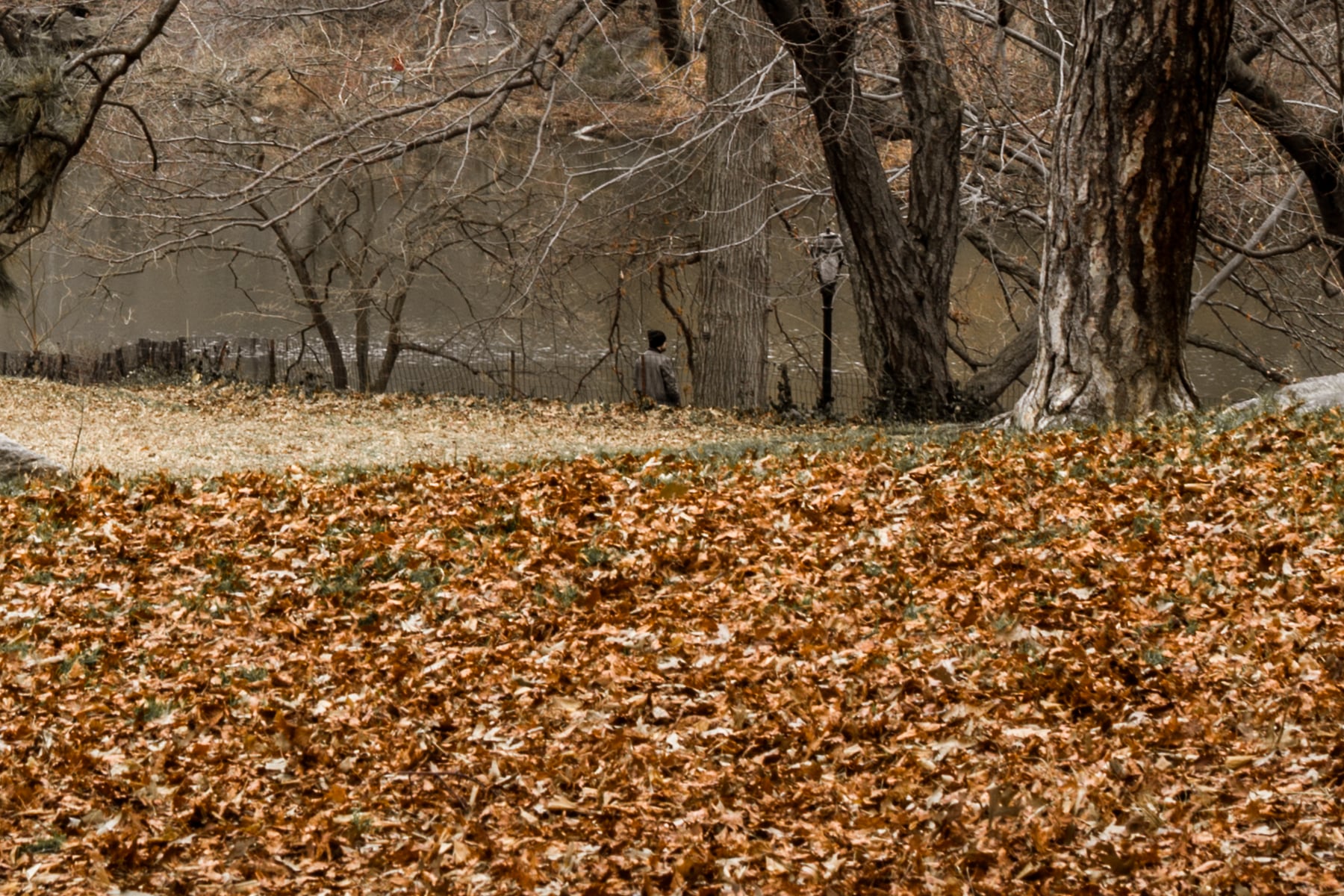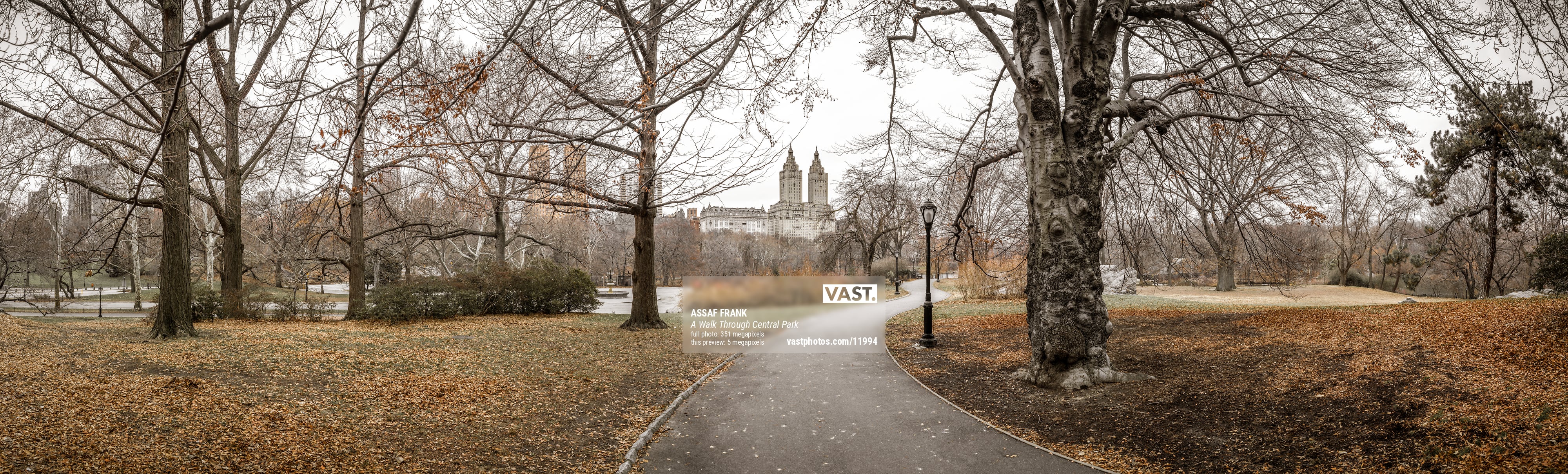 A winding pathway meanders through Central Park in New York City, offering a peaceful retreat amidst the city's bustling energy. The trees, adorned with the last remnants of autumn leaves, create a serene atmosphere, framing the path with their intricate, bare branches. The soft, muted tones of the season give the park an enchanting and tranquil appeal, making it an inviting space for a leisurely stroll or quiet contemplation.