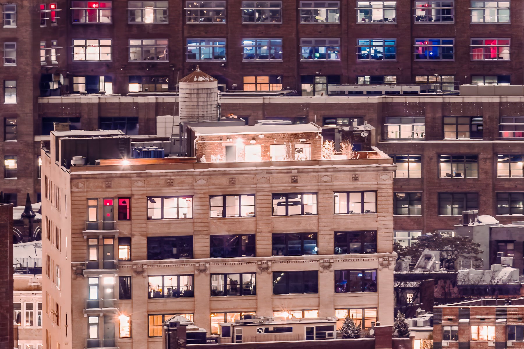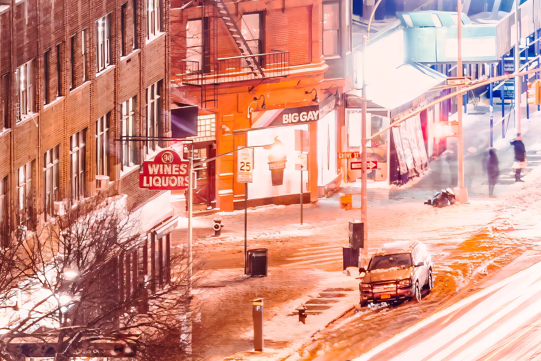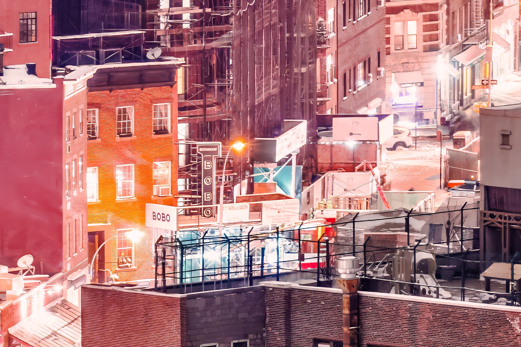 A snowstorm had just passed and a clear sky was allowing the moonlight to illuminate the snow-covered rooftops in a sparkling white sheen. Residents, cozy in their homes, socialized behind glowing windows dotting the cityscape. 7th avenue, one of the arterial thoroughfares through the neighborhood, was abuzz with foot traffic as New Yorkers strolled into its famous shops and eateries.