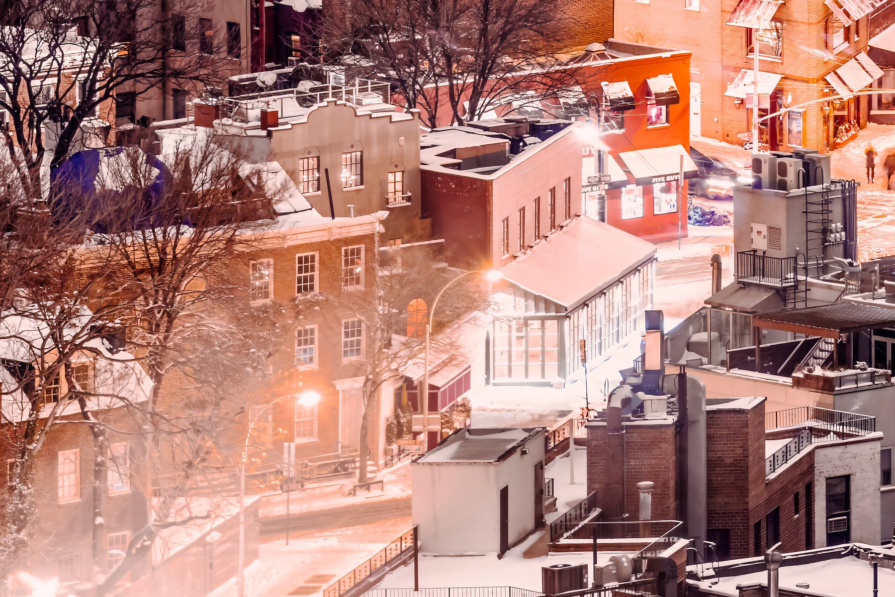 The idyllic neighborhood develops a special charm in the winter months as the warmth of tiny European cafes and candlelit restaurants spills out onto the manicured sidewalks coated in snow. It is this charm that I wanted to capture from a unique vantage point high above the buildings on a snowy Saturday night in early January.