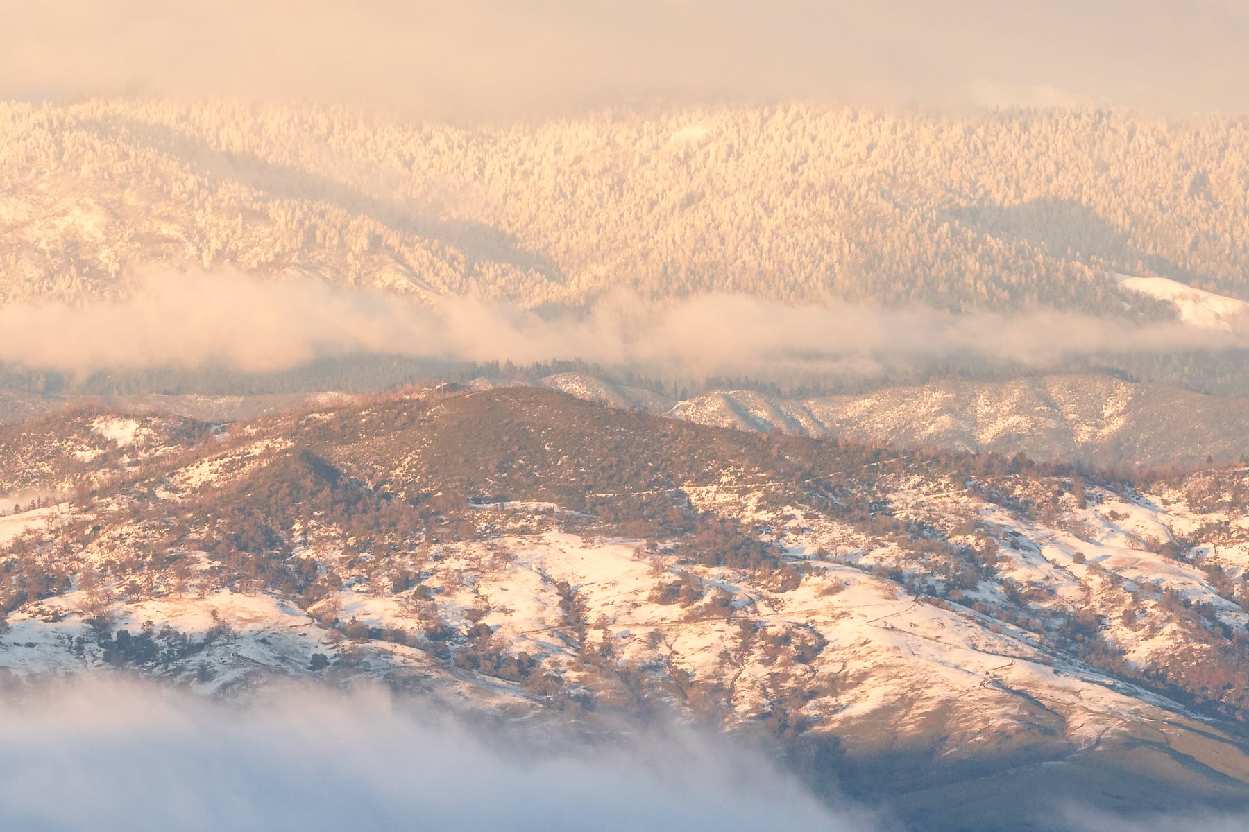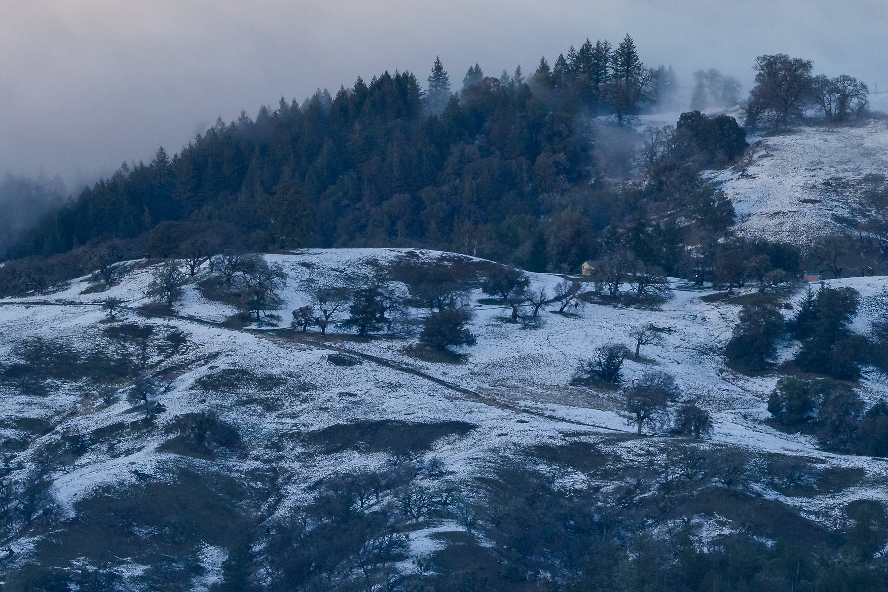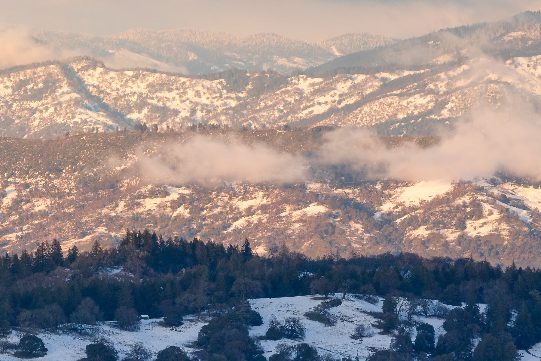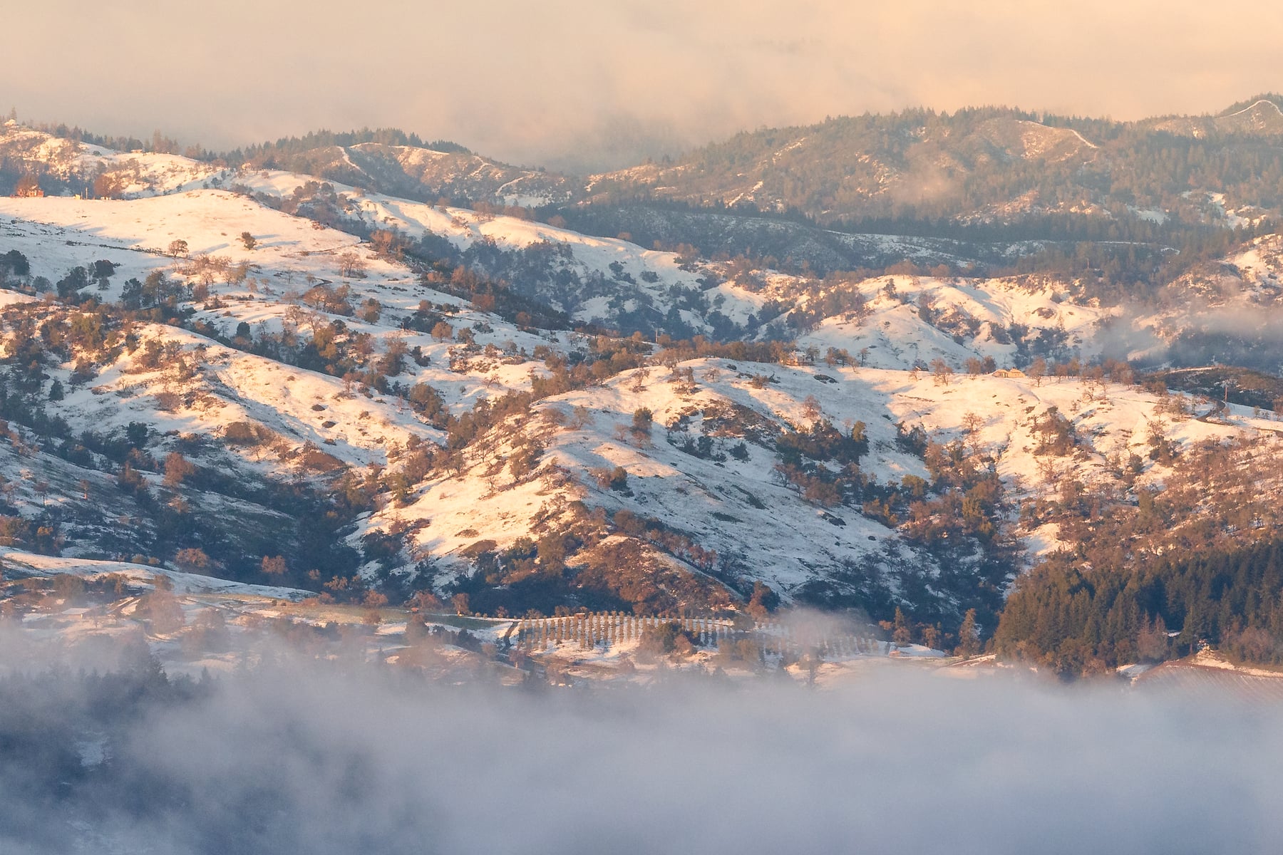 On rare occasions, snow dustings occur at low elevations in Northern California. I took this photo just as an extremely cold, powerful winter storm was clearing out of the area. The same storm produced snow down to 1000' in the San Francisco Bay Area, and several feet of snow that closed roads for days in the Lake Tahoe region. It was a very special opportunity to photograph a fleeting winter scene in an area that isn't known for it. I seized the opportunity and went for a drive, just following my instinct until I saw the snowy hills, and drove up into them. After photographing some snow-covered oak trees in the stormy cloak of winter, then hiking up a mountain the following morning to catch the clearing storm back home in Marin County, I came back up here the next evening to watch the storm clear. This is the scene I was greeted with. This is not a commonly photographed area, especially considering how beautiful it is!