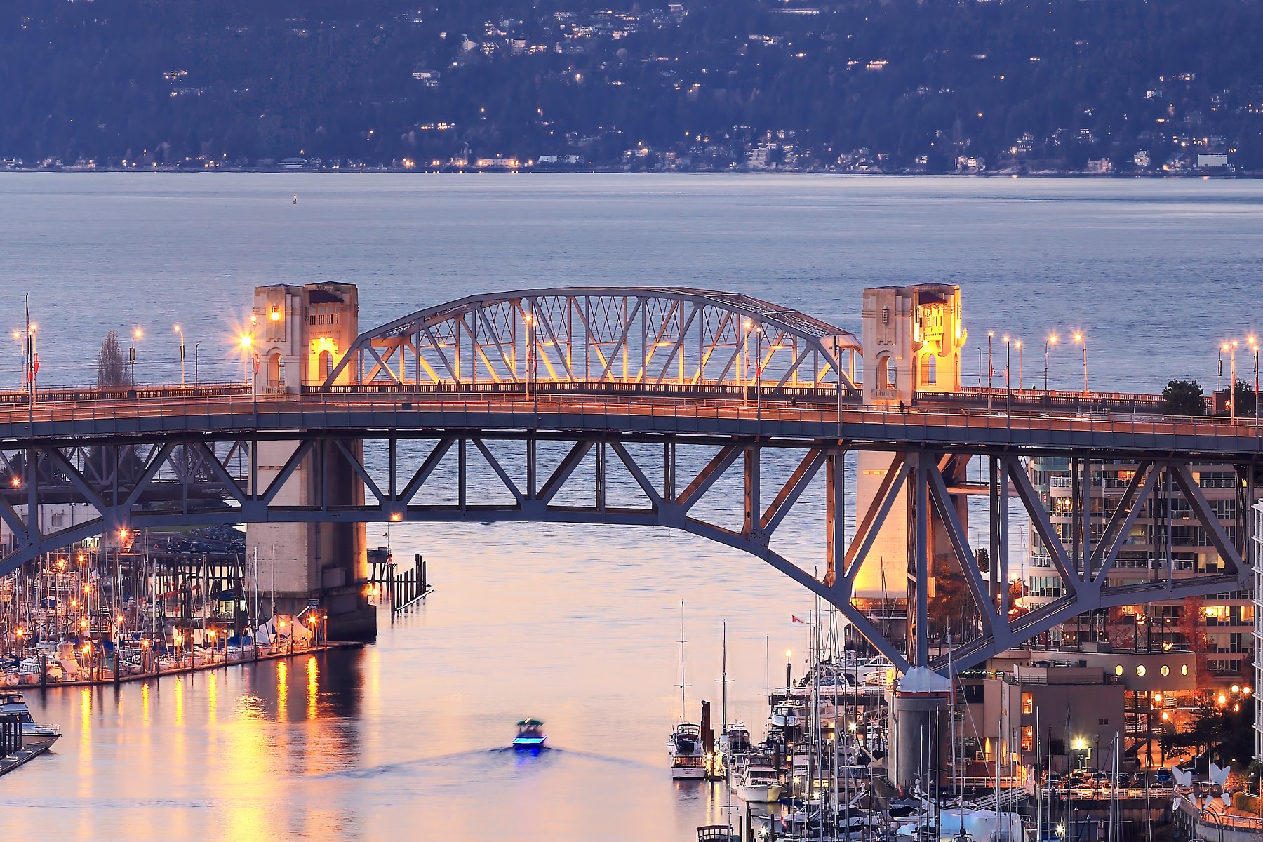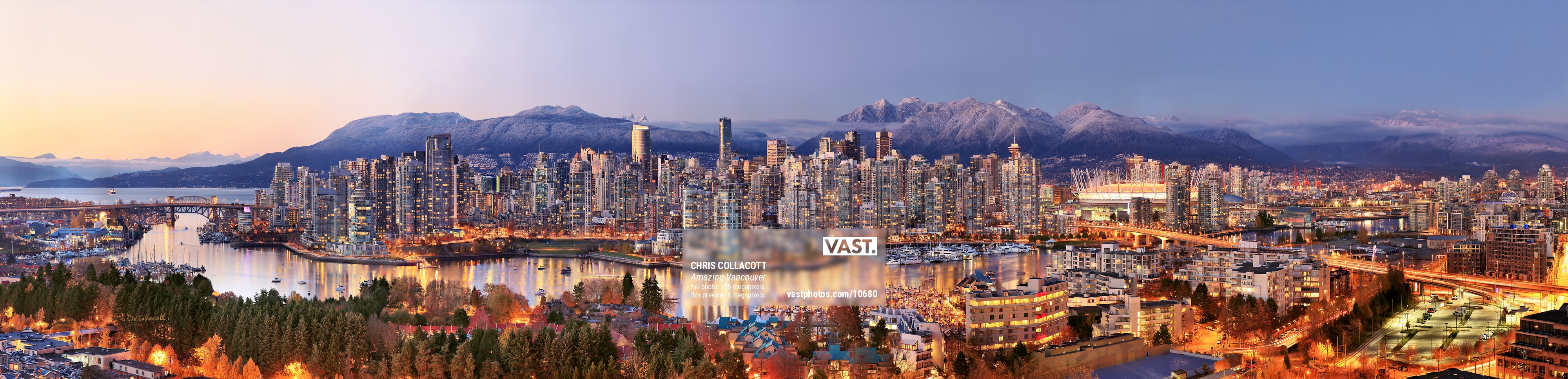 Taken just after sunset, the glow of the horizon reflects off the expansive cityscape, lighting up the buildings in a stunning display of golden orange hues. Since Vancouver sunsets evolve and transform from one moment to the next, I had a short 10-minute window to take the 100 photos that combine for a panoramic view with incredibly precise detail; from the clarity of the windmill on Grouse Mountain and the ski hills on Cypress, to a friend’s boat easily spotted in the False Creek Marina.