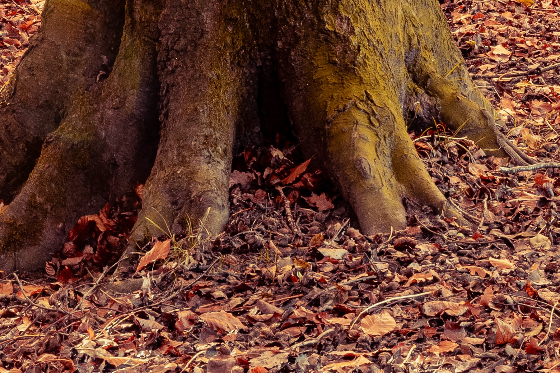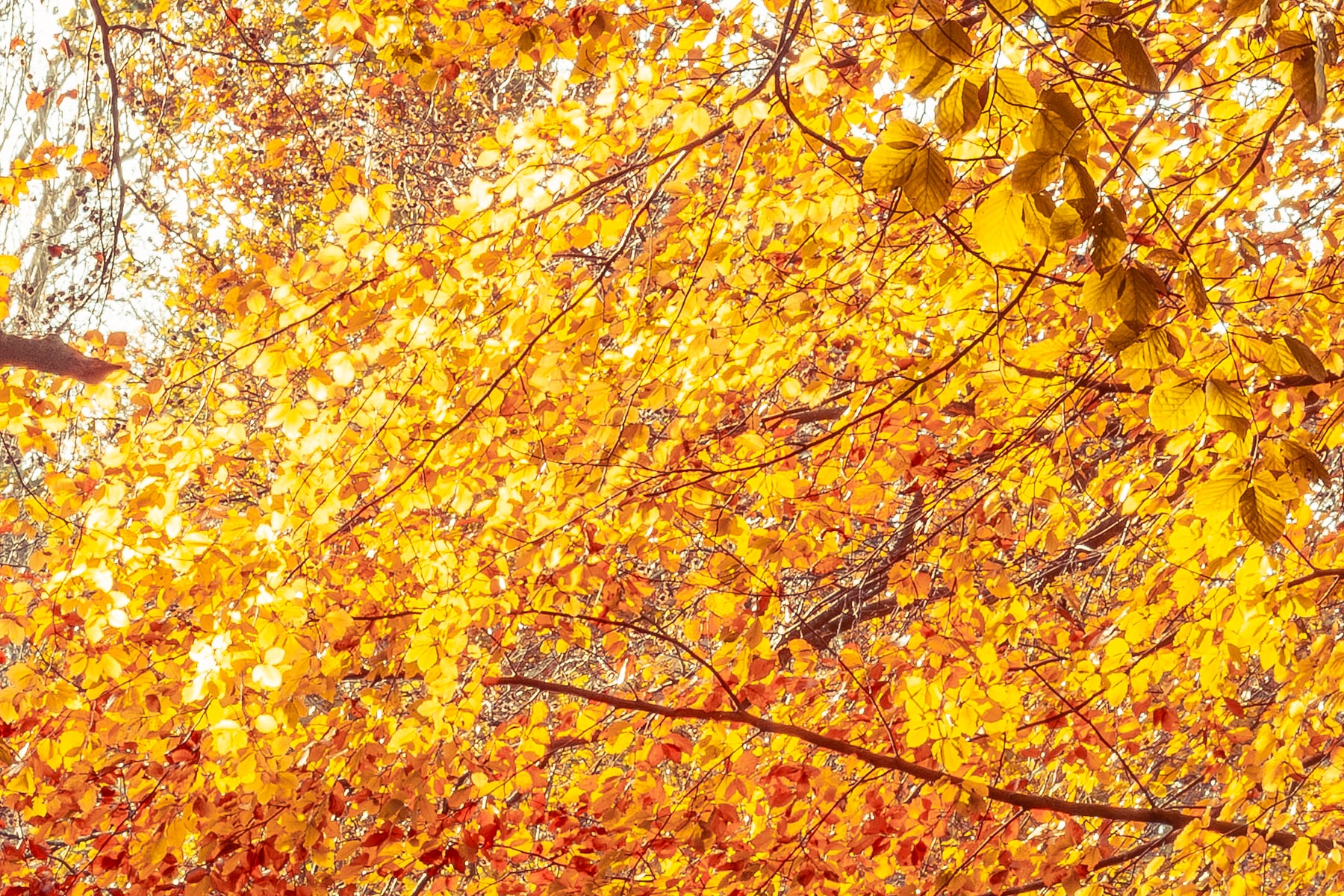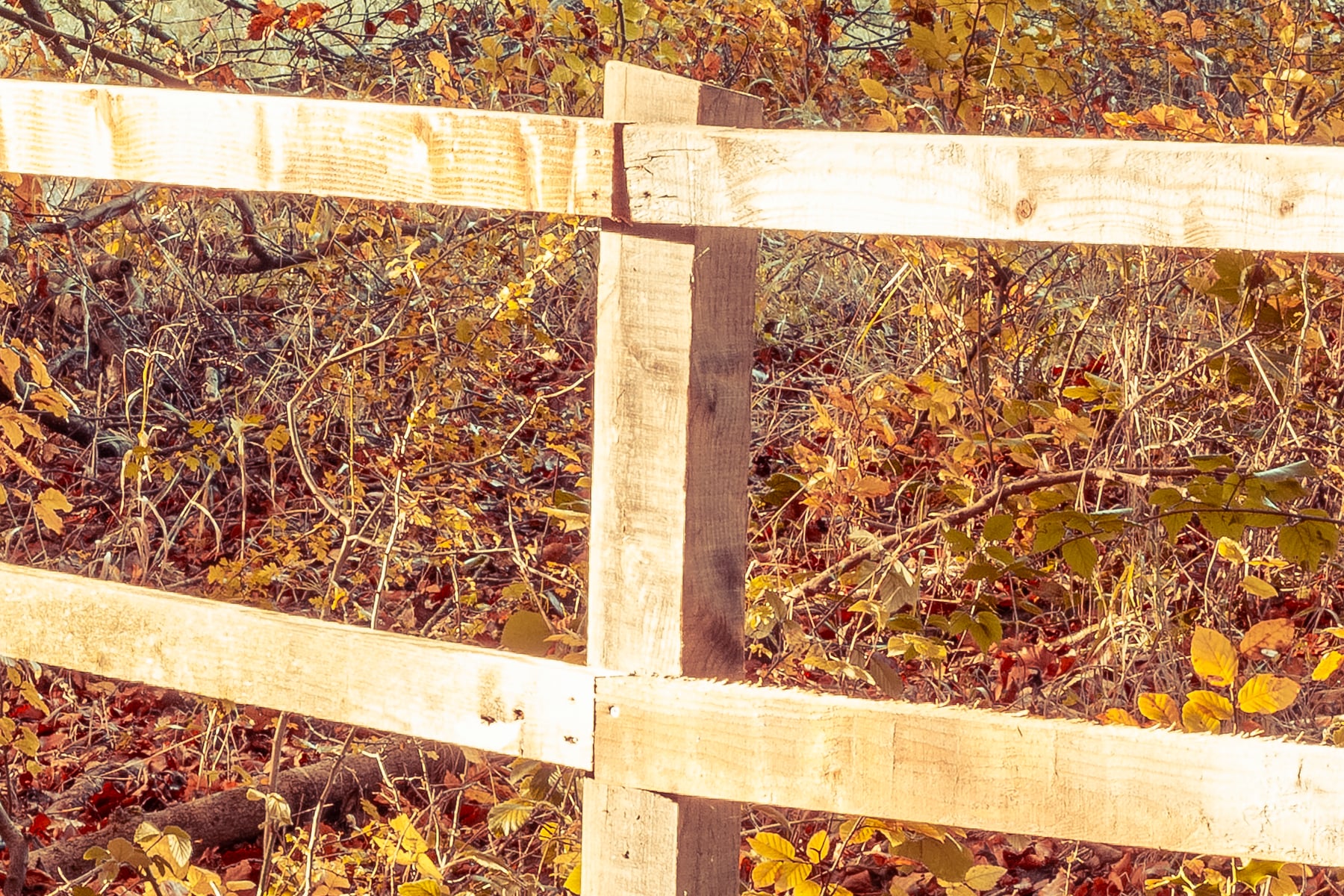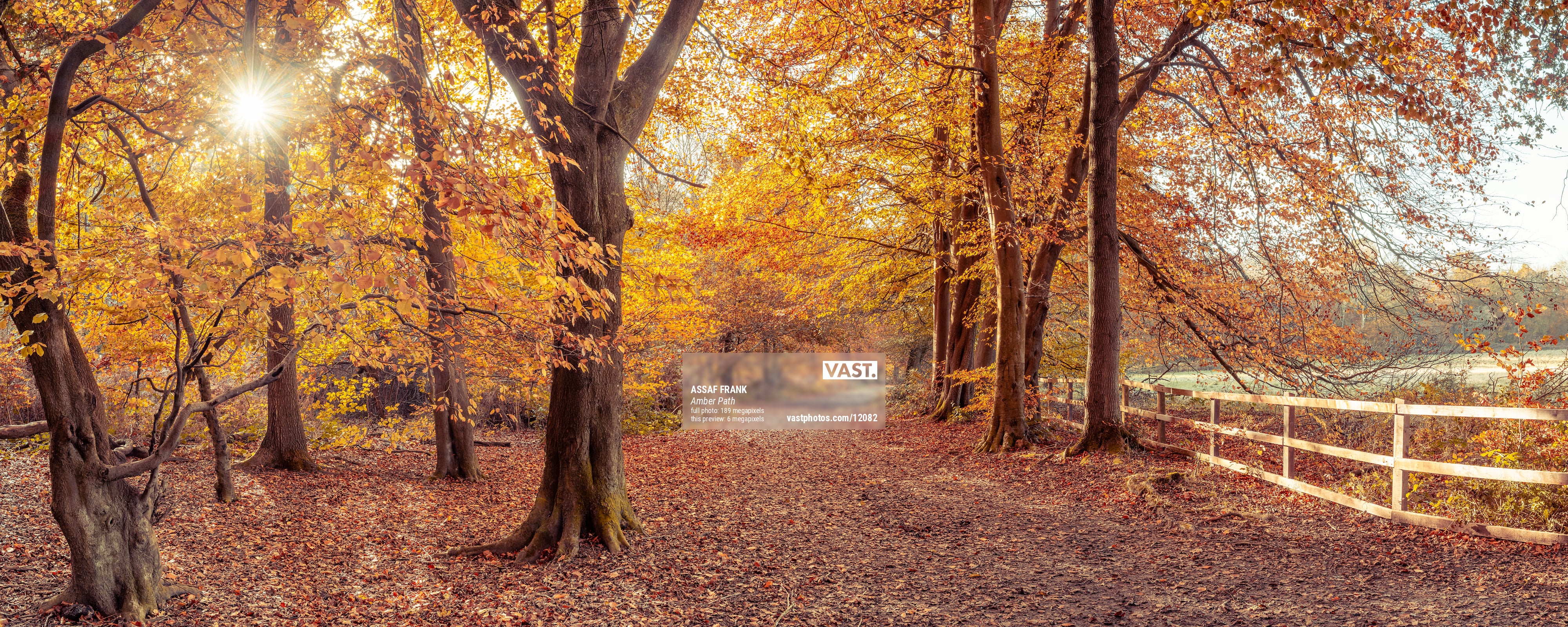 The scene exudes tranquility, as the earthy scent of fallen leaves and the gentle rustling of the trees fill the crisp autumn air. The contrast between the golden foliage and the clear blue sky enhances the visual splendor, making the setting feel almost magical. The wooden fence to the right adds a rustic charm, guiding the viewer’s eye deeper into the inviting landscape. The shadows cast by the towering trees create depth and dimension, adding to the picturesque appeal of this idyllic woodland setting.