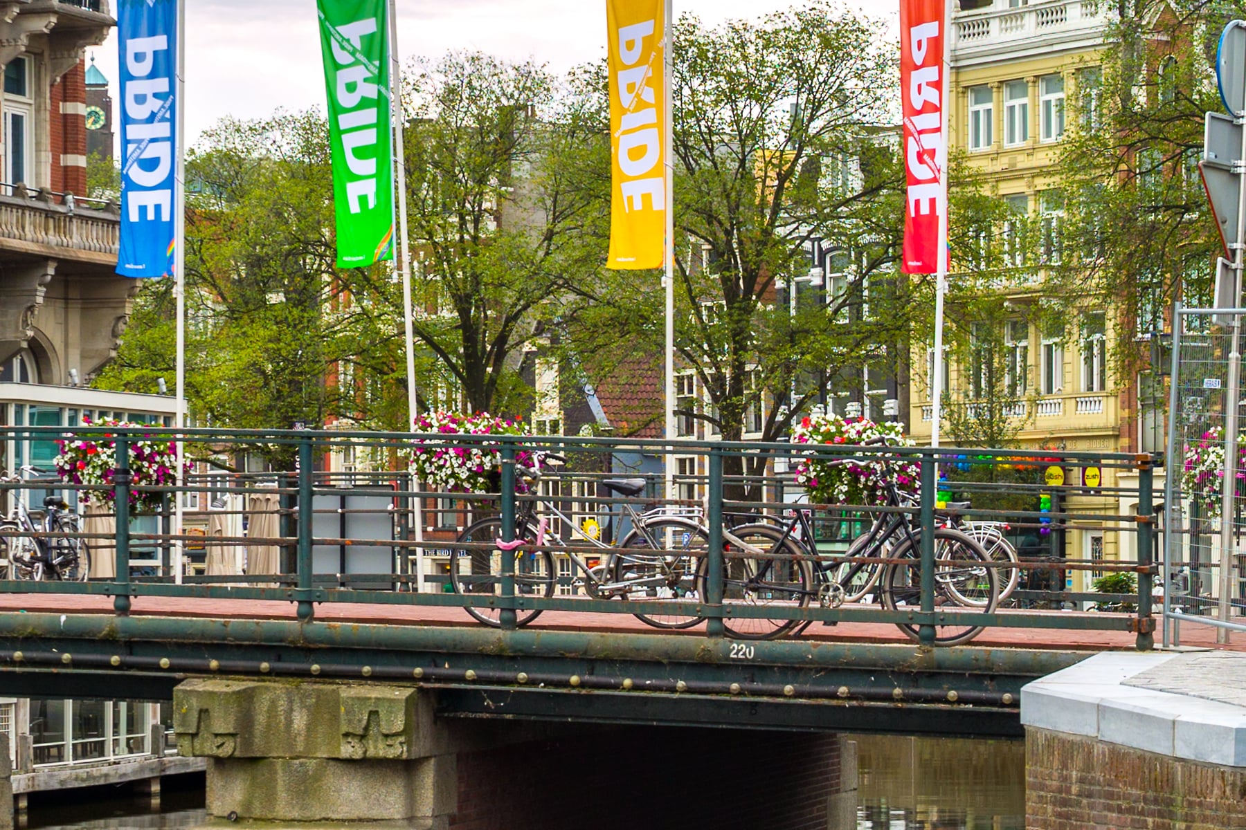 Elegant canal boats are moored along the edge, ready to take visitors on a tour of Amsterdam’s world-famous waterways. The bridge in the background connects the lively streets, showcasing the seamless blend of historic charm and modern city life. The cloudy sky adds texture to the composition, complementing the architectural details and the calm atmosphere.