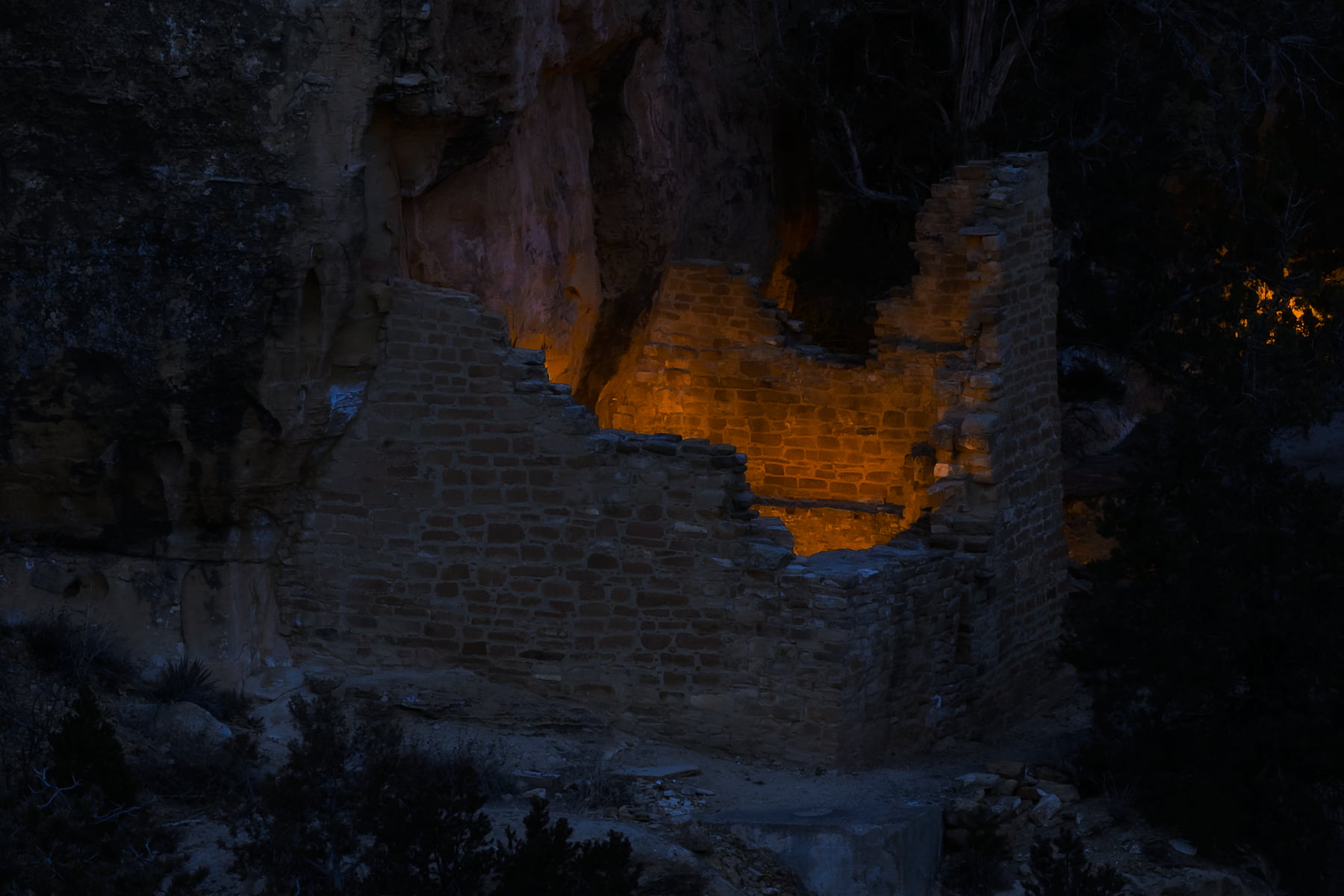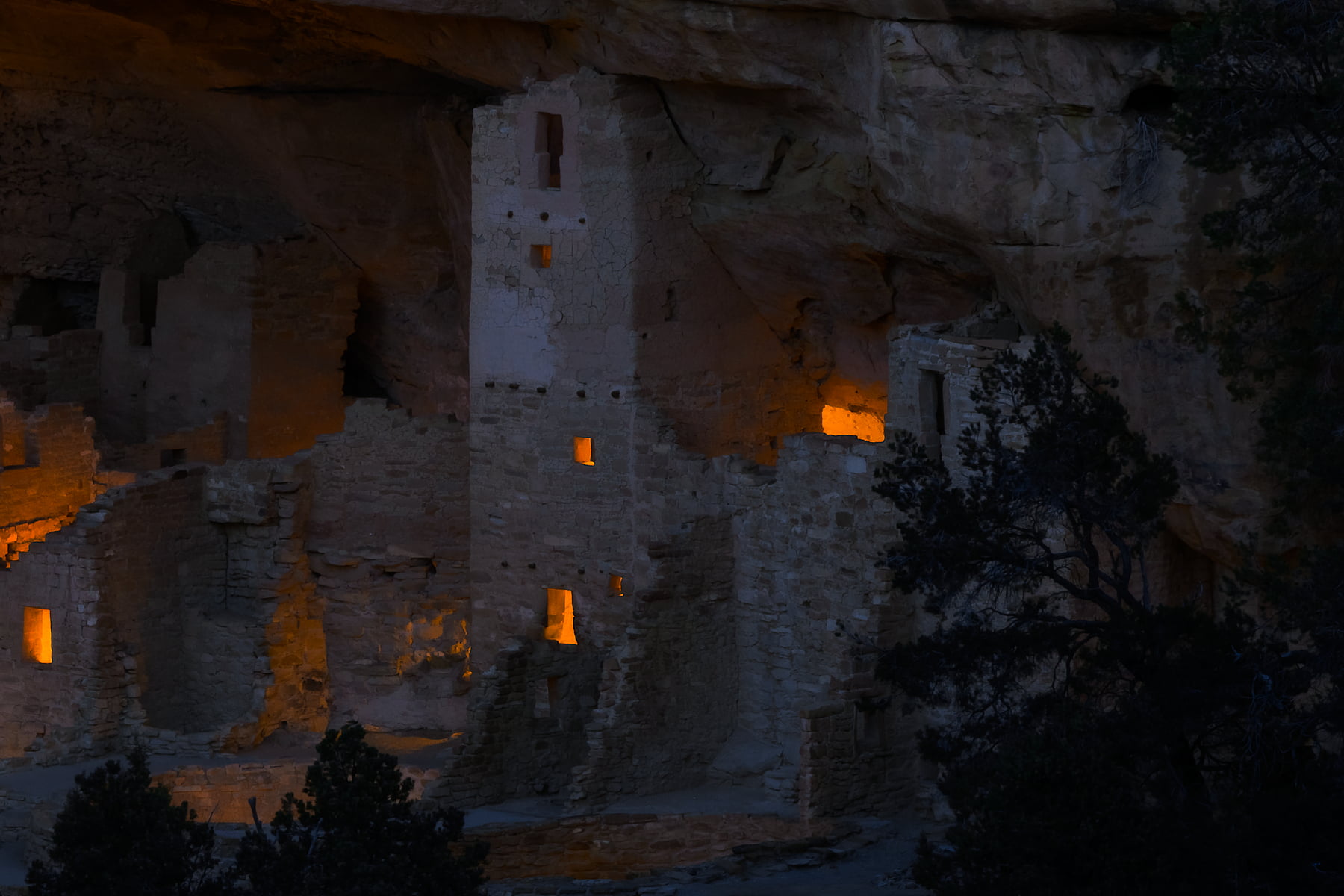 Cliff Palace is the largest cliff dwelling in North America. It was inhabited from 1190 to 1260 and contained 150 rooms and 23 kivas and had a population of approximately 100 people. Here the ruin is illuminated as part of the National Park Service Centennial. Mesa Verde National Park, Colorado.
