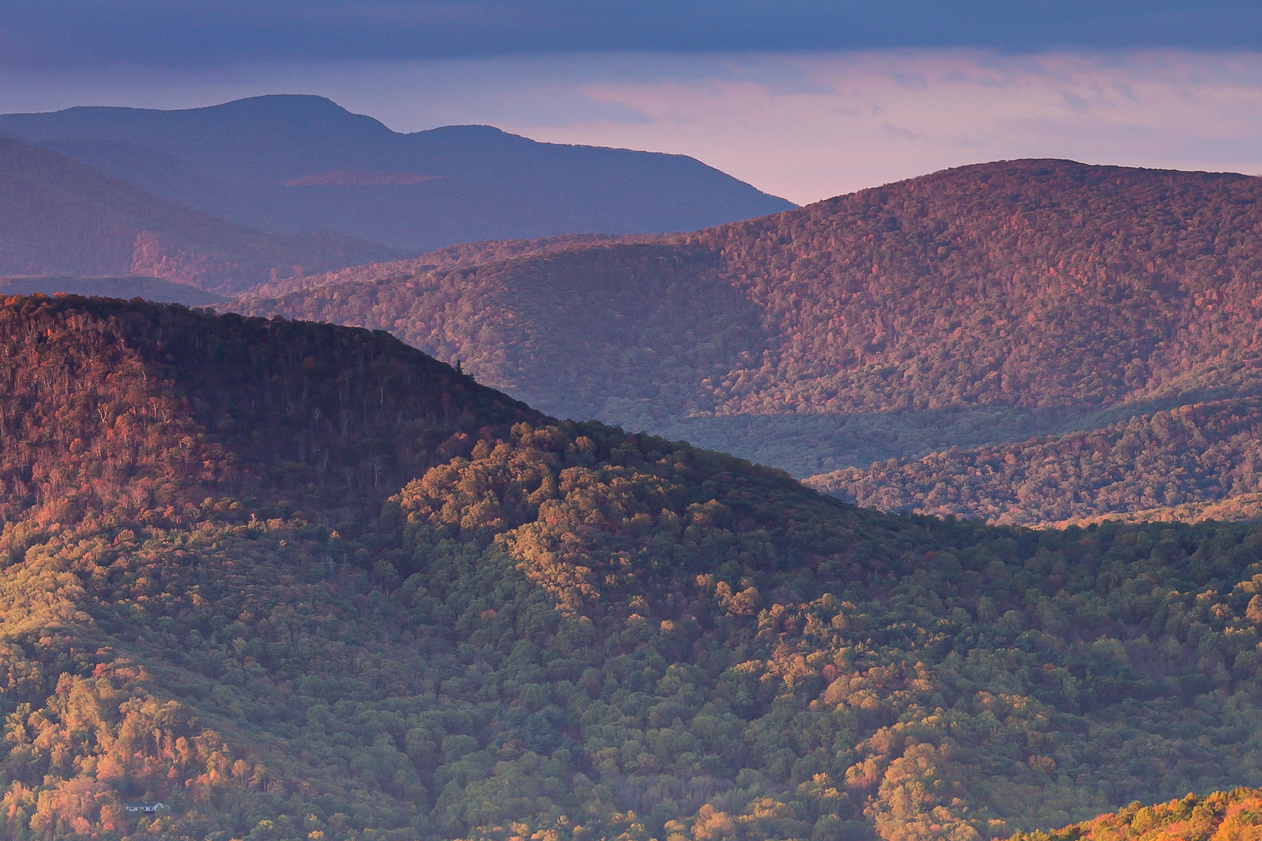 While not a direct easterly view, I knew this spot would boast a great sunrise in October with the fall foliage changing color. About a 1.5-hour drive from Washington, D.C., I left in the early morning hours to arrive by sunrise. Part of the beauty here is the remote location in itself. The downside to that was the incredible difficulty in finding this same spot, even with my bright headlights. I could barely see where the winding road led, and the GPS failed to find any signal. Fortunately, I found my way to this scenic overlook through memory as the sun began to rise and I waited until the sun provided the warmer golden glow on the range to capture this image with the purple hues in the sky and deep orange cast on the trees in the ridge this cool autumn morning.