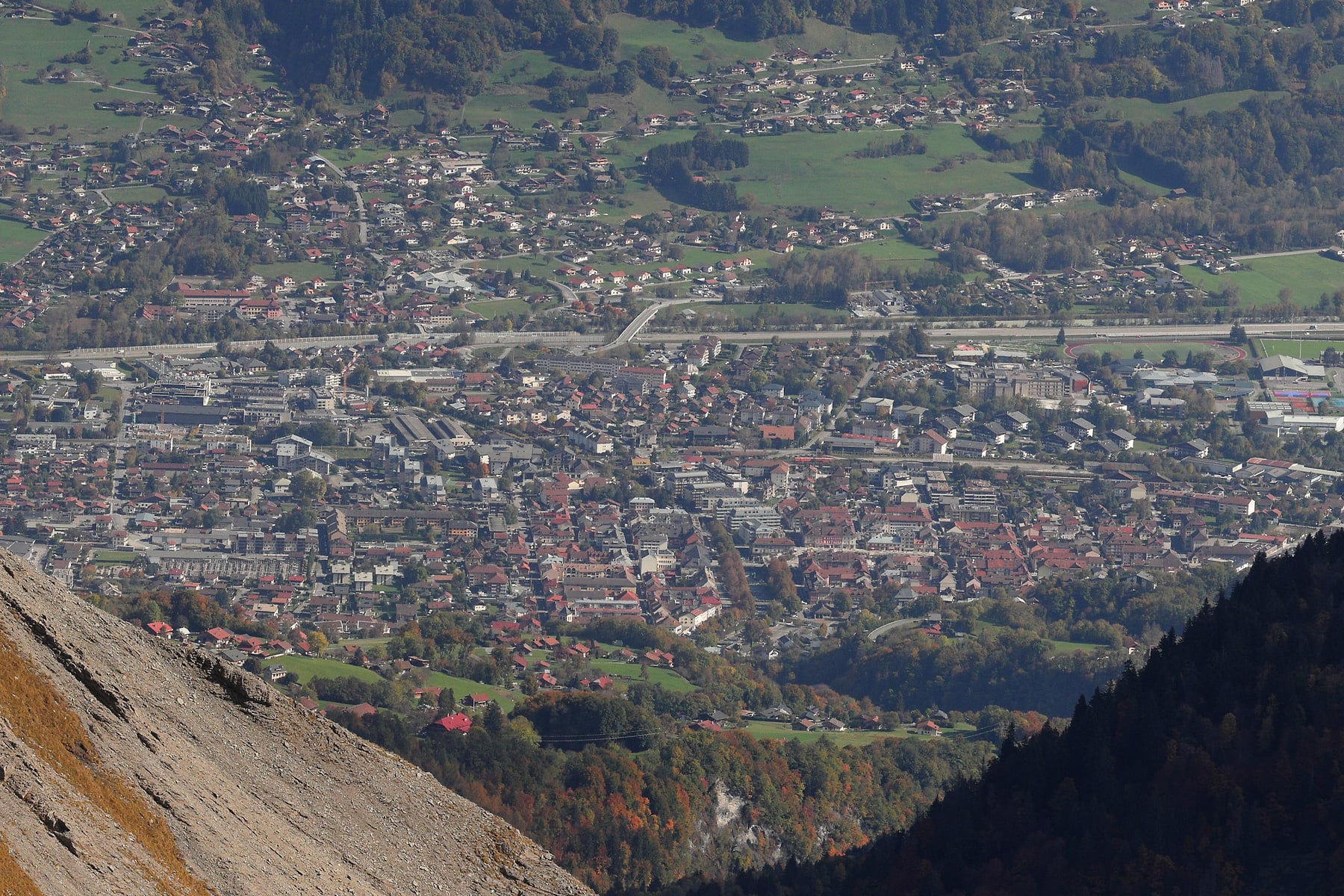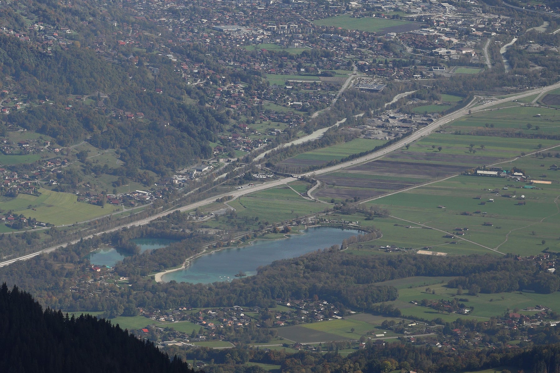 To the right, the sharp silhouette of the Pointe Percée, the highest peak of the Aravis, rises dramatically. The contrasts between the sculpted rock formations, the soft curves of the valley floor, and the distant urban landscape below add a striking sense of depth and scale to the scene.