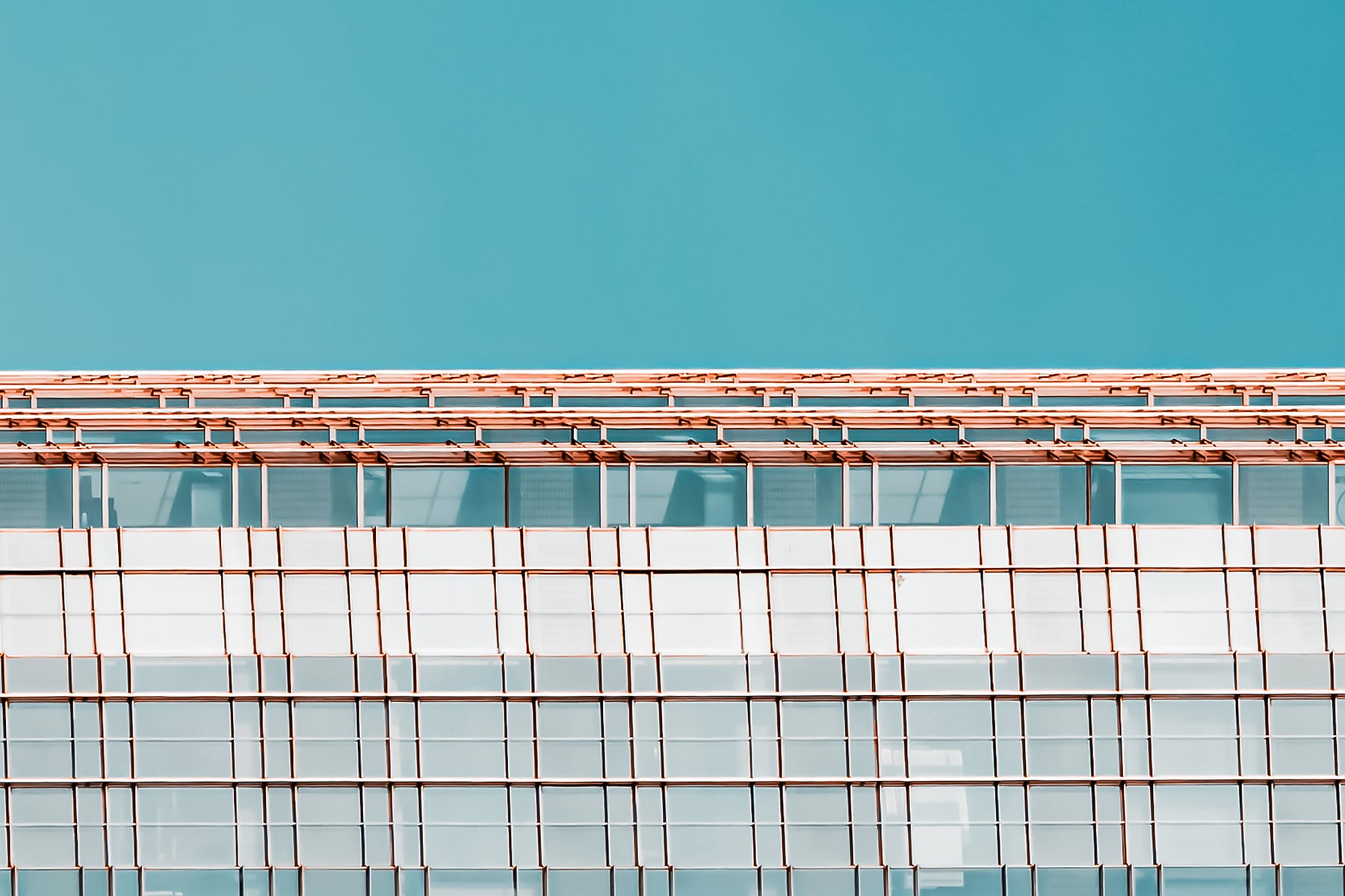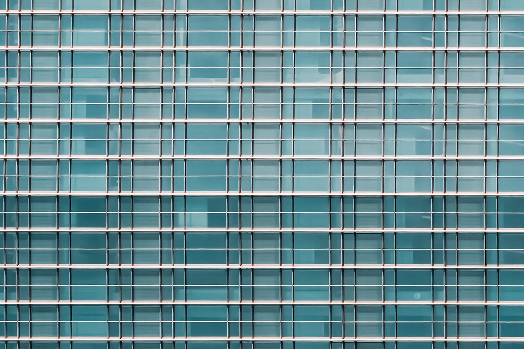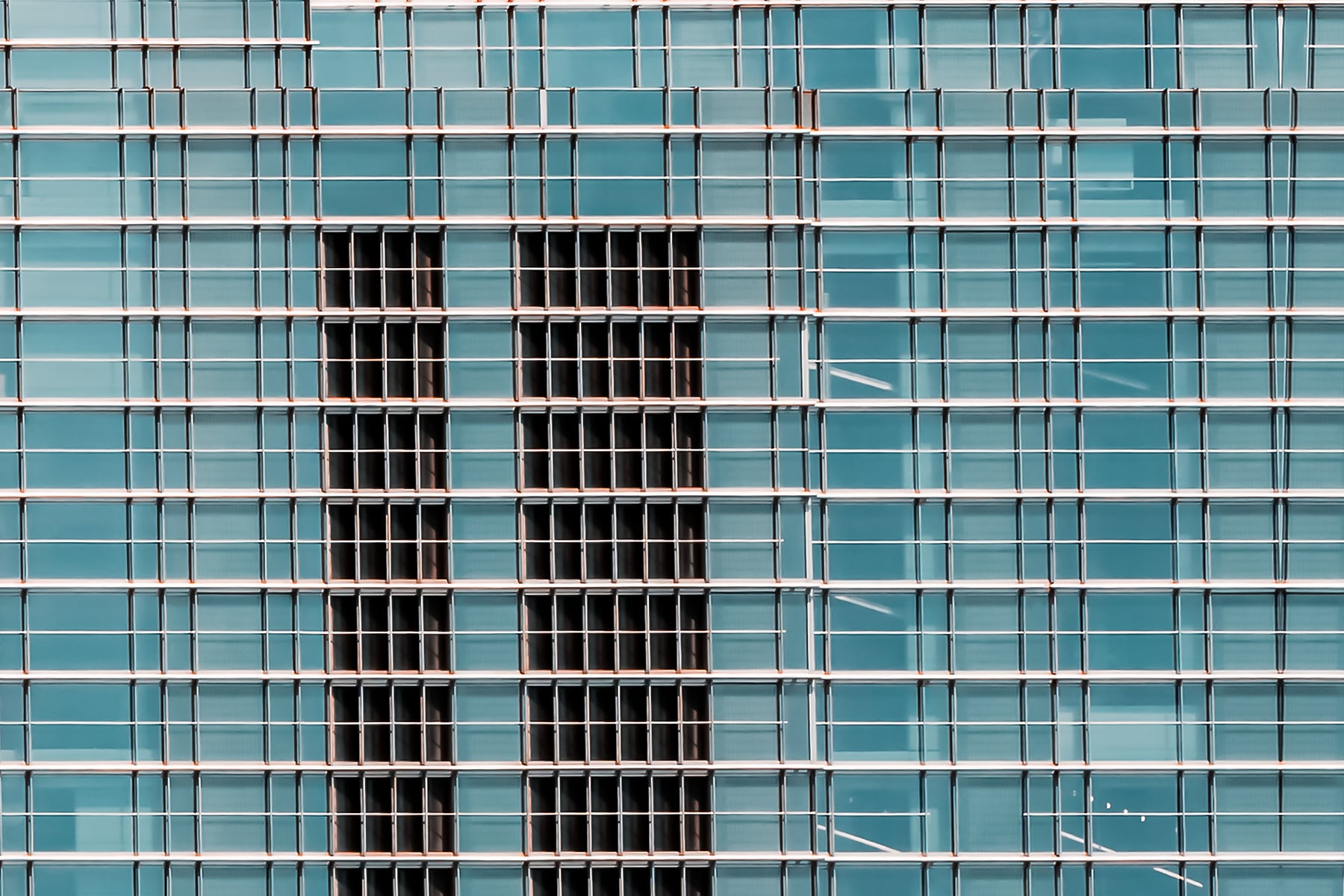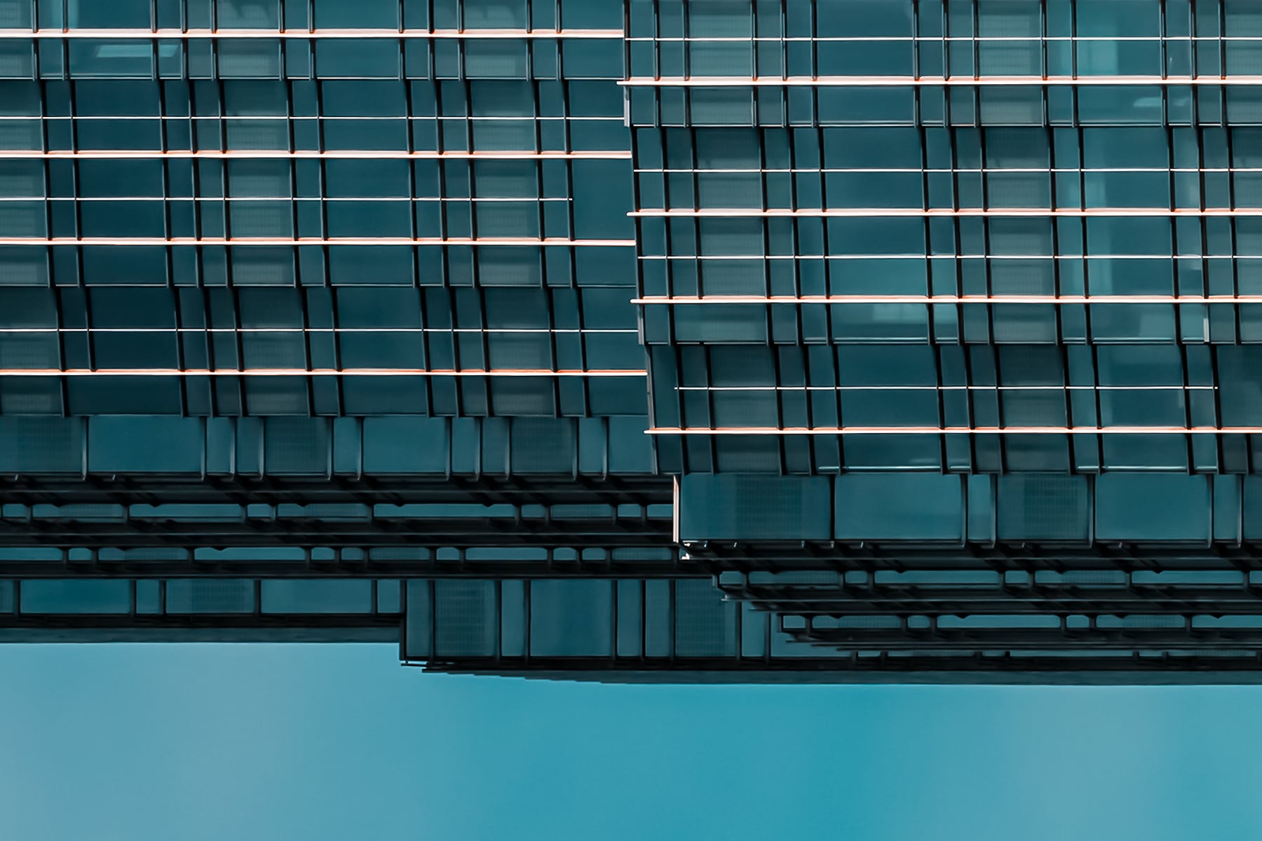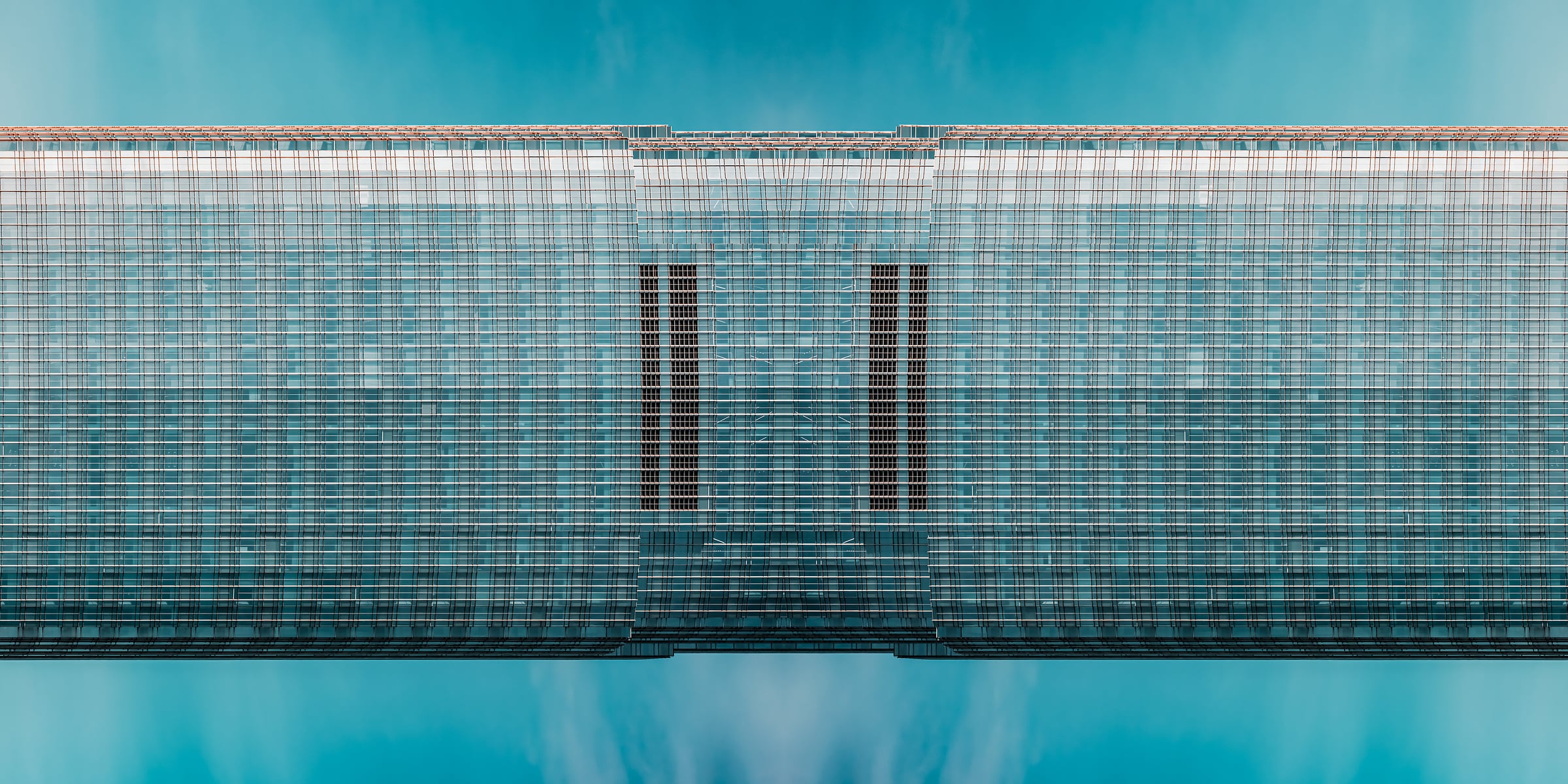 This striking architectural abstract photograph presents a mesmerizing study in symmetry, repetition, and modern design. The building's glass and steel facade becomes almost surreal through the mirroring effect, transforming the structure into a futuristic monolith suspended in a dreamlike teal sky. Grid lines run with machine-like precision across the surface, creating a rhythm that draws the eye toward the center, where vertical dark panels subtly anchor the composition. The clarity and minimalism of the color palette, dominated by cool blues and silvers, enhance the sense of calm order and sophistication. This image blurs the line between reality and abstraction, turning architecture into art.