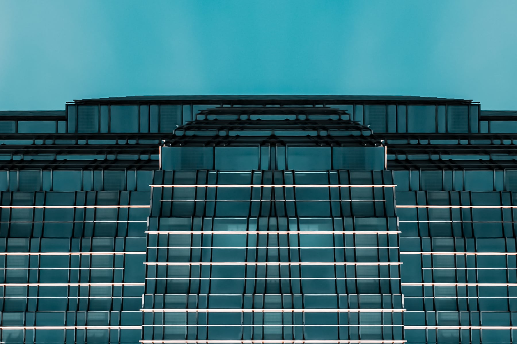 In this captivating architectural abstract, the mirrored composition transforms a modern building into an almost alien spacecraft hovering in a pristine teal sky. The precision of the horizontal and vertical lines creates a hypnotic grid that conveys both complexity and harmony. The symmetrical framing enhances the illusion, giving the structure a surreal, futuristic quality—its form reminiscent of a massive vessel or high-tech monolith. Subtle reflections and a soft gradient in the sky deepen the image’s visual impact, making it not just a photograph but a piece of conceptual art that challenges the viewer’s perception of space, structure, and design.