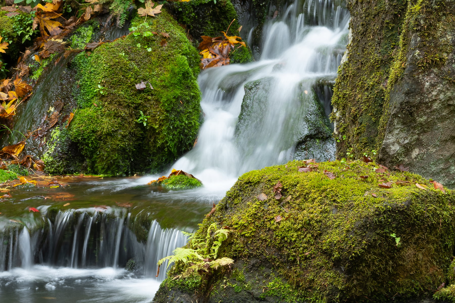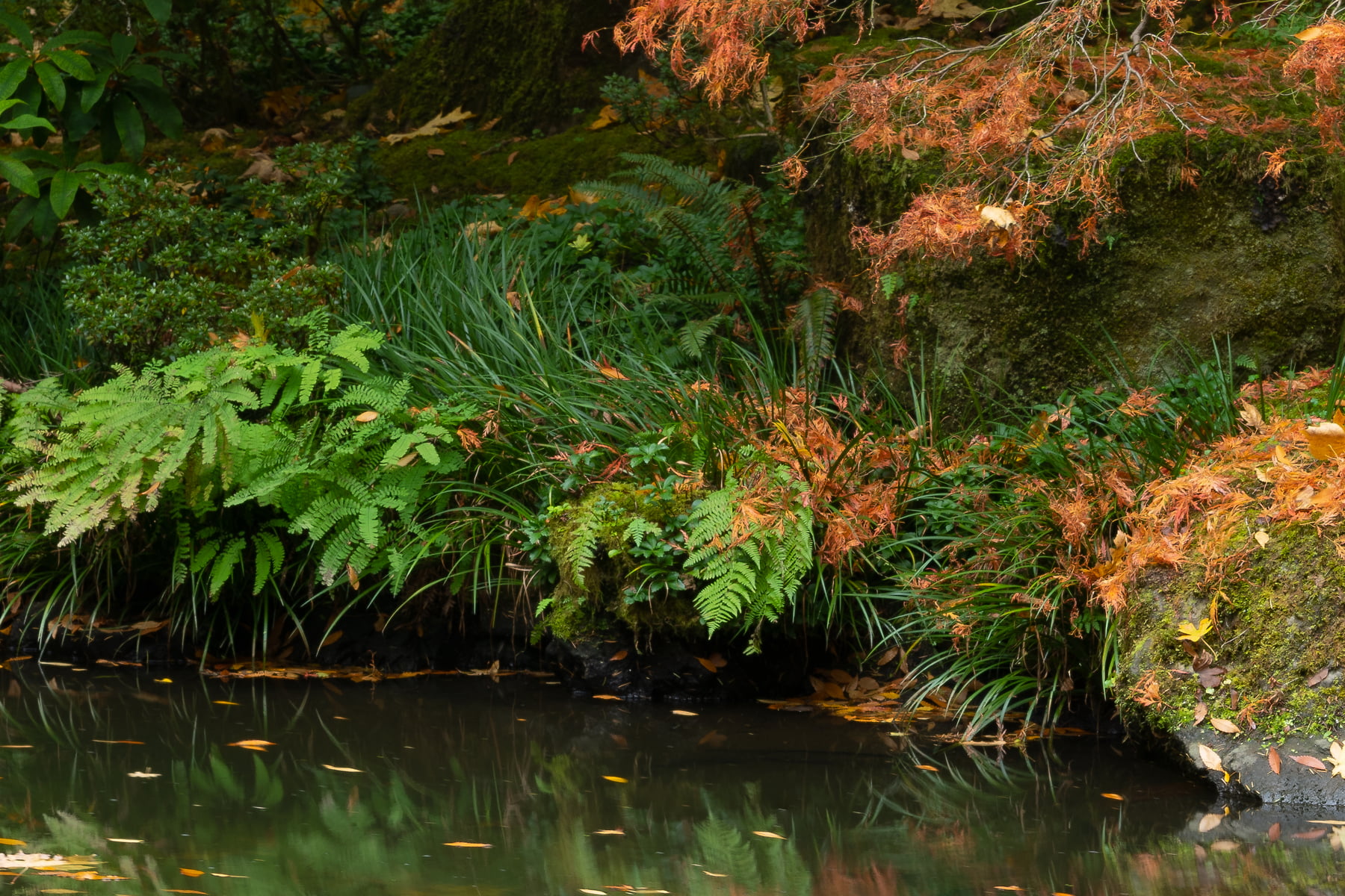 Japanese Gardens by design create a tranquil balanced sense of place. The brilliant Fall colors of the Japanese Maple trees and the water features create for me a feeling of quiet joy where I can sit for endless hours and be peaceful