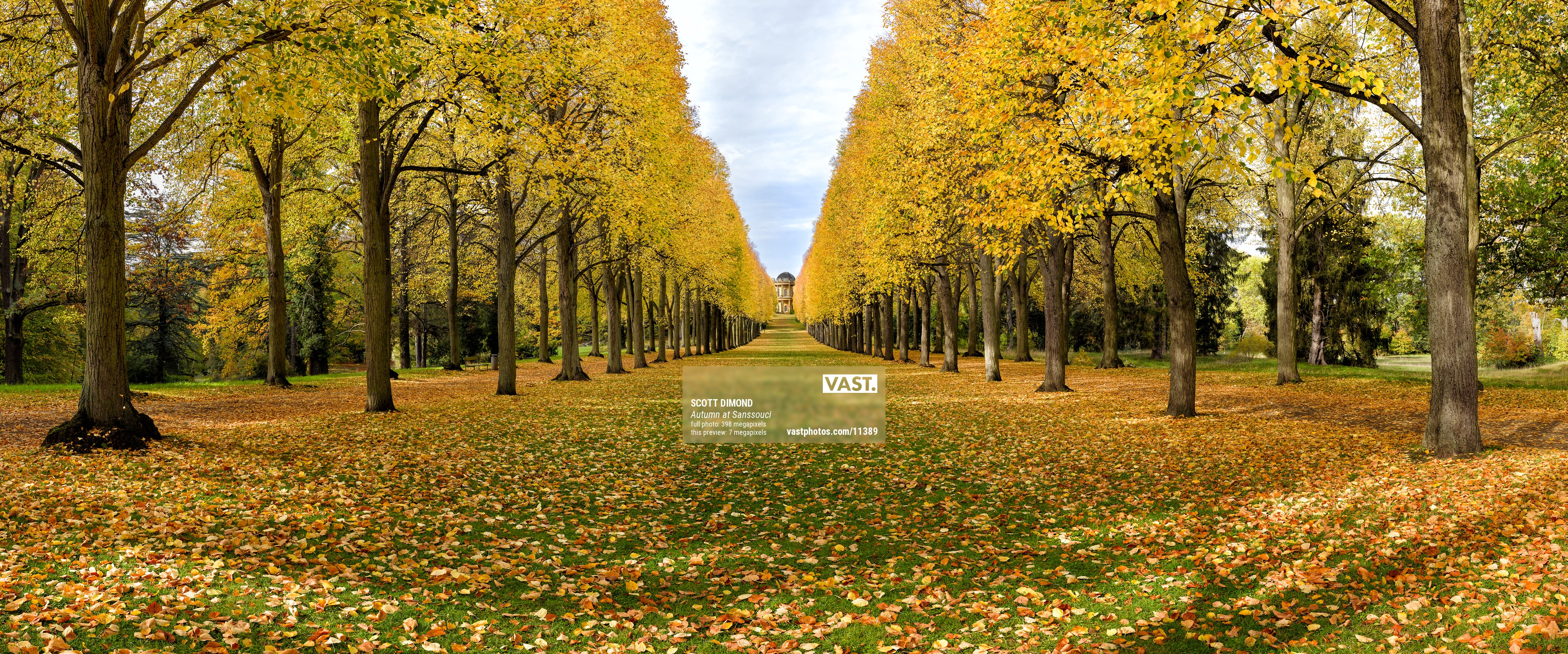 Sanssouci is a historical palace and park in Potsdam, near Berlin, Germany. Built by Prussian King Frederick the Great as his summer palace, it is often thought of as the German rival to Versailles. Besides the main palace, Schloss Sanssouci, the area contains many other palaces. One such palace, the Orangery Palace, is separated from the Belvedere Klausberg by a long tree-lined promenade. It was here, on a fine October day, that I found myself standing and admiring two 500-meter (550-yard) long rows of trees, their bright yellow leaves glowing in the sunshine with the Belvedere Klausberg standing tall between them in the distance. It was also here that I decided to unpack my photo gear and create a wonderful VAST image of the scene.