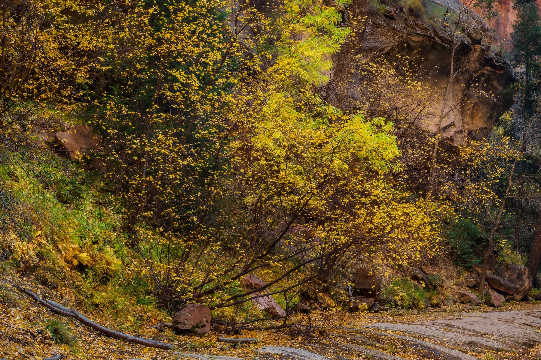 Past blue-green pools filled with yellow leaves the Left Fork of North Creek flows through the Subway and on to several waterfalls in this remote part of Zion National Park, Utah. An incredible and special place that takes a bit of effort to reach!