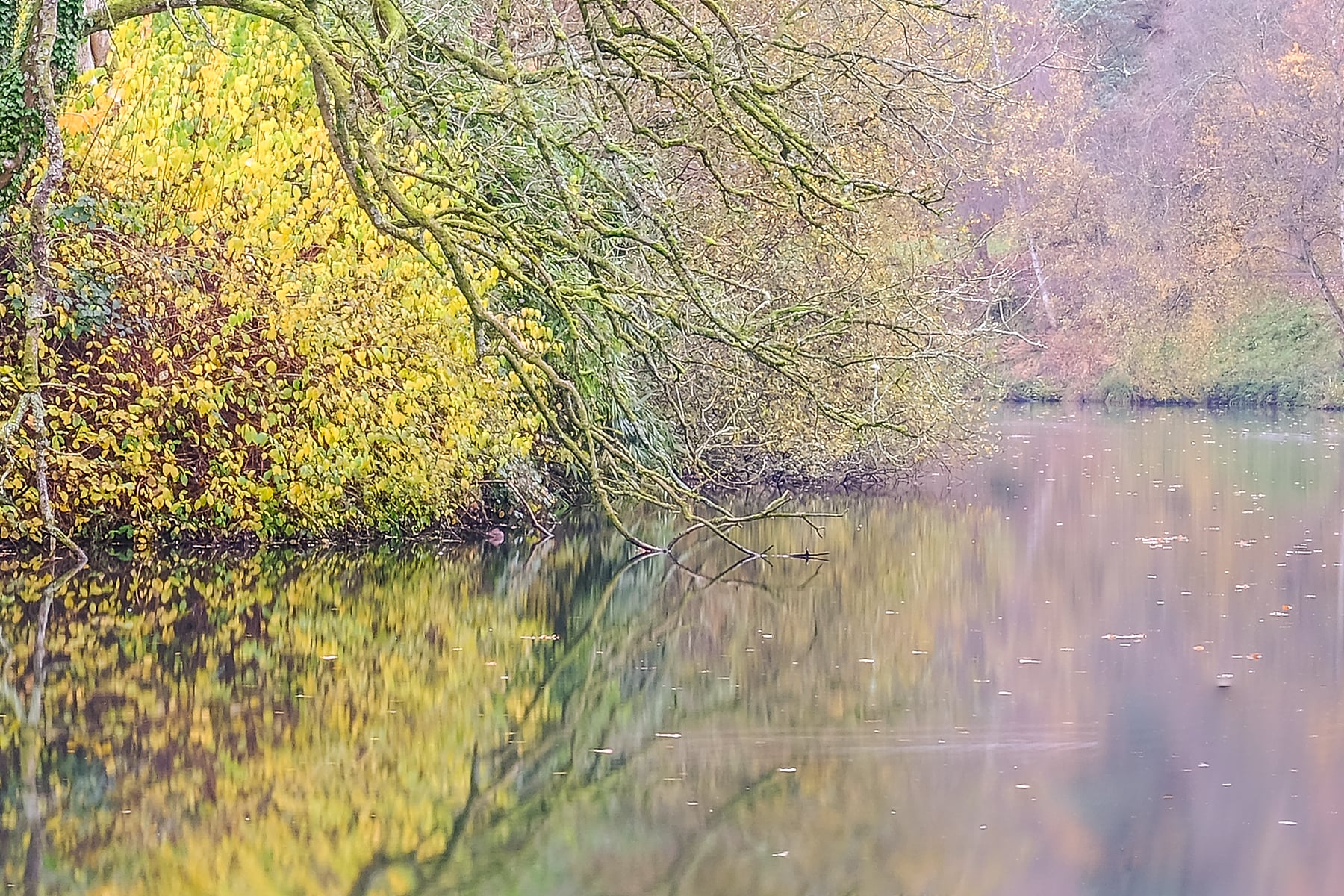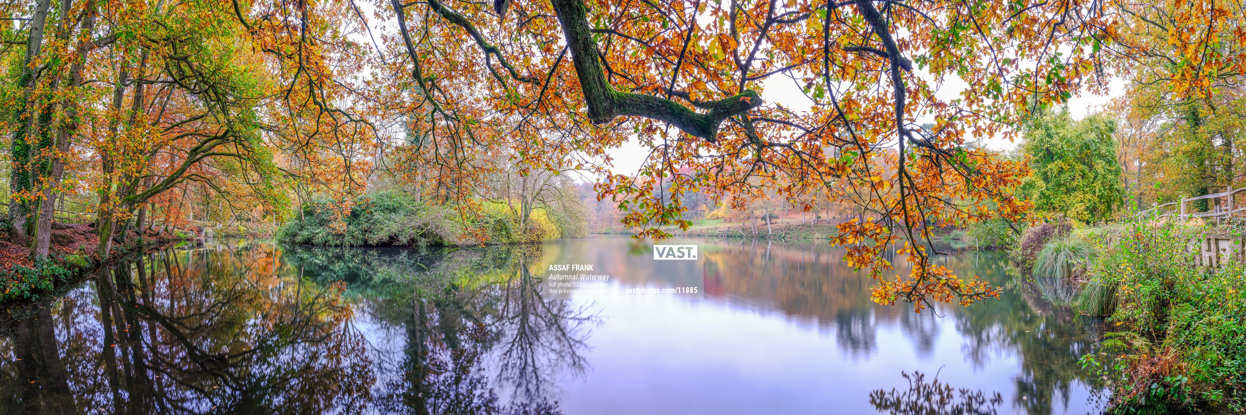 This breathtaking image captures a tranquil canal winding through an autumn forest, showcasing the beauty of the changing seasons. The overhanging branches, adorned with leaves in vibrant hues of orange, yellow, and red, frame the scene perfectly, their reflections shimmering on the still, glass-like surface of the water. The contrast between the colourful foliage and the calm blue water creates a visually striking composition, drawing the viewer into this serene natural setting.