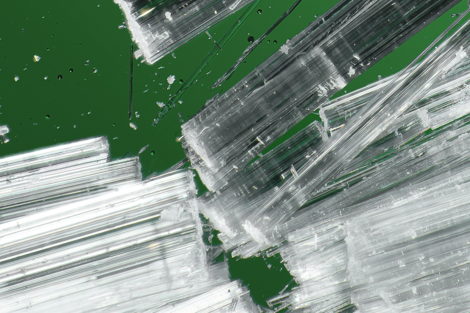 Selenite (Latin for "moonstone") has unique molecular properties that produce elegant crystalline structures and brilliant refractive properties. When combined with Mantis and Piech's meticulously constructed setup of lights, colored filters, microscopes, and cameras, these properties produce stunning imagery that elevates the mood and captures the imagination.