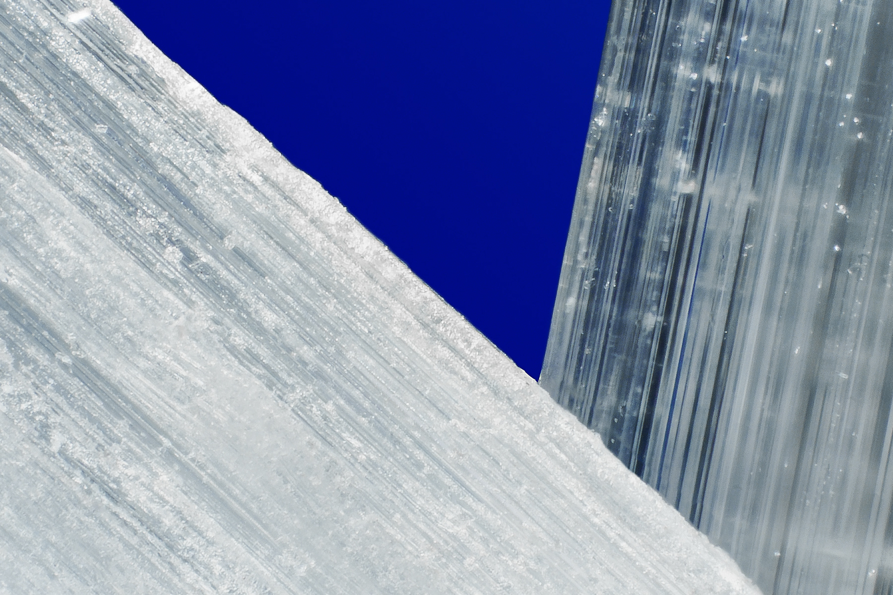 Selenite (Latin for "moonstone") has unique molecular properties that produce elegant crystalline structures and brilliant refractive properties. When combined with Mantis and Piech's meticulously constructed setup of lights, colored filters, microscopes, and cameras, these properties produce stunning imagery that elevates the mood and captures the imagination.