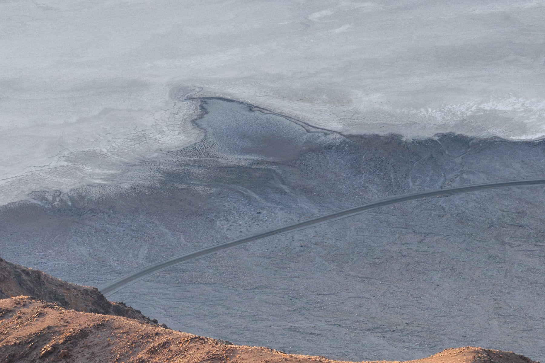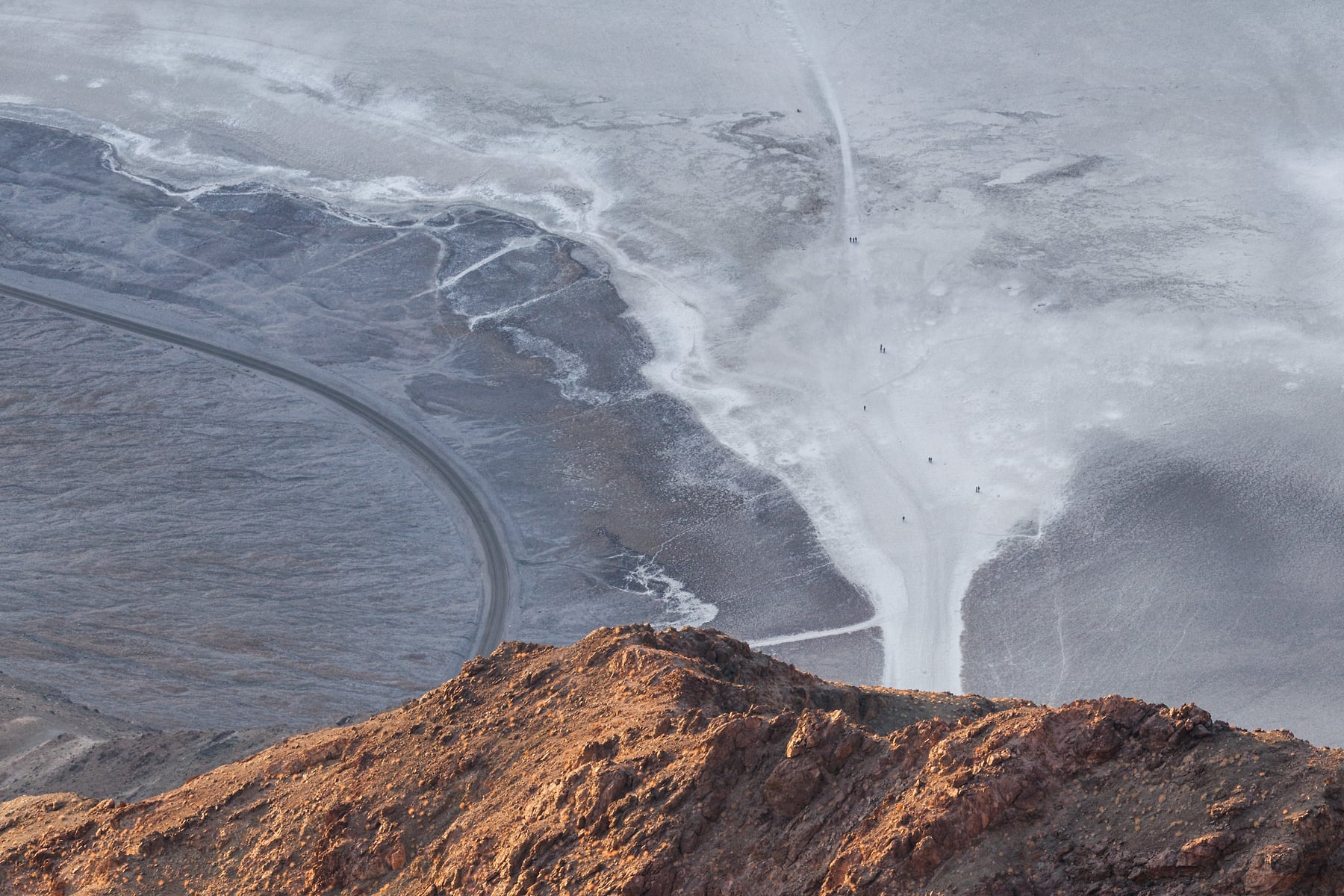 Instead of capturing the grand expanse traditionally associated with Dante’s View, this image takes a more intimate approach. Hiking along the path to find the perfect spot, I positioned my camera to highlight a small section of the rugged mountain foreground, contrasting with the vast, intricate salt flats of Badwater Basin below. The sinuous lines of the road and the tiny silhouettes of people walking on the flats emphasize the sheer scale of this unique terrain.