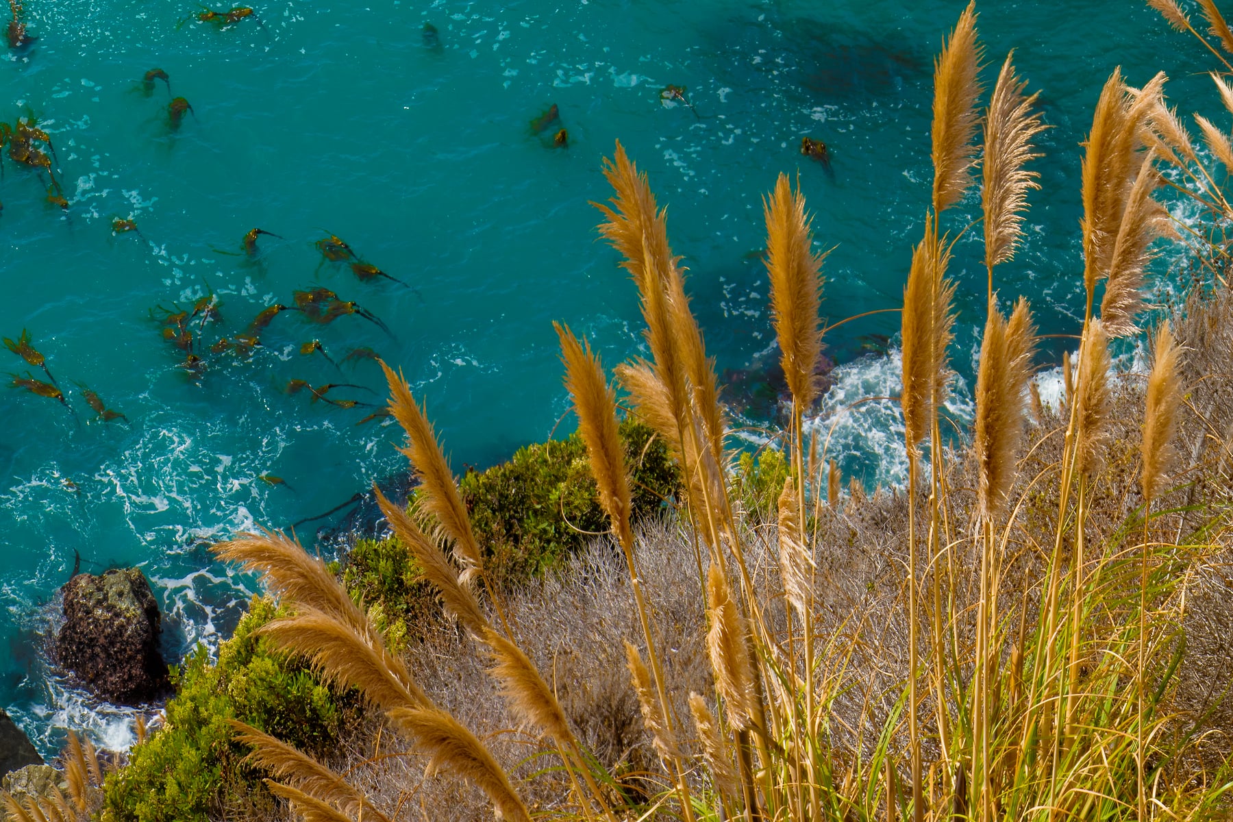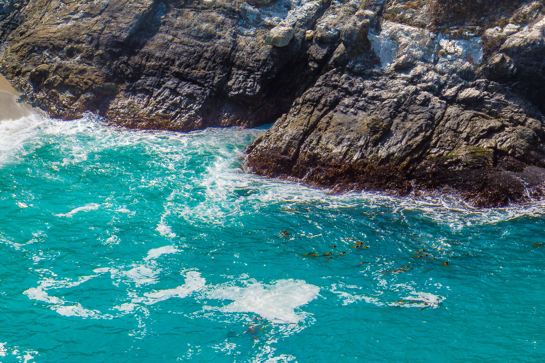 This vantage of McWay Falls in Big Sur places the viewer in very close proximity to the beautiful cove and waterfall in a way that most images of this iconic location do not. The exquisite aqua-colored water that crests in a beautiful foam lined wave upon the shore is intensified by the abundant late-morning sunlight.
