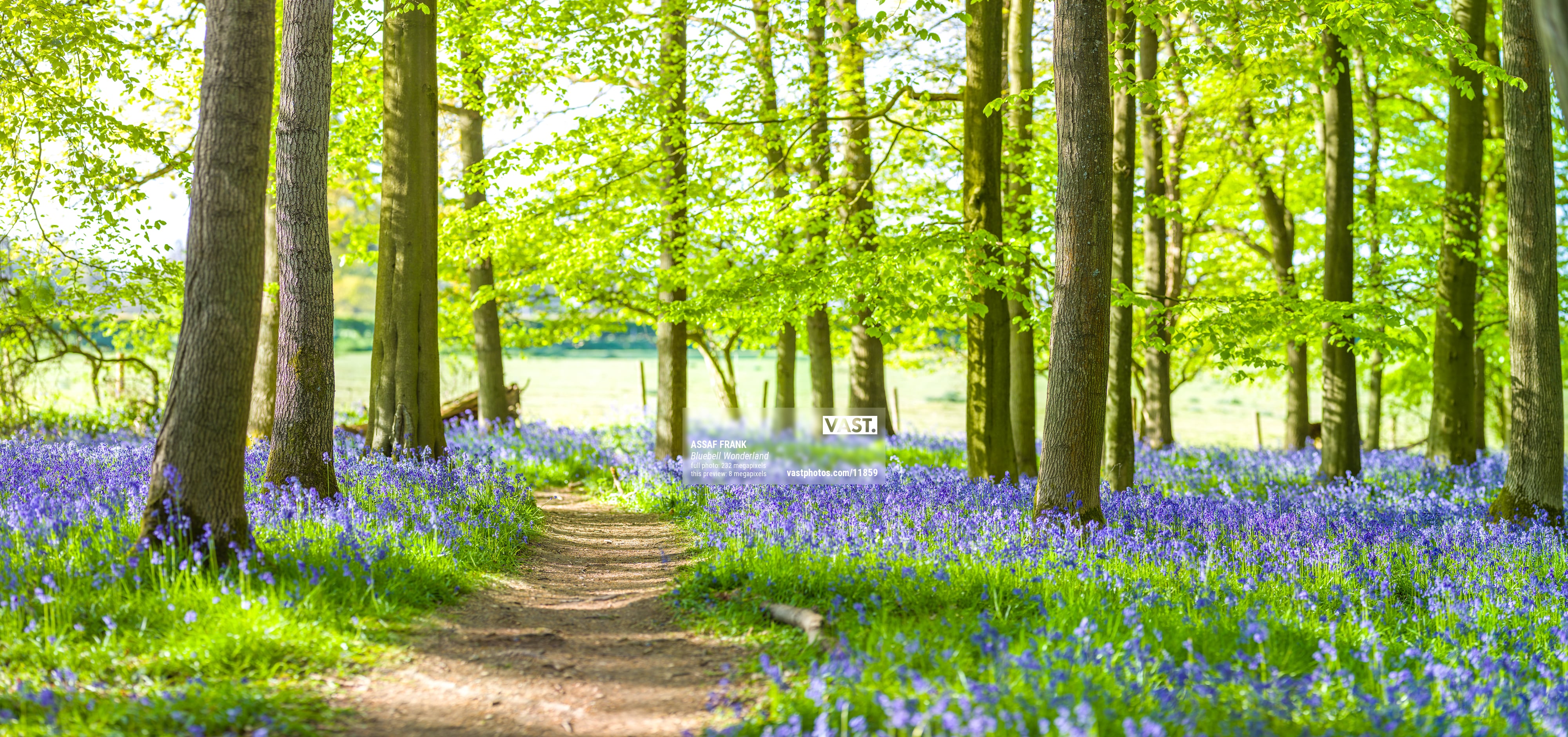 This enchanting photograph captures the breathtaking beauty of a bluebell forest with a winding pathway in Dockey Wood, Berkhamsted, during spring. The vibrant bluebells carpet the forest floor, creating a stunning contrast with the fresh green leaves of the trees. The pathway meanders gently through the forest, inviting viewers to imagine a serene walk amidst the blooming flowers and lush foliage.