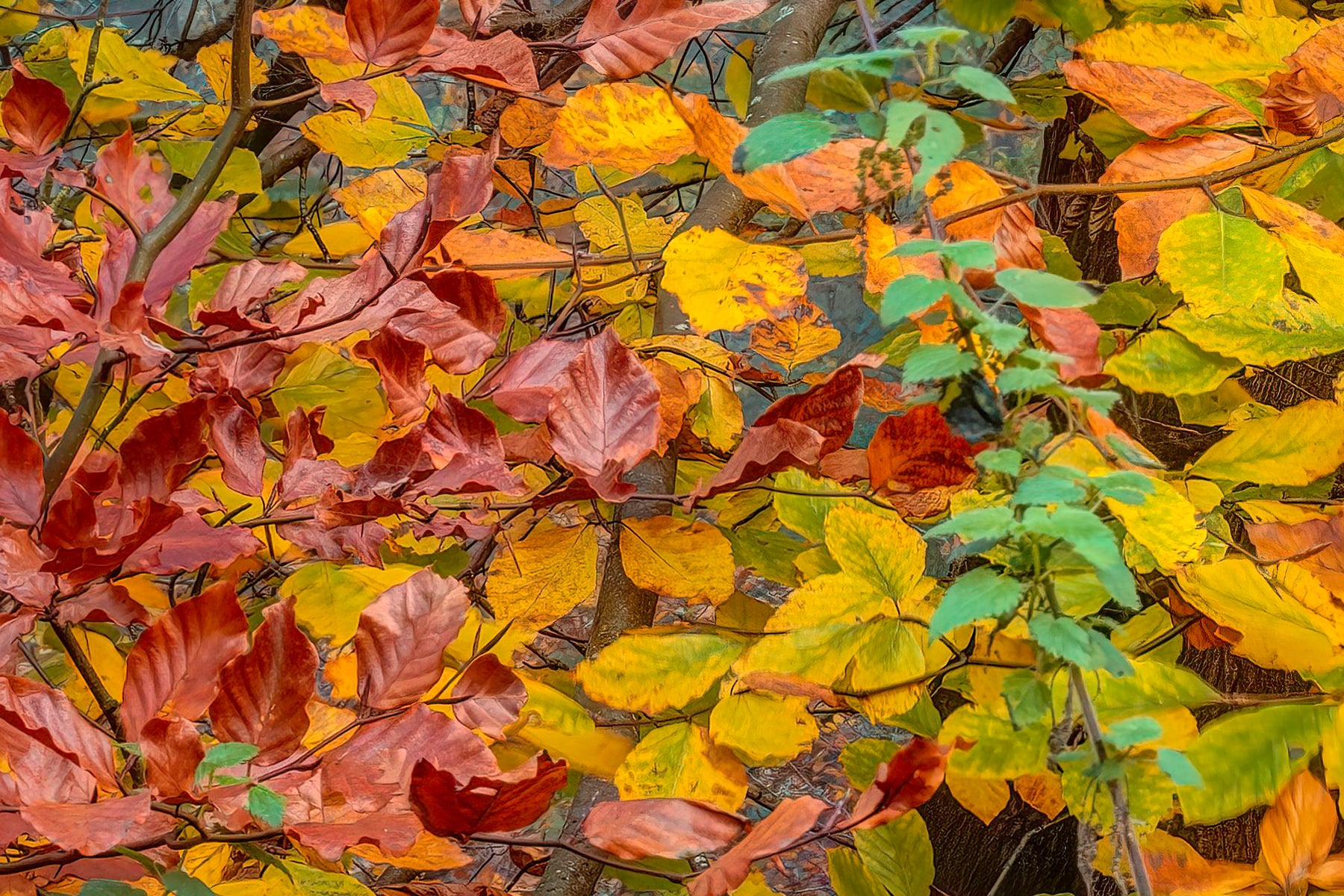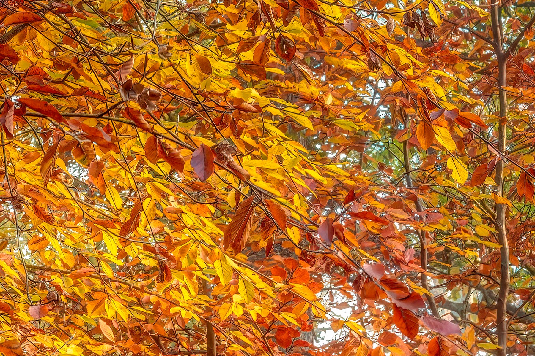 A charming wooden bridge nestled in the heart of an autumn forest creates a picturesque and inviting scene. The canopy above is a stunning blend of golden yellows, deep oranges, and fiery reds, forming a natural tunnel of vibrant foliage. Fallen leaves gently carpet the pathway leading to the bridge, enhancing the warmth and richness of the season. The soft, diffused light filters through the trees, casting a magical glow on the rustic wooden railings, while the forest beyond fades into a peaceful mist, adding depth and intrigue to the setting.