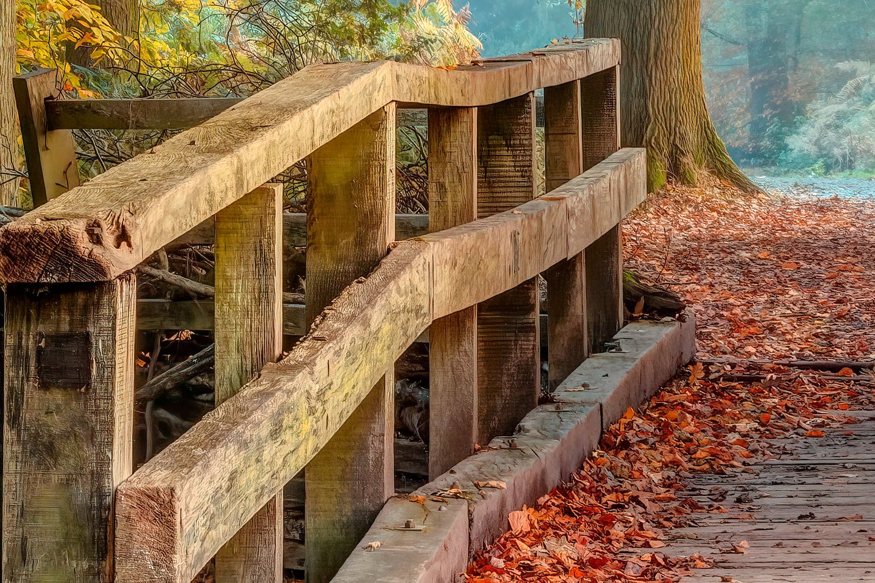 As the viewer’s eye follows the bridge, there is a strong sense of tranquility and escape, as if stepping into an enchanted woodland. The aged wood of the bridge blends harmoniously with the surrounding nature, suggesting years of footsteps crossing from one side to another. The soft rustling of leaves and the distant chirping of birds complete the sensory experience, making it easy to imagine the cool, crisp air and the earthy aroma of autumn.
