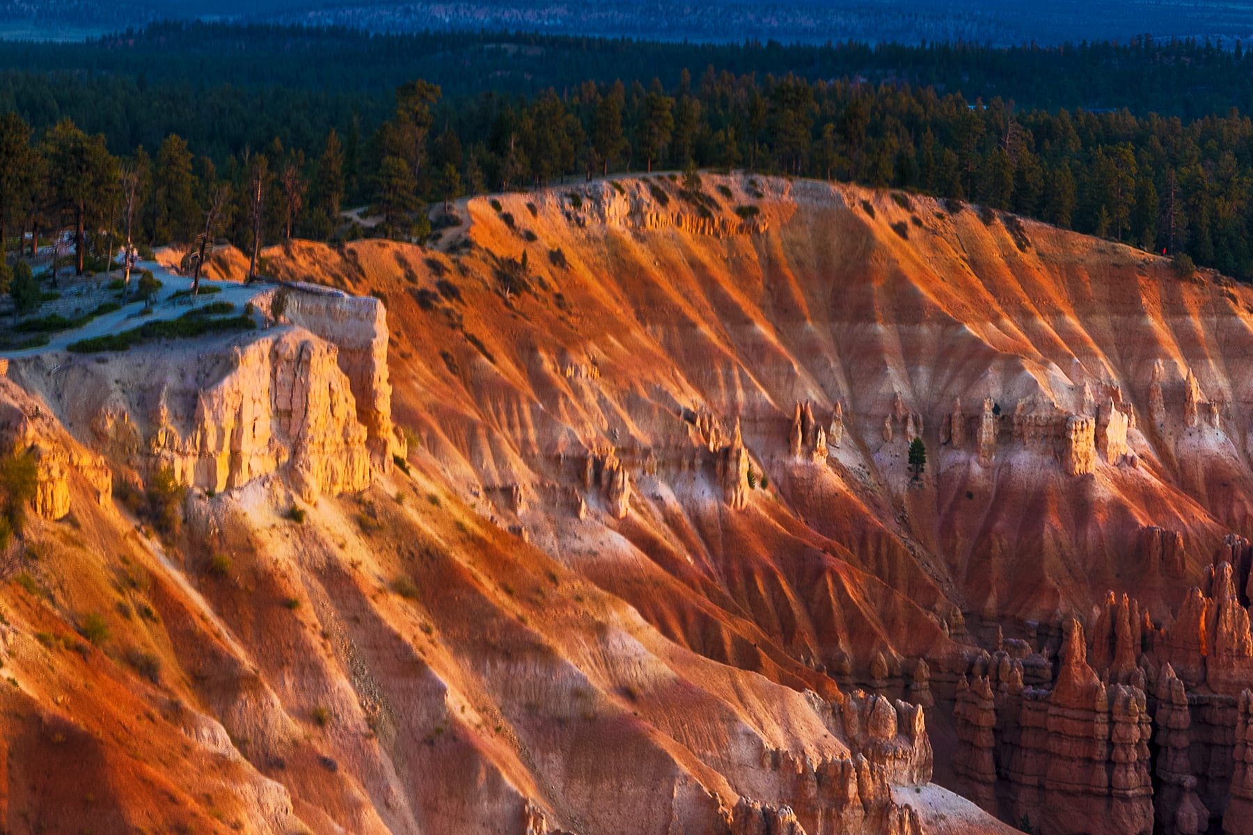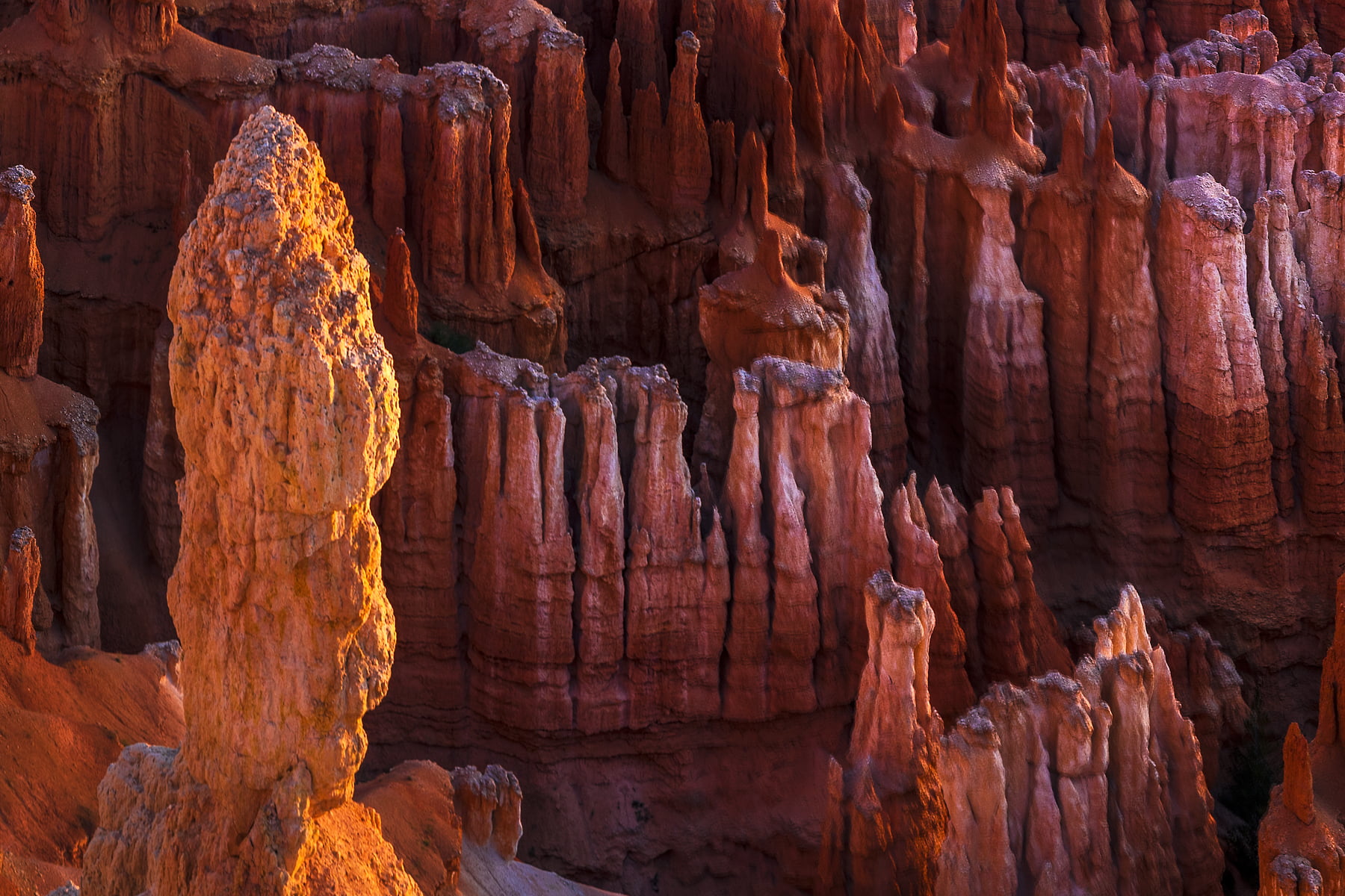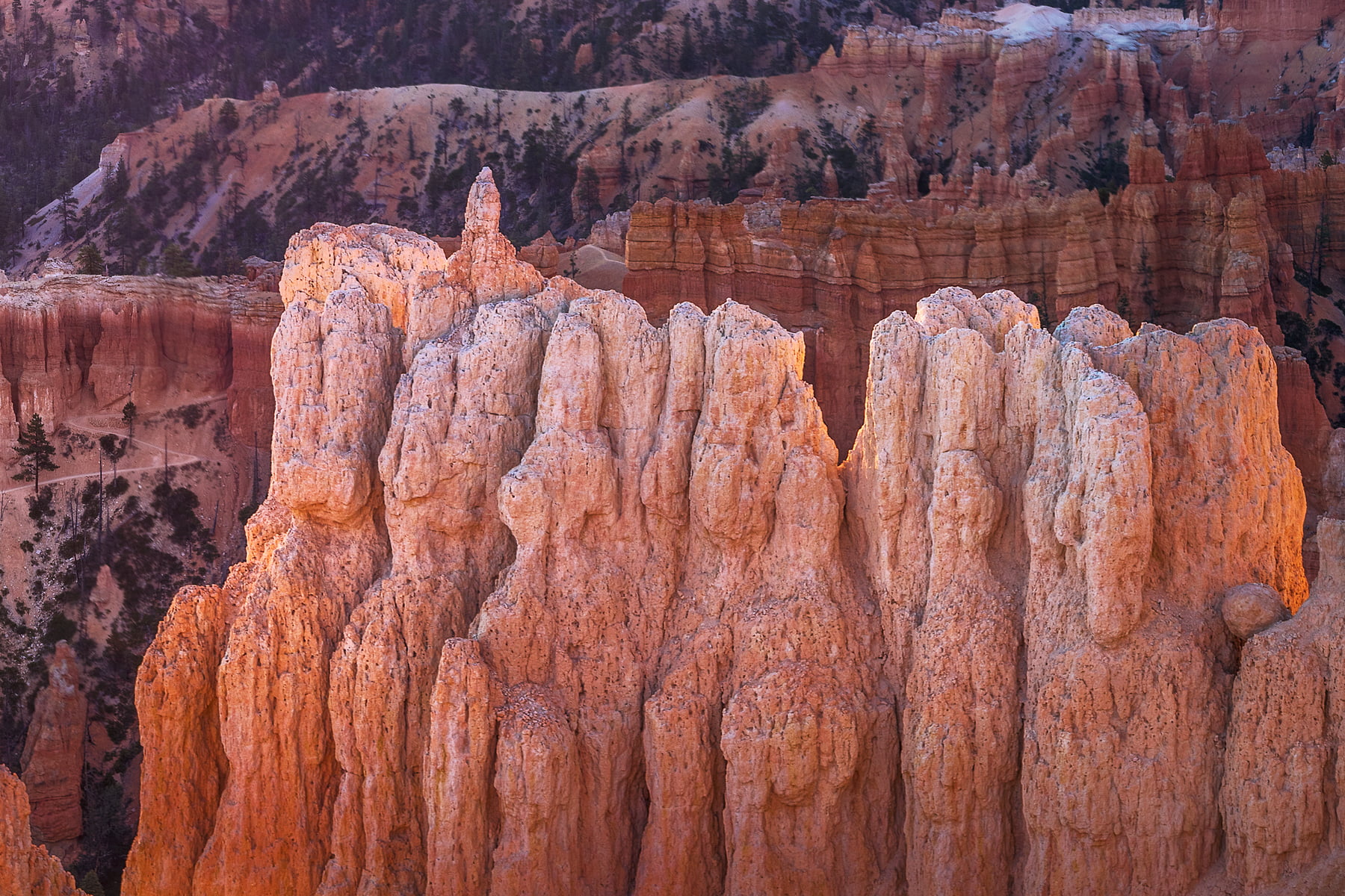 This is Bryce Canyon at sunrise. With the sun just peeking up on the horizon, the canyon is still relatively dark, as the walls begin to light up.