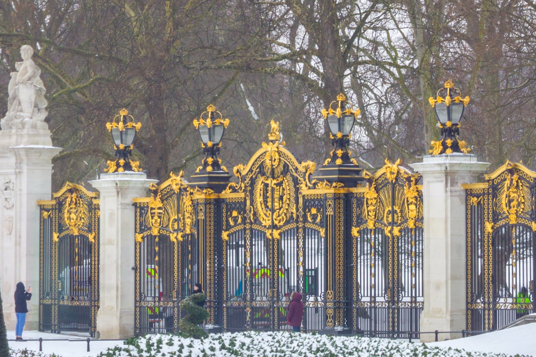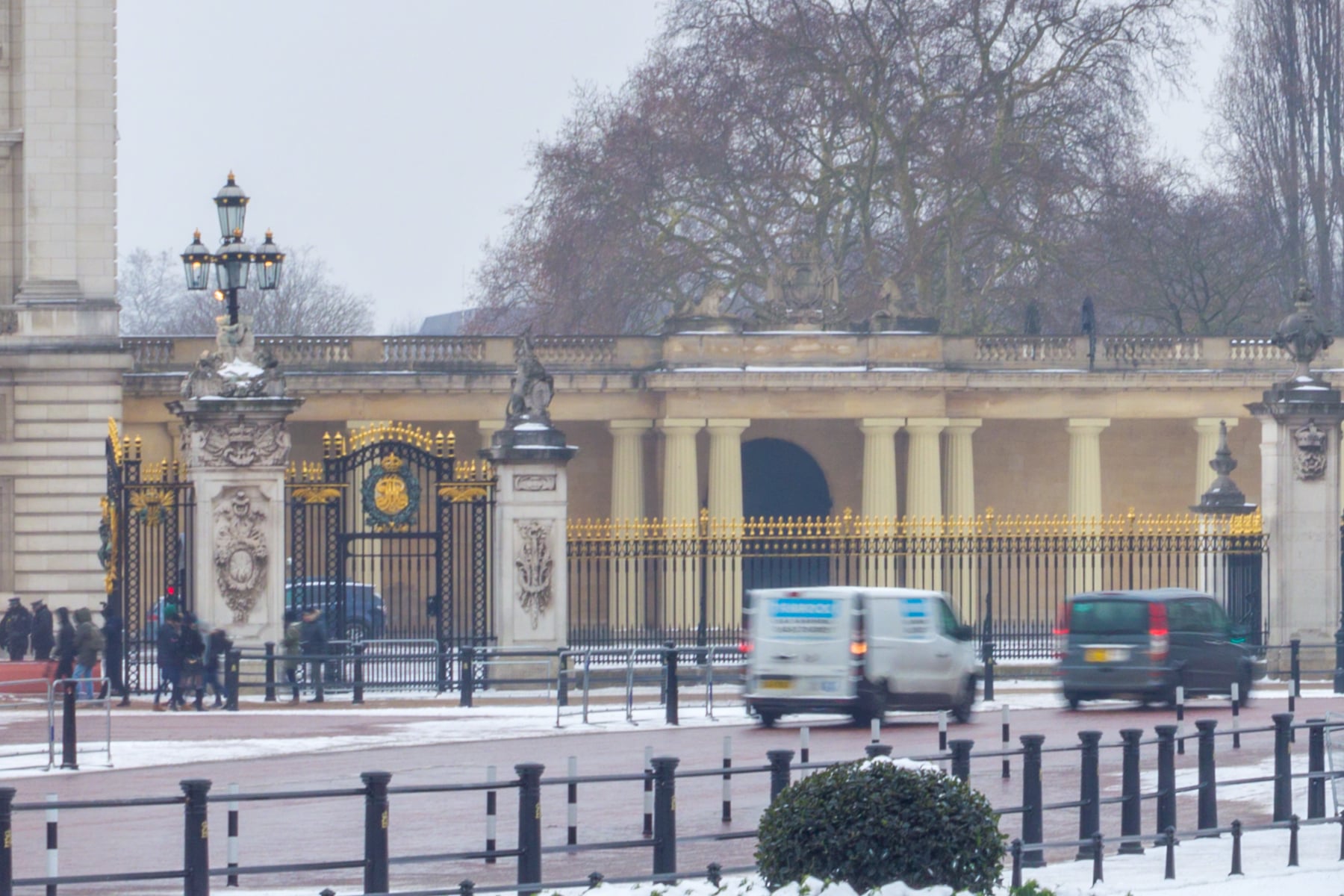 Encircling the palace are snow-covered trees and neatly manicured gardens, their symmetry and order enhanced by the white coating. The black iron railings and lamp posts add a timeless elegance to the scene. Sparse foot traffic and light vehicular movement suggest a tranquil day, allowing the viewer to fully appreciate the beauty and serenity of this iconic British landmark during wintertime. The overall ambience evokes a sense of regal stillness, a moment frozen in time amid the hustle of London life.