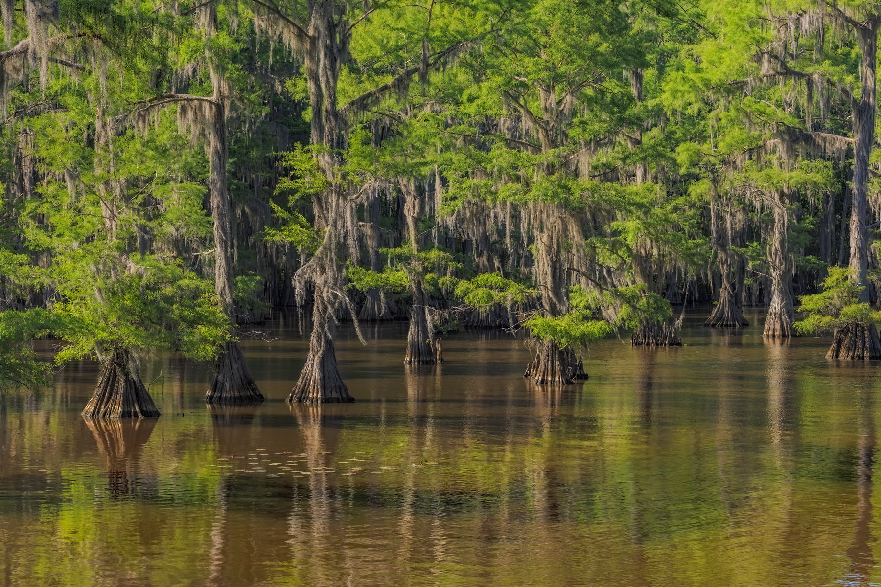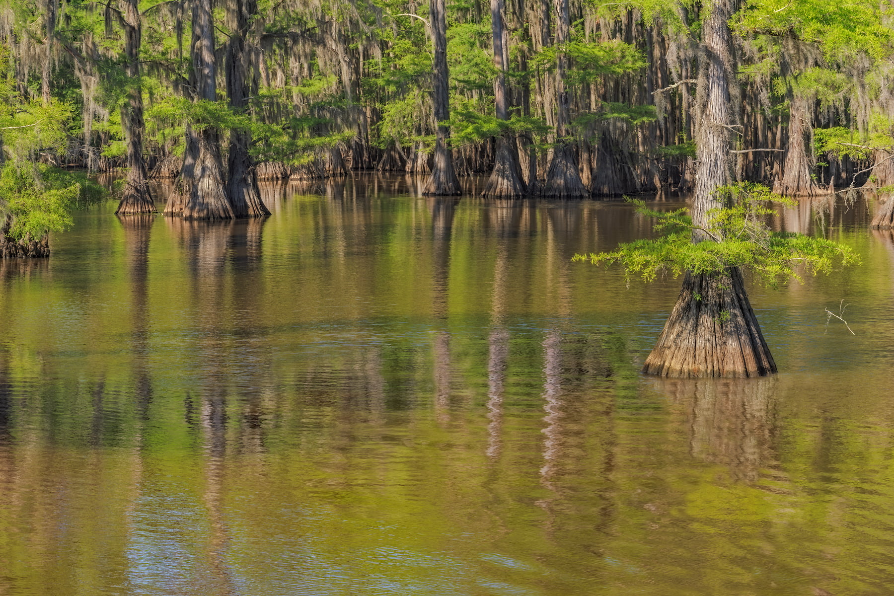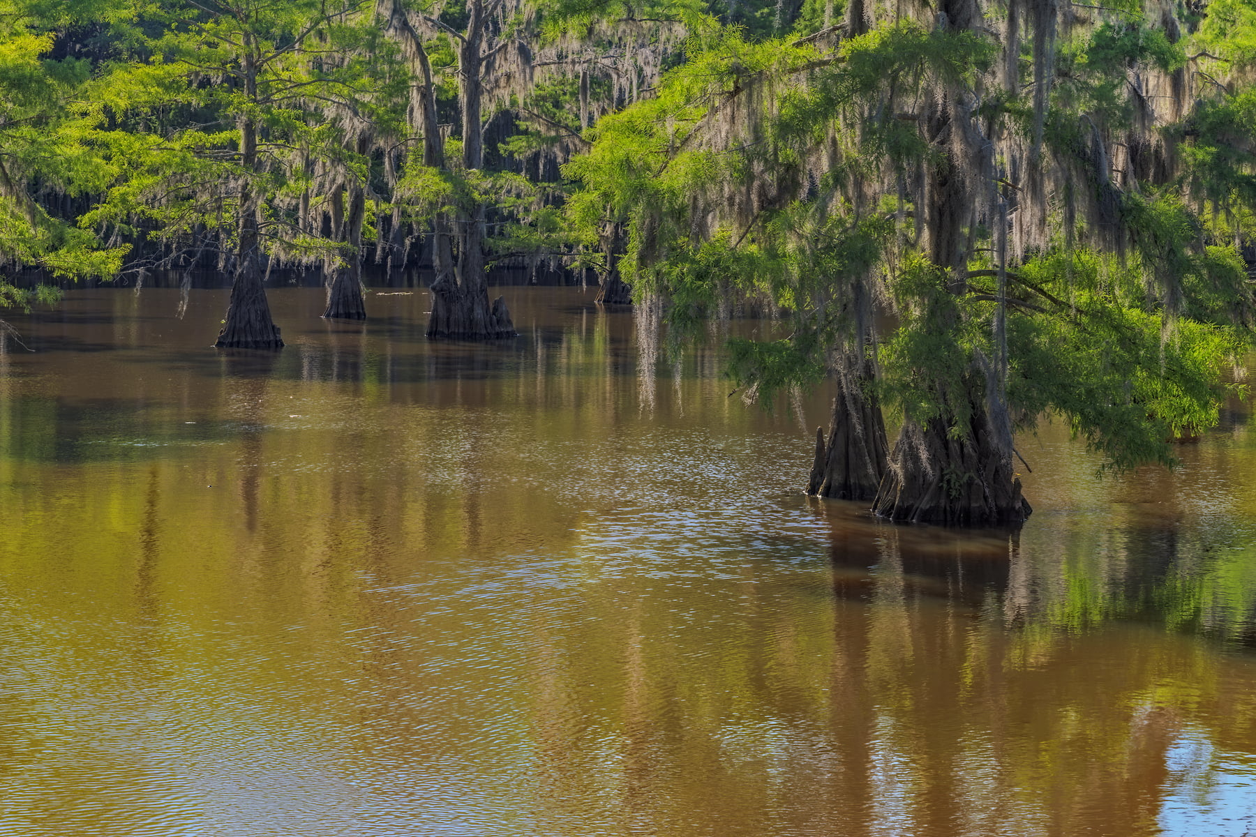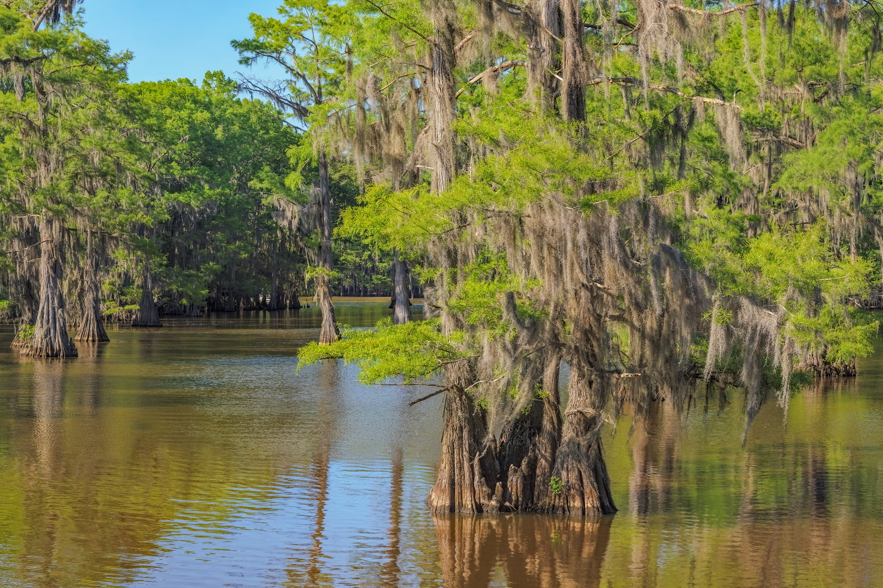 Caddo Lake, is considered to be one of East Texas' treasures. Bald cypress trees draped with SpanÂish moss tower over the maze of bayous, sloughs and ponds of Caddo Lake. Caddo Lake is a 25,400-acre (10,300 ha) lake and bayou (wetland) on the border between Texas and Louisiana, in northern Harrison County and southern Marion County in Texas and western Caddo Parish in Louisiana. The lake is named after the Southeastern culture of Native Americans called Caddoans or Caddo, who lived in the area until their expulsion in the 19th century. It is an internationally protected wetland under the Ramsar Convention and includes one of the largest flooded cypress forests in the United States. Caddo is one of Texas's few non-oxbow natural lakes and is the second-largest in the South; however, it was artificially altered by the addition of a dam in the 1900s.