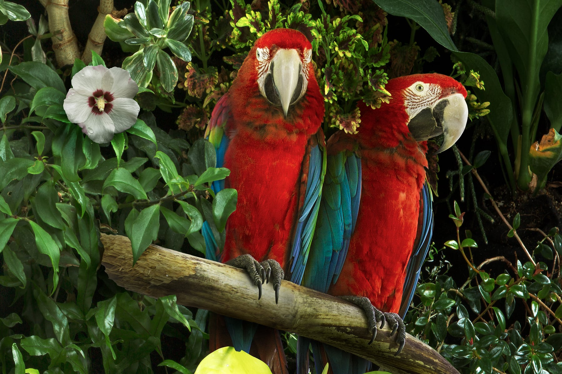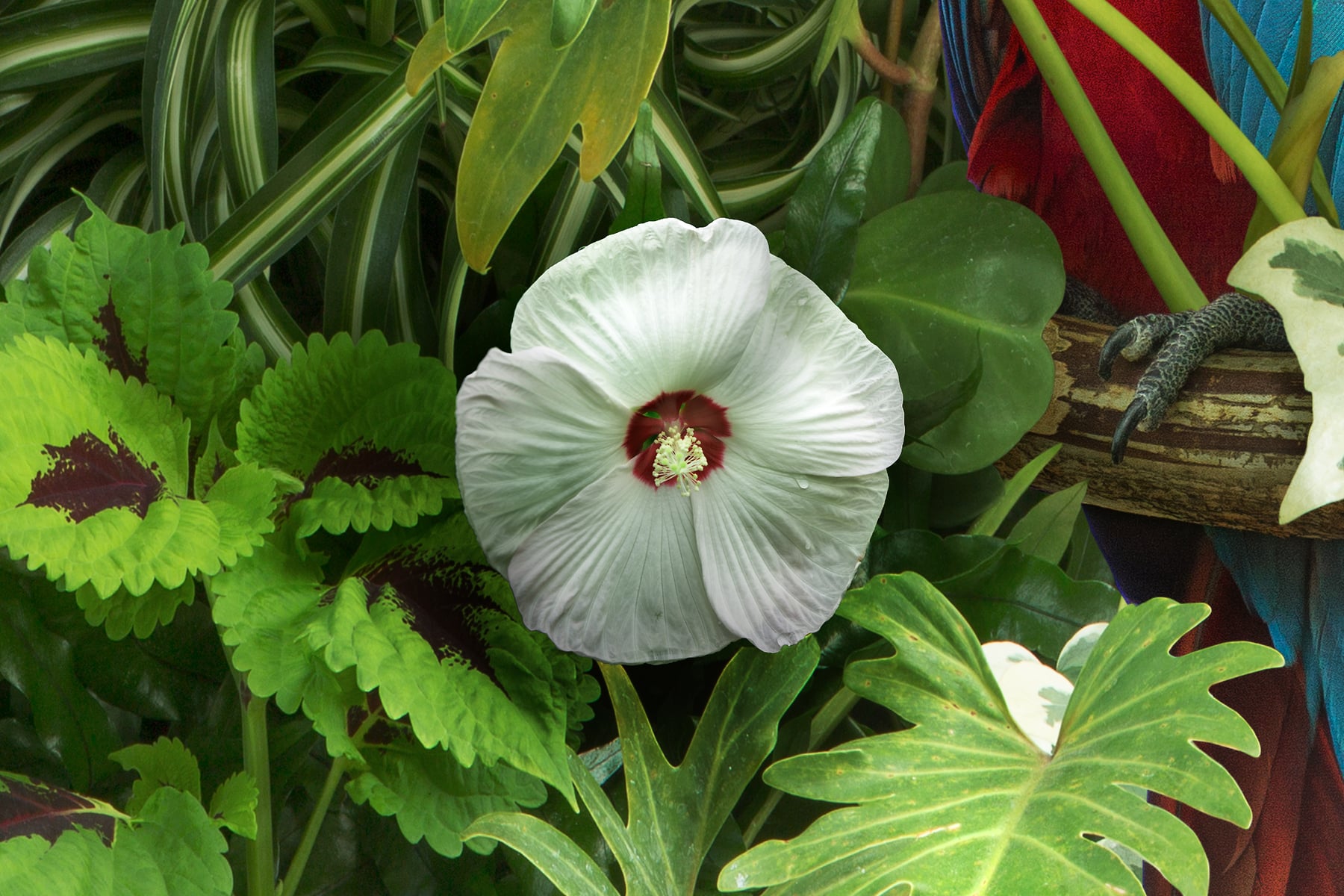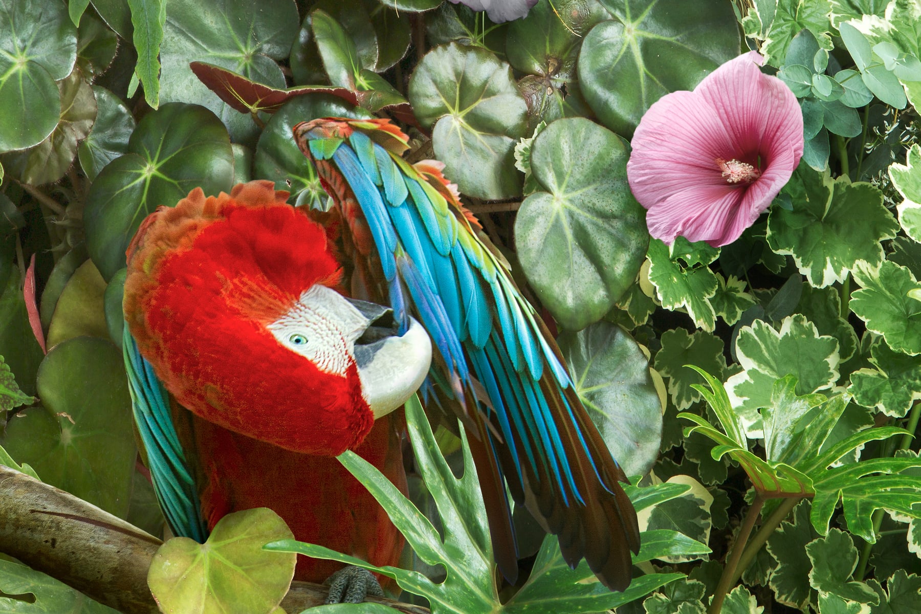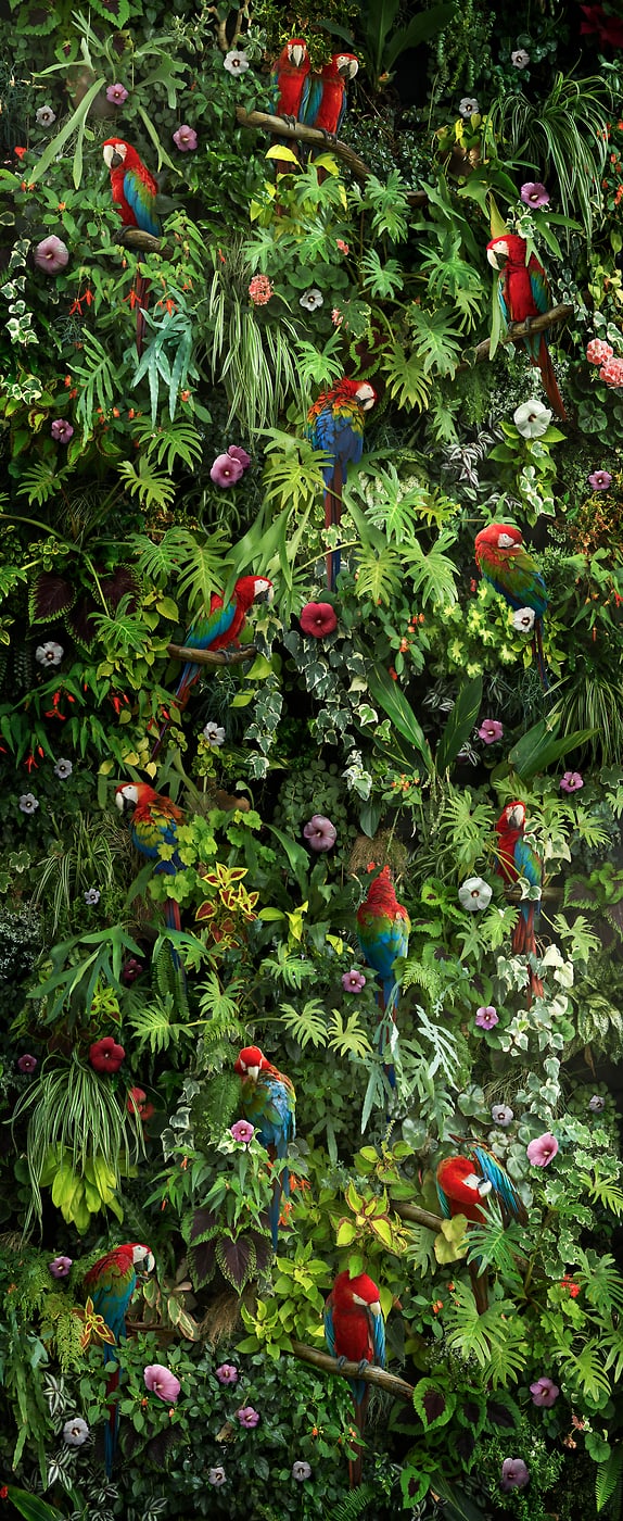To create this image I photographed all of the imagery at a few botanical gardens, horticultural centers, public parks, and aviaries. Then I use a complex process of digital imaging in Adobe Photoshop to composite the imagery together. The final image is actually made up of more than 50 photographs meticulously pieced together. This process required a lot of effort building up the final seamless image, figuring out the lighting, shadows, color, and other effects to make it look realistic. Each image is carefully planned out and created as an intricately layered construction, which gives it such a hyper-real, illustrative quality.