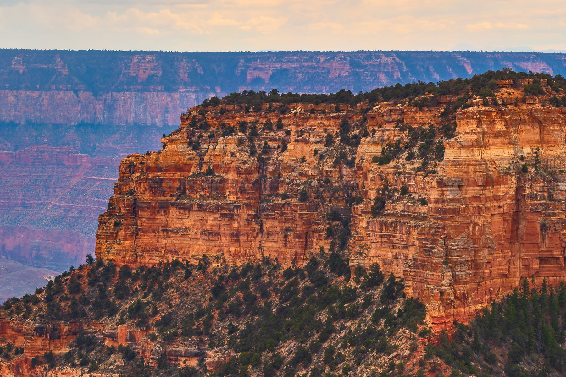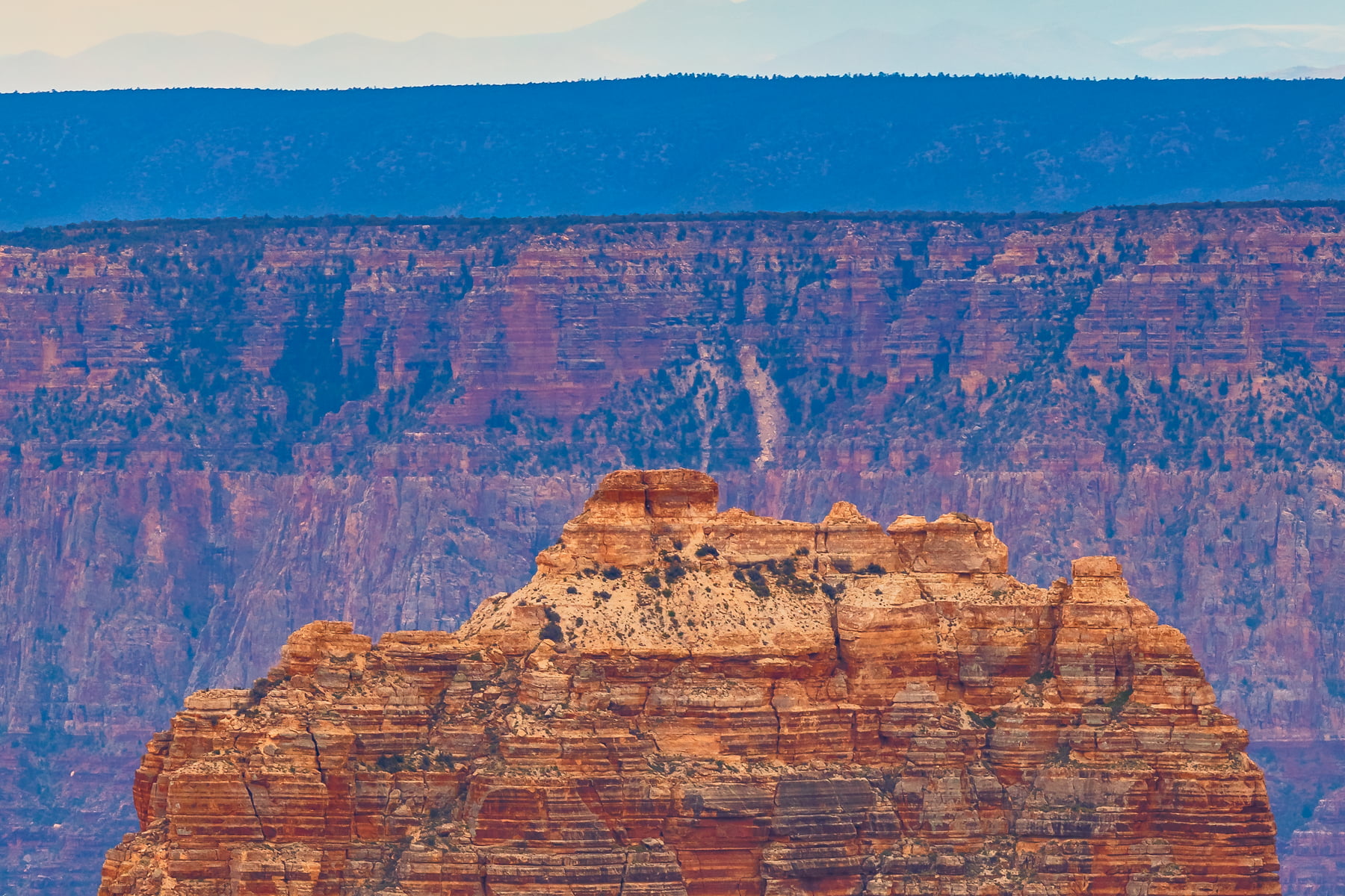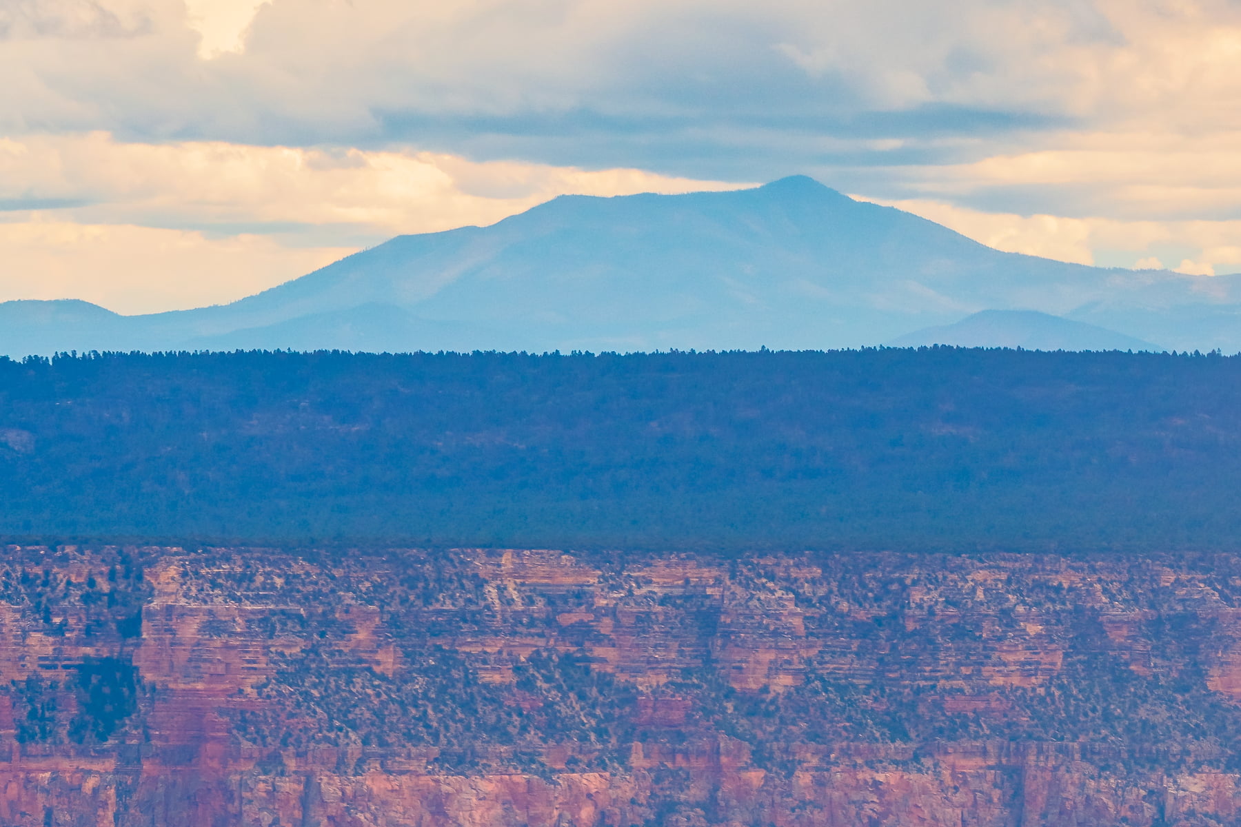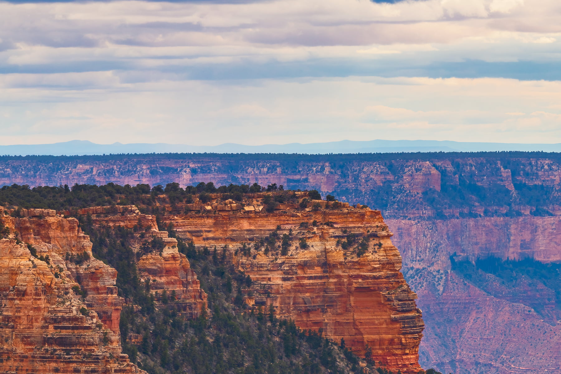 Wotans Throne, the large butte just right of center is a 7,721-foot-elevation (2,353 meter) summit that stands prominent extending into the canyon about one mile from the location this photo was taken from. The wooded top of Wotans Throne is composed of 700-feet-thick Kaibab Limestone overlaying 300-feet-thick, cream-colored, cliff-forming, Permian Coconino Sandstone.