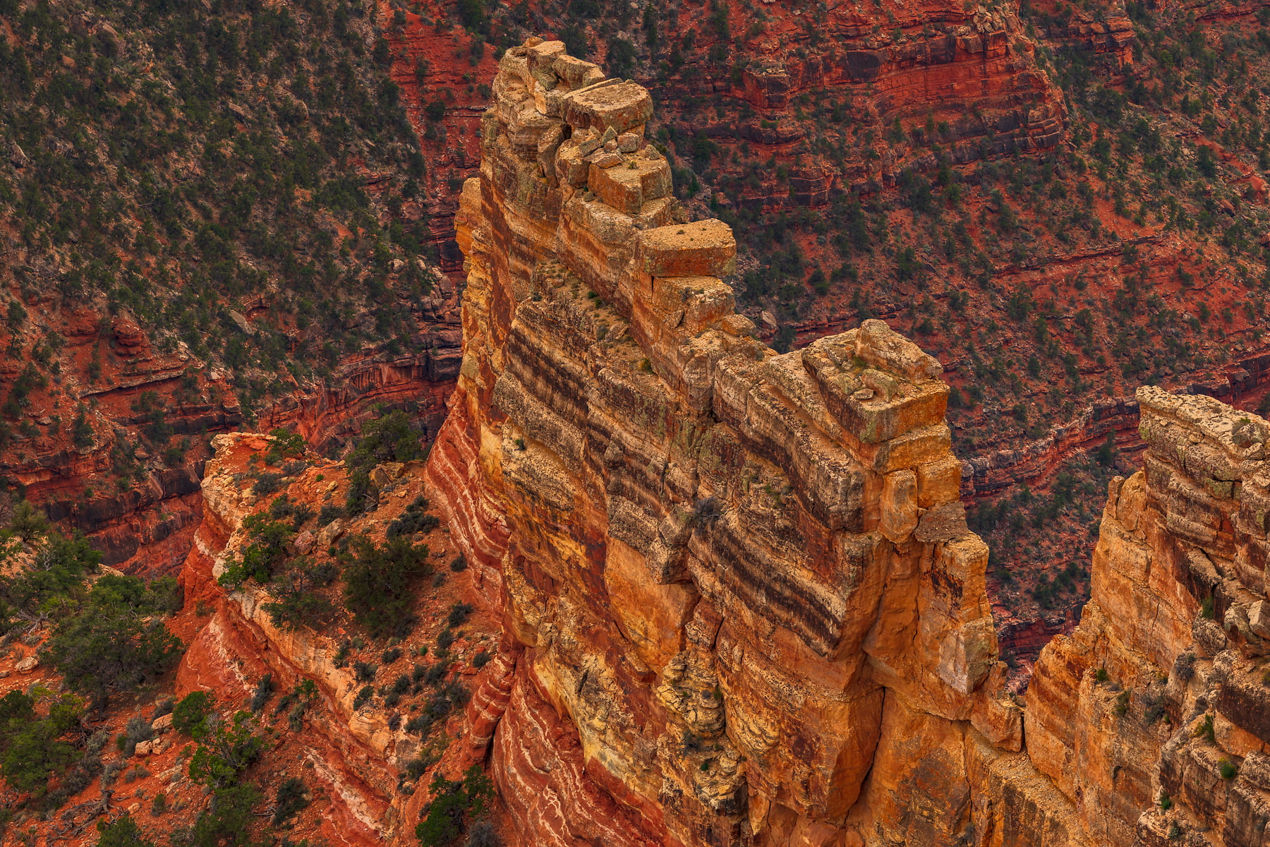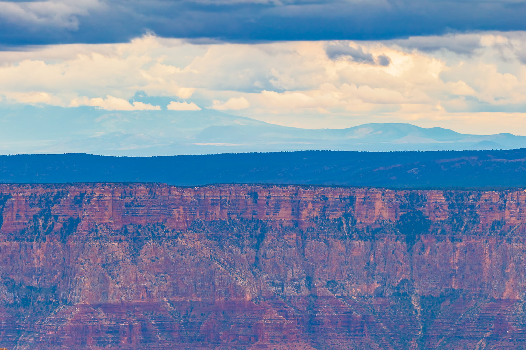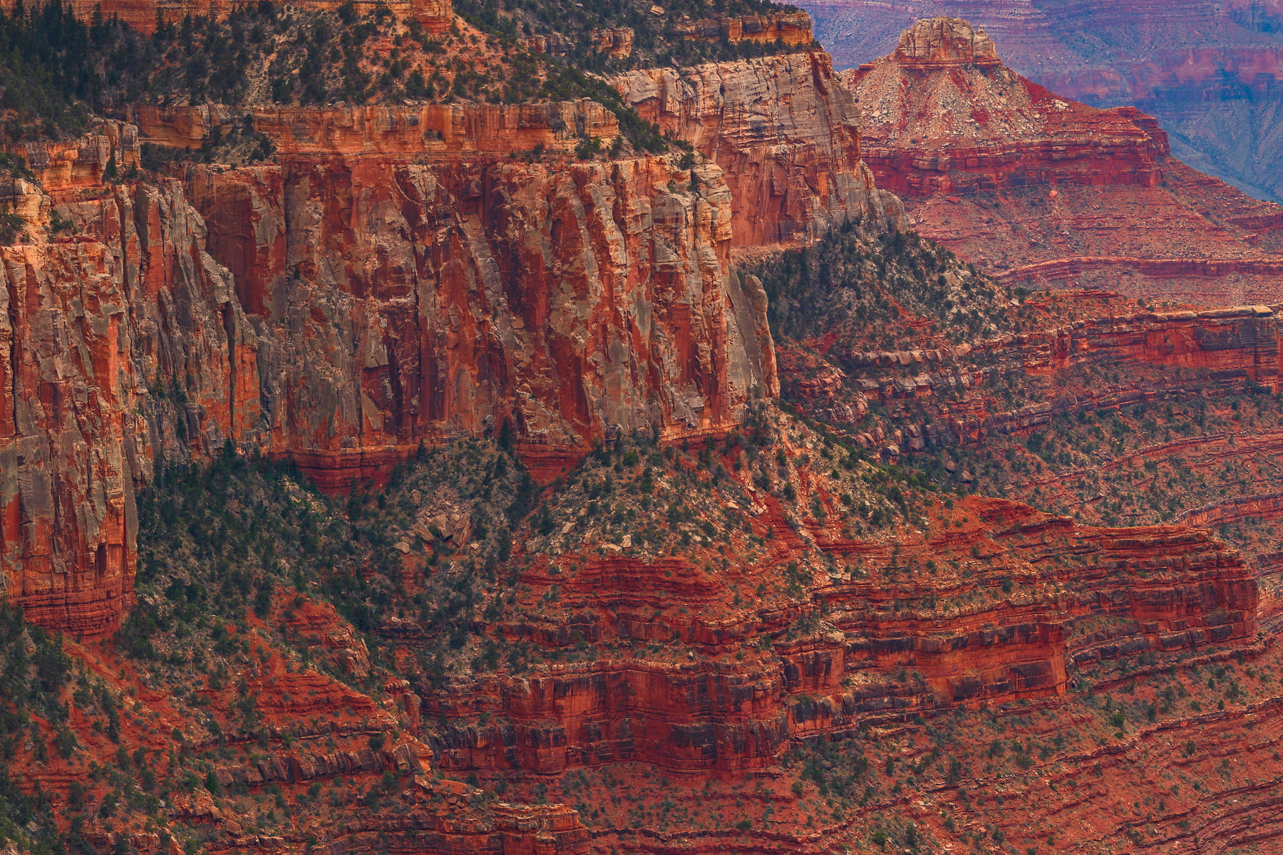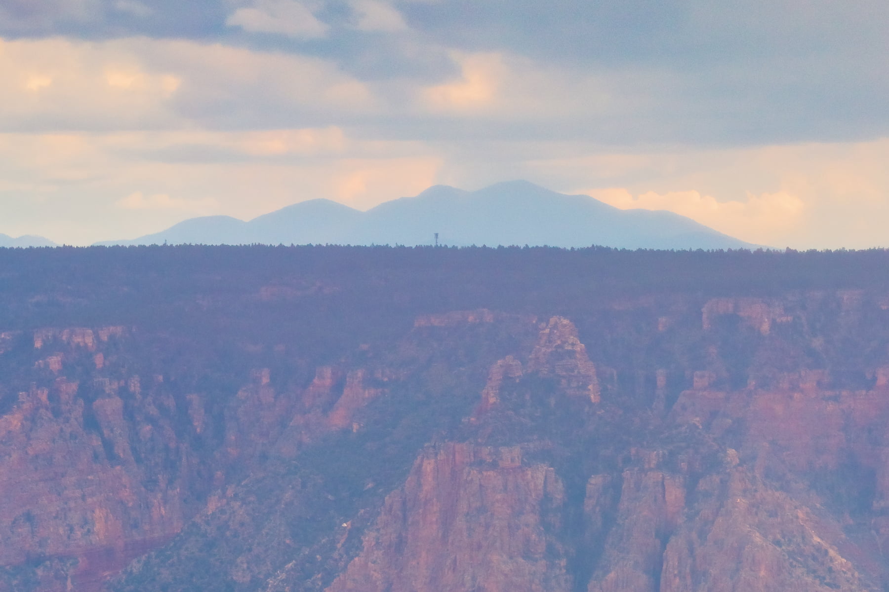 Wotans Throne, the large butte just right of center is a 7,721-foot-elevation (2,353 meter) summit that stands prominent extending into the canyon about one mile from the location this photo was taken from. The wooded top of Wotans Throne is composed of 700-feet-thick Kaibab Limestone overlaying 300-feet-thick, cream-colored, cliff-forming, Permian Coconino Sandstone.
