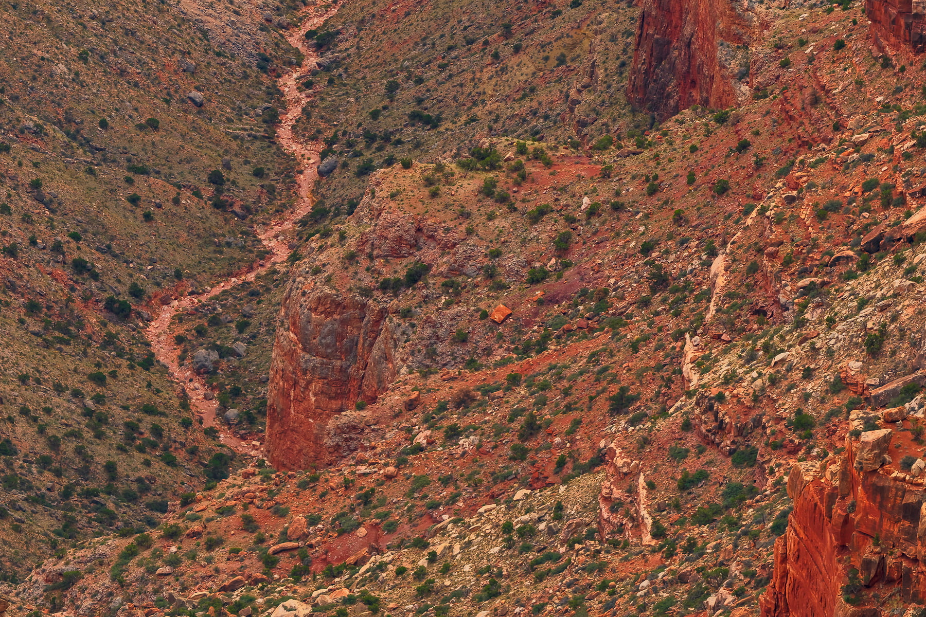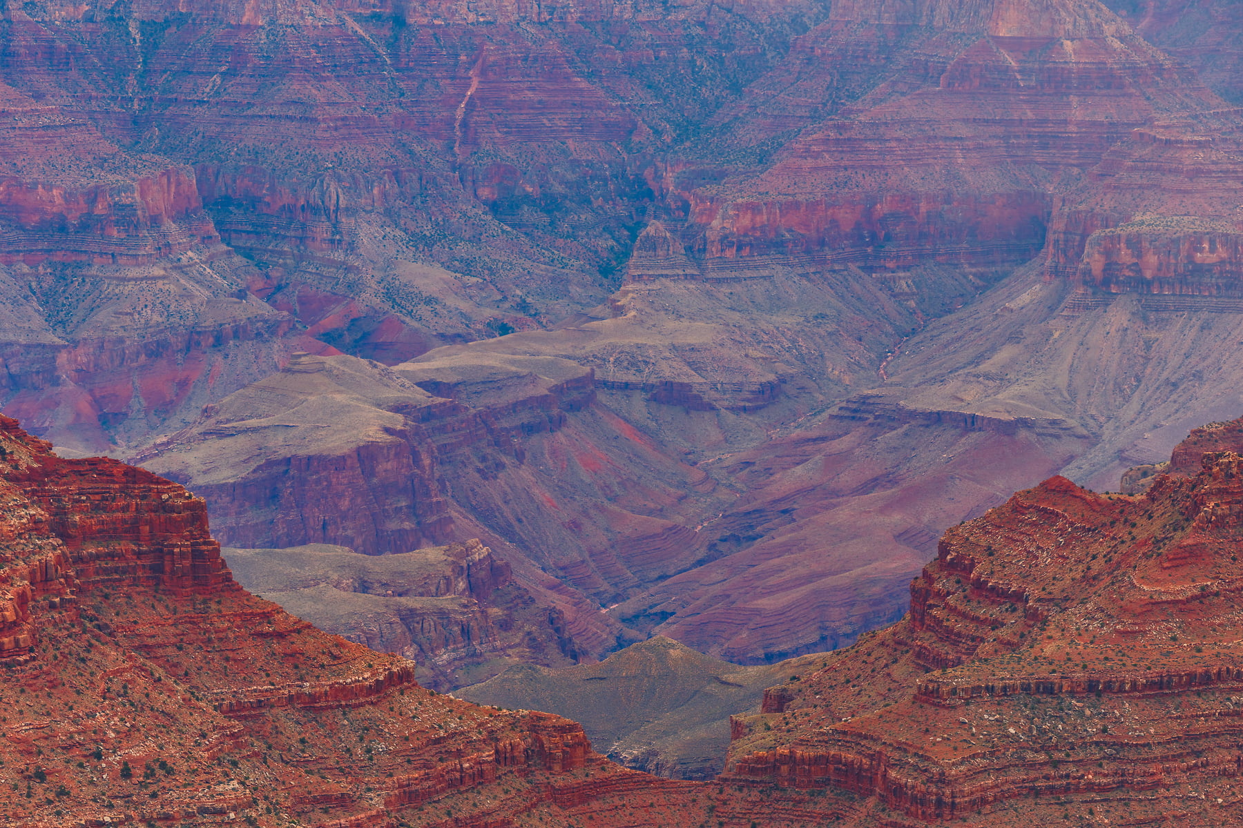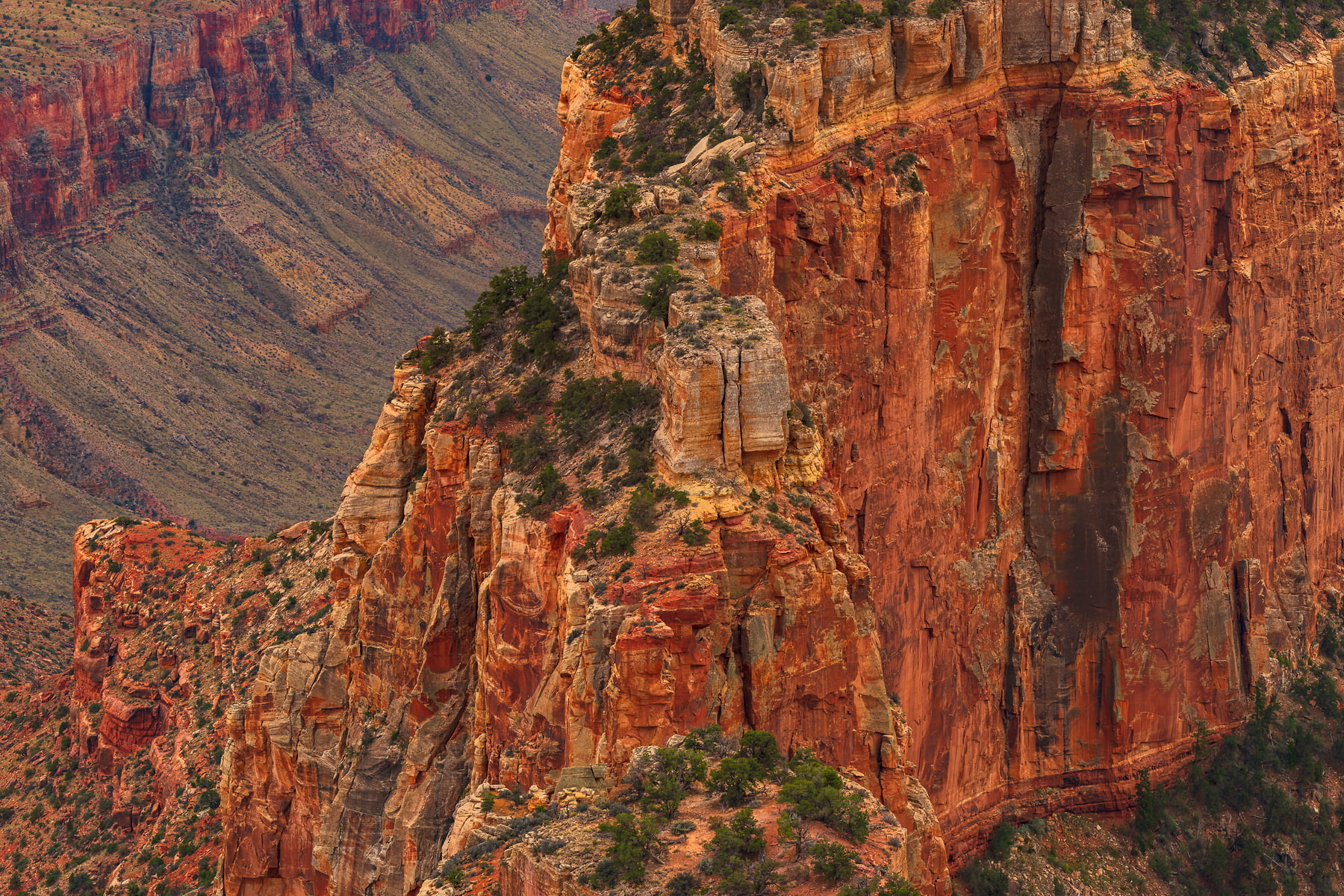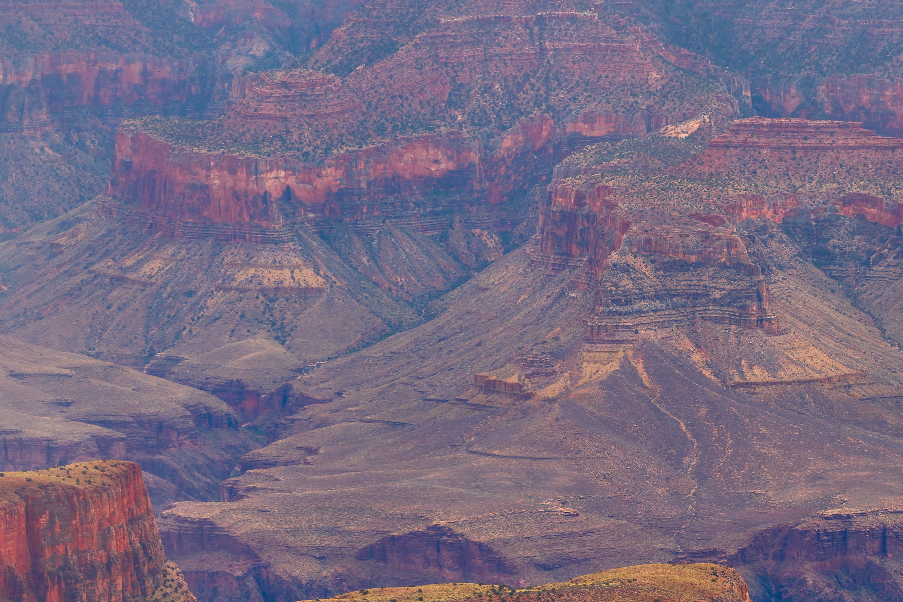 Wotans Throne, the large butte just right of center is a 7,721-foot-elevation (2,353 meter) summit that stands prominent extending into the canyon about one mile from the location this photo was taken from. The wooded top of Wotans Throne is composed of 700-feet-thick Kaibab Limestone overlaying 300-feet-thick, cream-colored, cliff-forming, Permian Coconino Sandstone.