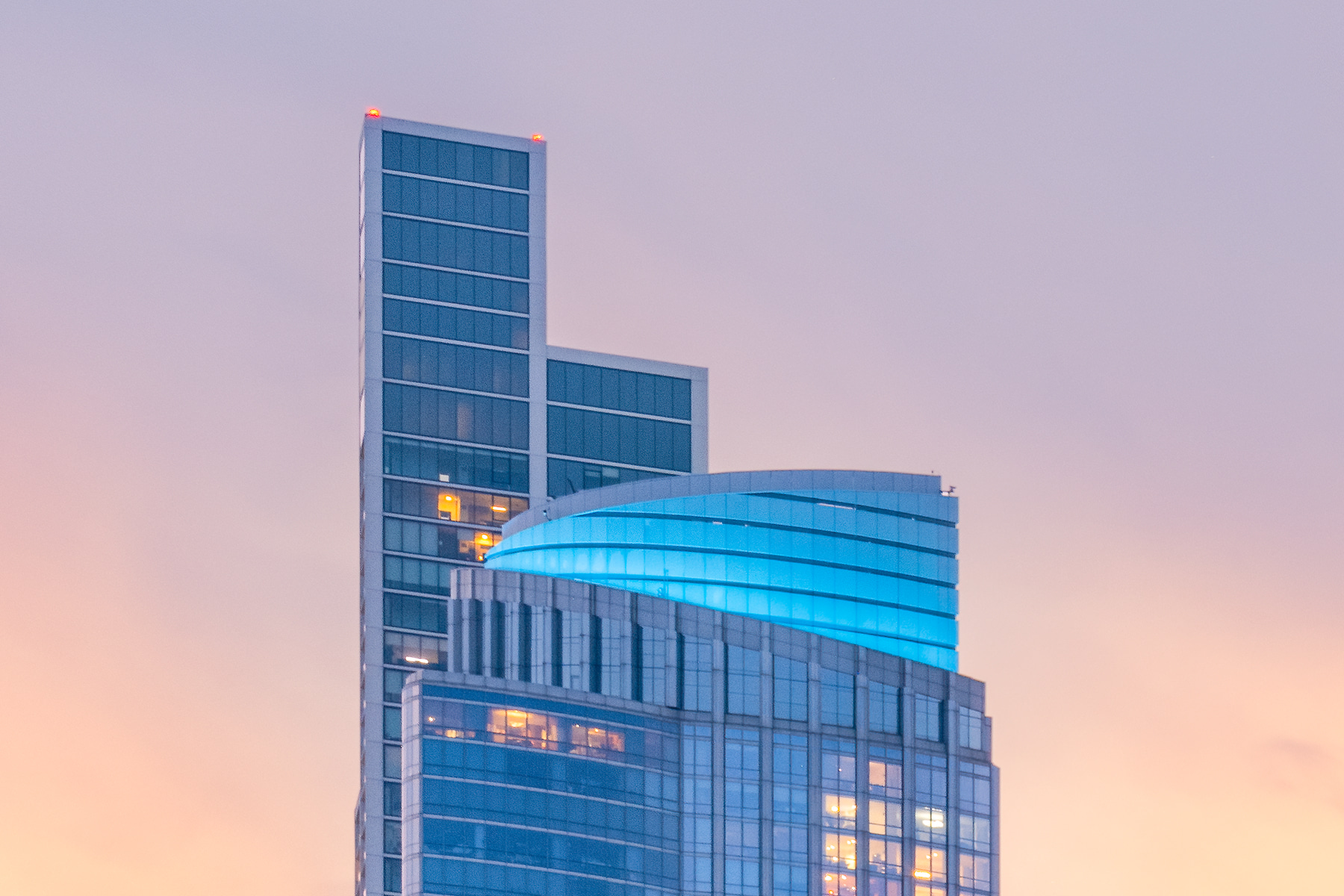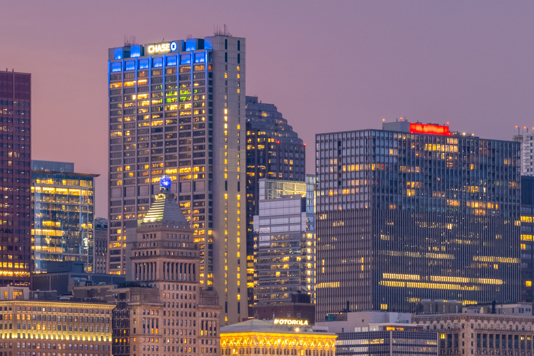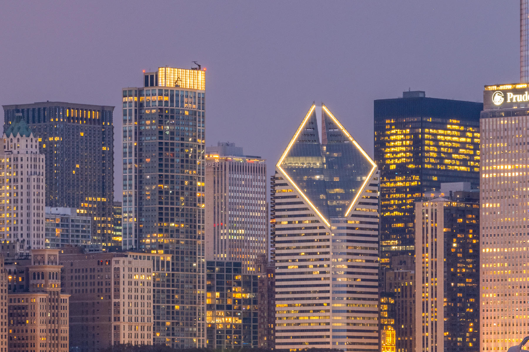 This beautiful sunset shot of the Chicago skyline was created on the Skyline Walk, between the Adler Planetarium and the Shedd Aquarium. This image includes most of Chicago’s famous buildings. You can see the Willis Tower, formerly the Sears Tower which is the second tallest building in the United States. The Aon Center was formerly known as the Standard Oil building but changed its name after the company rebranded. The building itself was forced to undergo its own type of rebranding when its marble facade had to be replaced with granite as the wind in the Windy City was knocking the marble loose and creating a fall hazard. The historic Palmer House can be seen to the right of the Shedd Aquarium, while today it is a Hilton Hotel when it was built it was one of the most extravagant wedding gifts of the time from Potter Palmer to his beloved Bertha. The John Hancock Center is the seventh tallest building in the US and is seen on the right-hand side of the image.