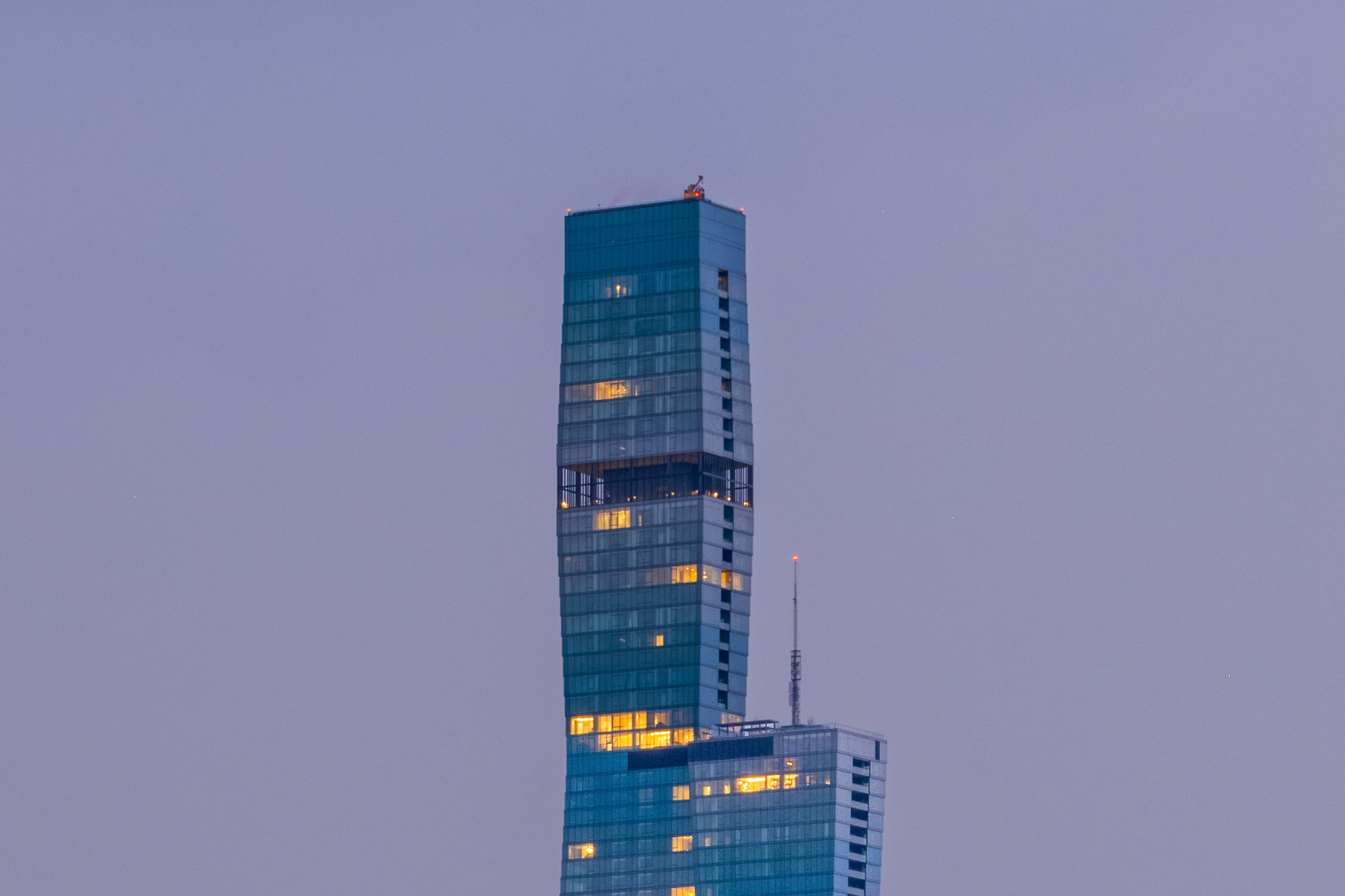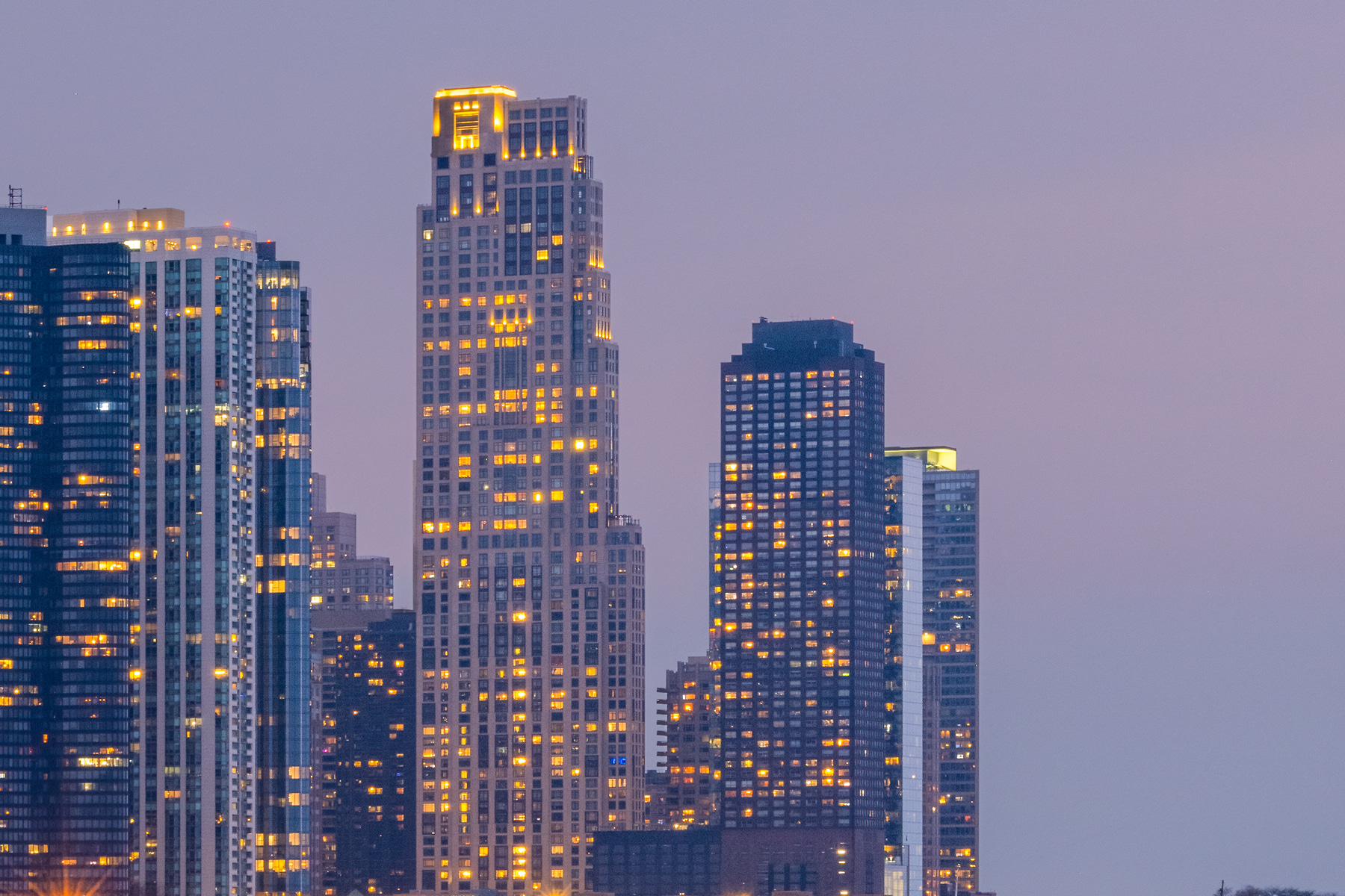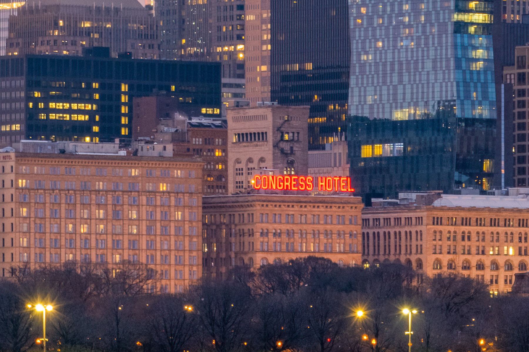 This beautiful sunset shot of the Chicago skyline was created on the Skyline Walk, between the Adler Planetarium and the Shedd Aquarium. This image includes most of Chicago’s famous buildings. You can see the Willis Tower, formerly the Sears Tower which is the second tallest building in the United States. The Aon Center was formerly known as the Standard Oil building but changed its name after the company rebranded. The building itself was forced to undergo its own type of rebranding when its marble facade had to be replaced with granite as the wind in the Windy City was knocking the marble loose and creating a fall hazard. The historic Palmer House can be seen to the right of the Shedd Aquarium, while today it is a Hilton Hotel when it was built it was one of the most extravagant wedding gifts of the time from Potter Palmer to his beloved Bertha. The John Hancock Center is the seventh tallest building in the US and is seen on the right-hand side of the image.