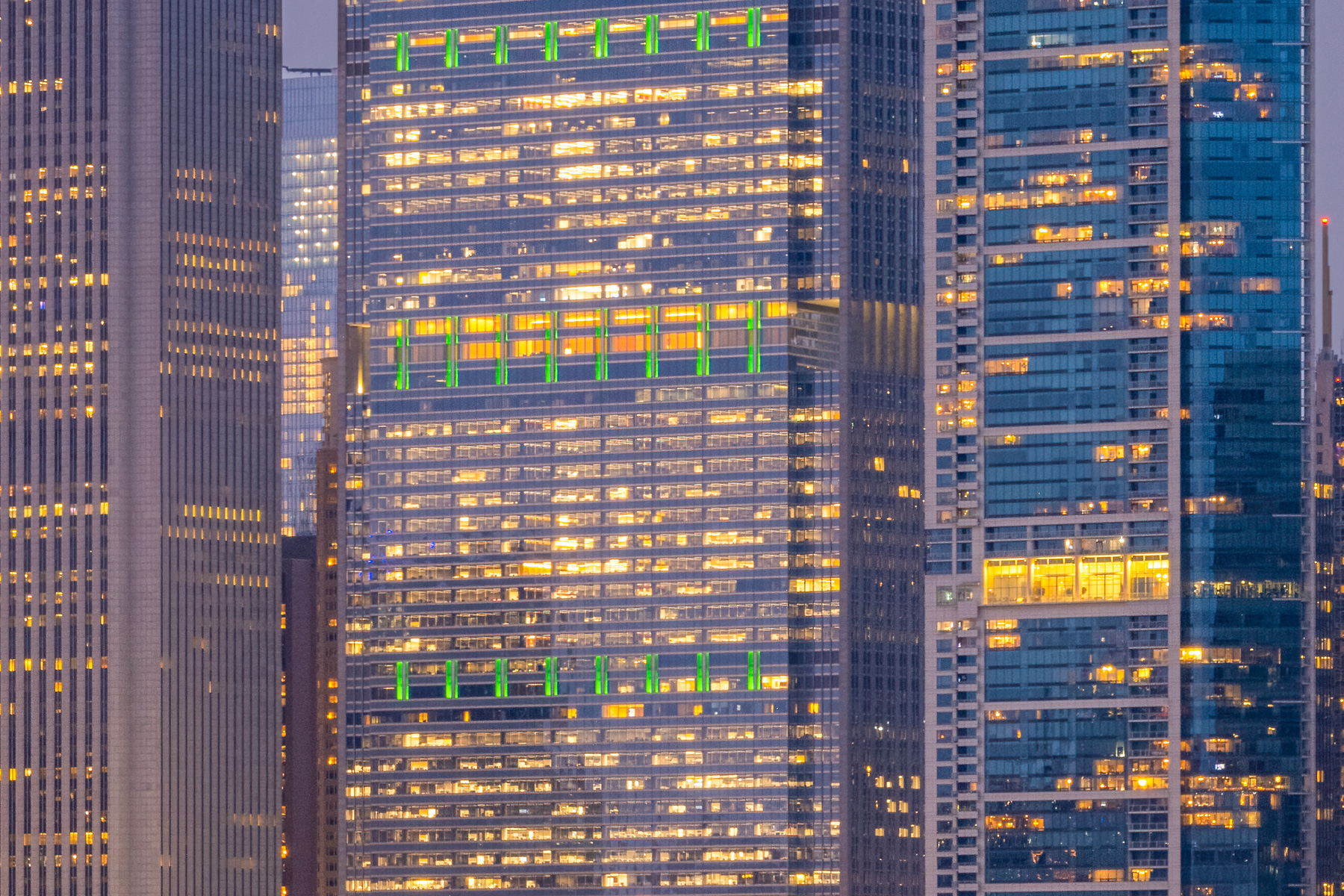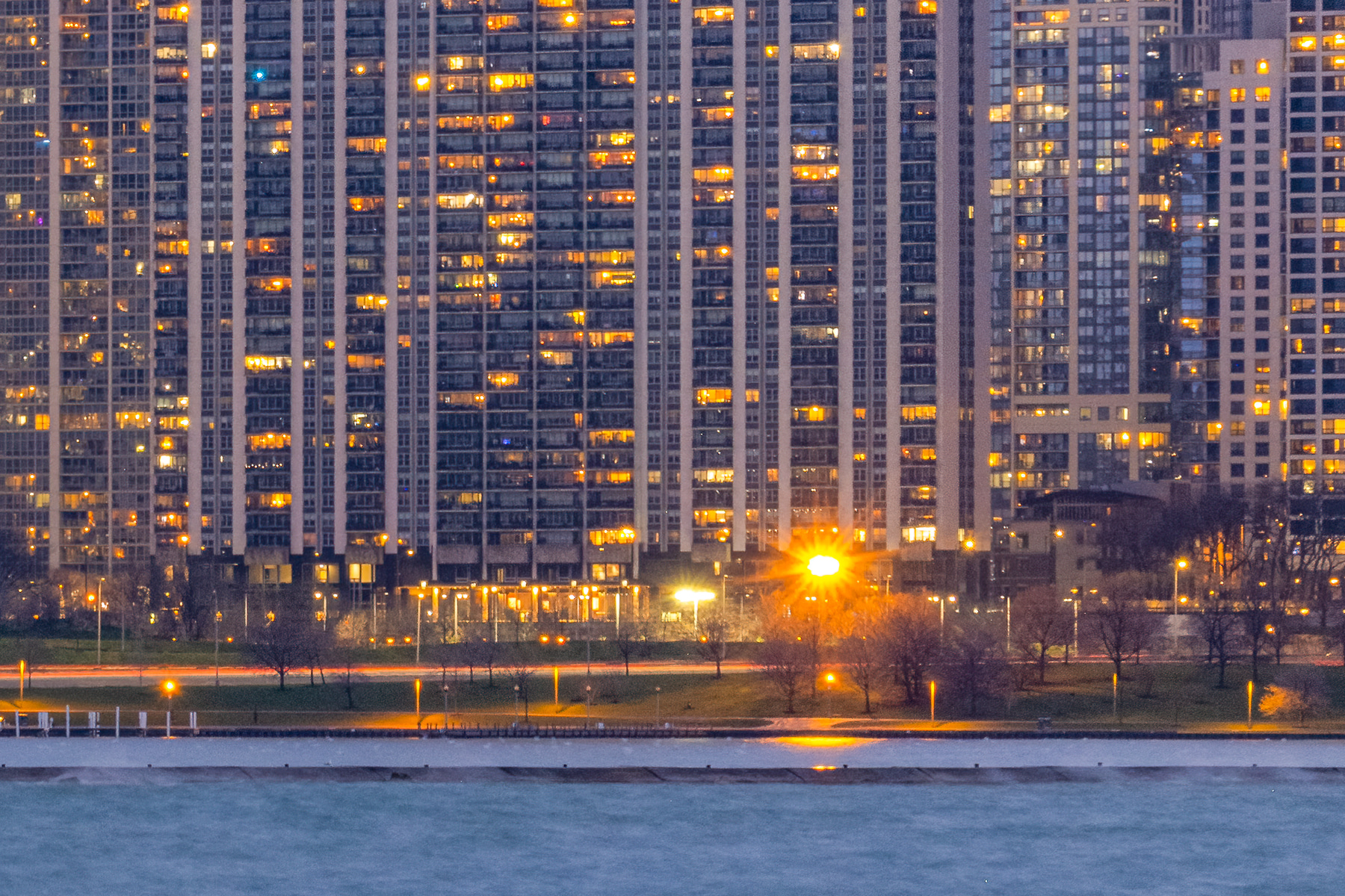 These buildings lit up for night create an eye-catching image against the backdrop of sunset just after an early spring storm. You can see the storm clouds and building lights reflected in the wrap-around windows of the Shedd Aquarium in the left-hand corner of the photo and the still wet pavement of the Lakefront Trail.