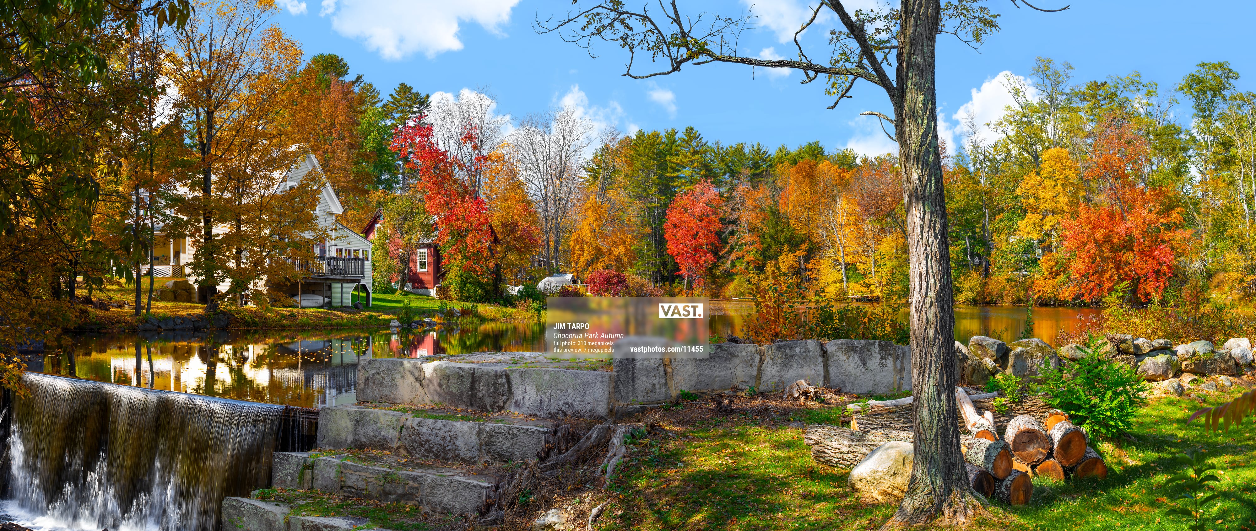 Cruising south from Conway on beautiful HWY 16 during the peak of Autumn color in October, I caught a glimpse of this beautiful little spot where the Chocorua river forms a small lake with all the right surroundings. The dam and waterfall marks the point where the river flows underneath Deer Hill Rd. and resumes its journey south. With the New Hampshire Autumn colors looking as magnificent as one could imagine, I had hustled to many locations on this day. With time running low, and an important dinner reservation looming, I jumped out of the car and quickly acquired the shots for what is now one of my favorite images.
