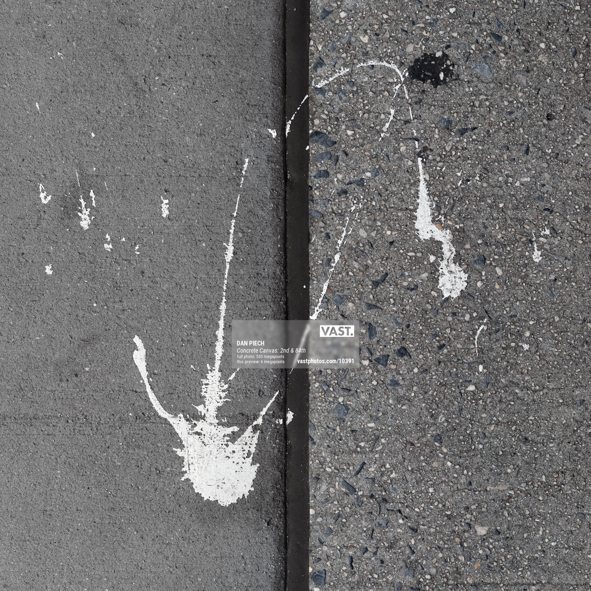 Dan Piech's Concrete Canvas series captures the accidental beauty that serendipitously occurs when the concrete beneath New Yorkers' feet is inadvertently graced by spilled paint, fallen debris, expanding cracks, chemical stains, and other delightful visual elements. An avid runner, Piech has spent over three years traversing every single Manhattan street in search of these overlooked "artworks" that have become part of the fabric of the city.