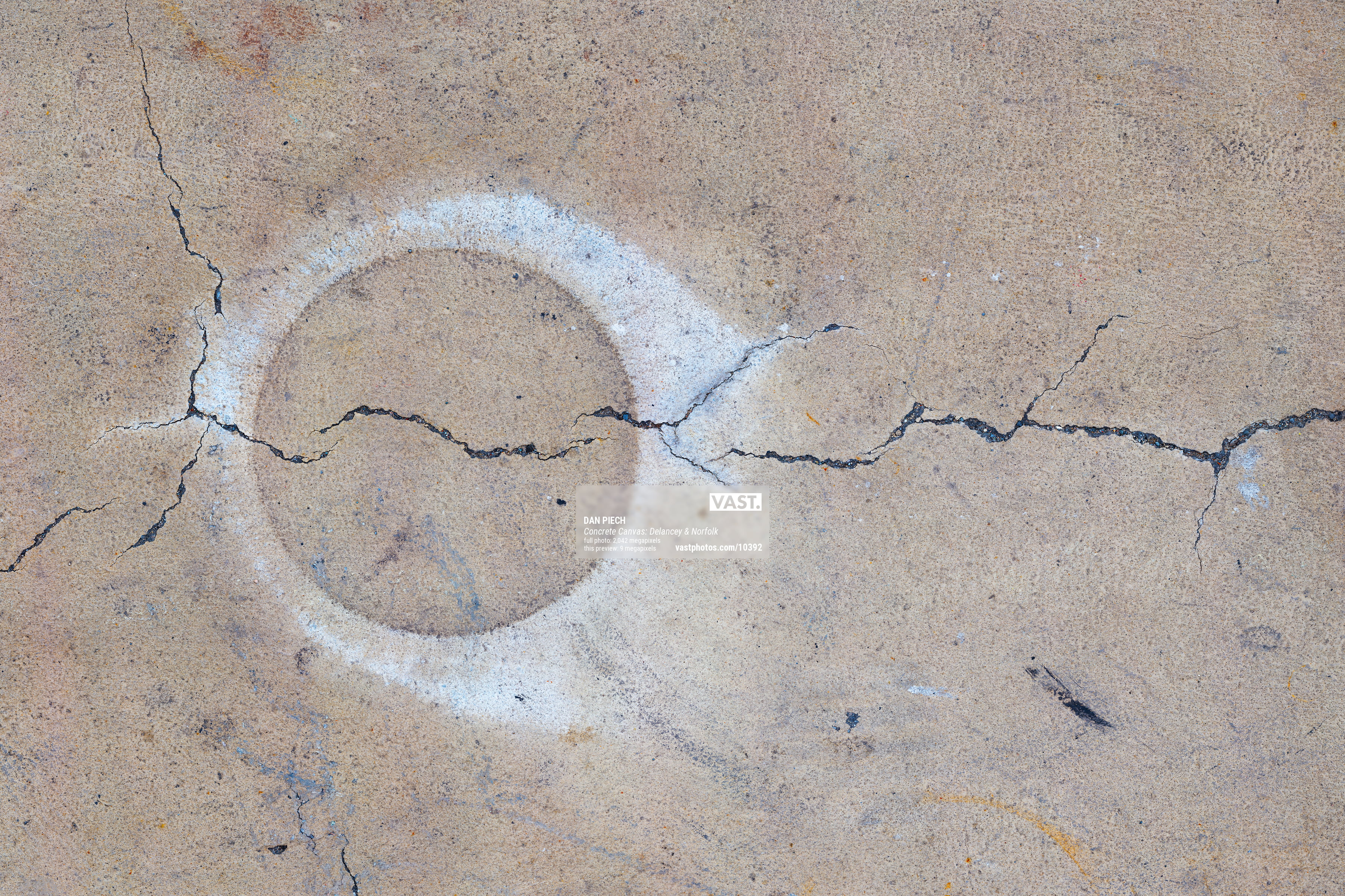 Dan Piech's Concrete Canvas series captures the accidental beauty that serendipitously occurs when the concrete beneath New Yorkers' feet is inadvertently graced by spilled paint, fallen debris, expanding cracks, chemical stains, and other delightful visual elements. An avid runner, Piech has spent over three years traversing every single Manhattan street in search of these overlooked "artworks" that have become part of the fabric of the city.