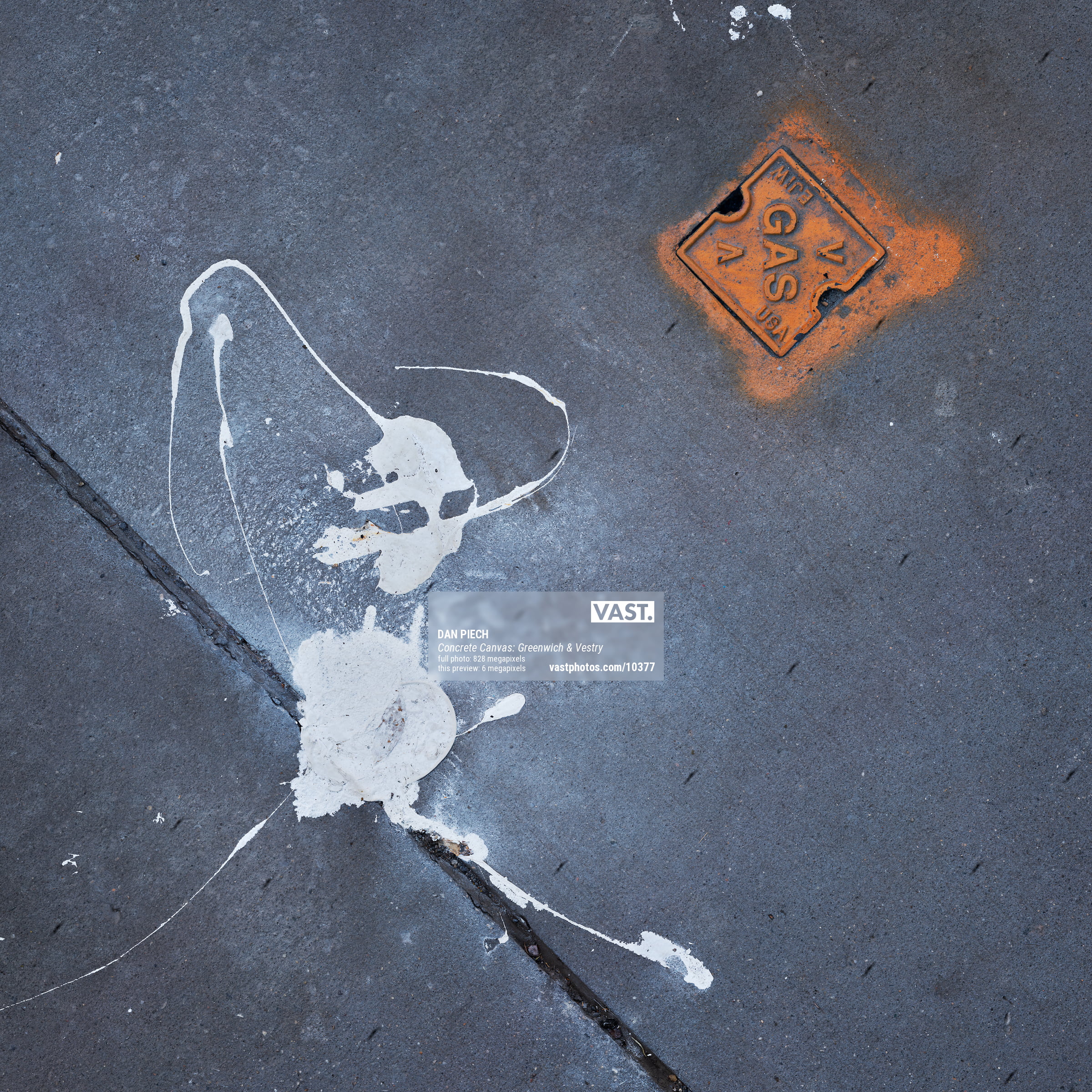 Dan Piech's Concrete Canvas series captures the accidental beauty that serendipitously occurs when the concrete beneath New Yorkers' feet is inadvertently graced by spilled paint, fallen debris, expanding cracks, chemical stains, and other delightful visual elements. An avid runner, Piech has spent over three years traversing every single Manhattan street in search of these overlooked "artworks" that have become part of the fabric of the city.