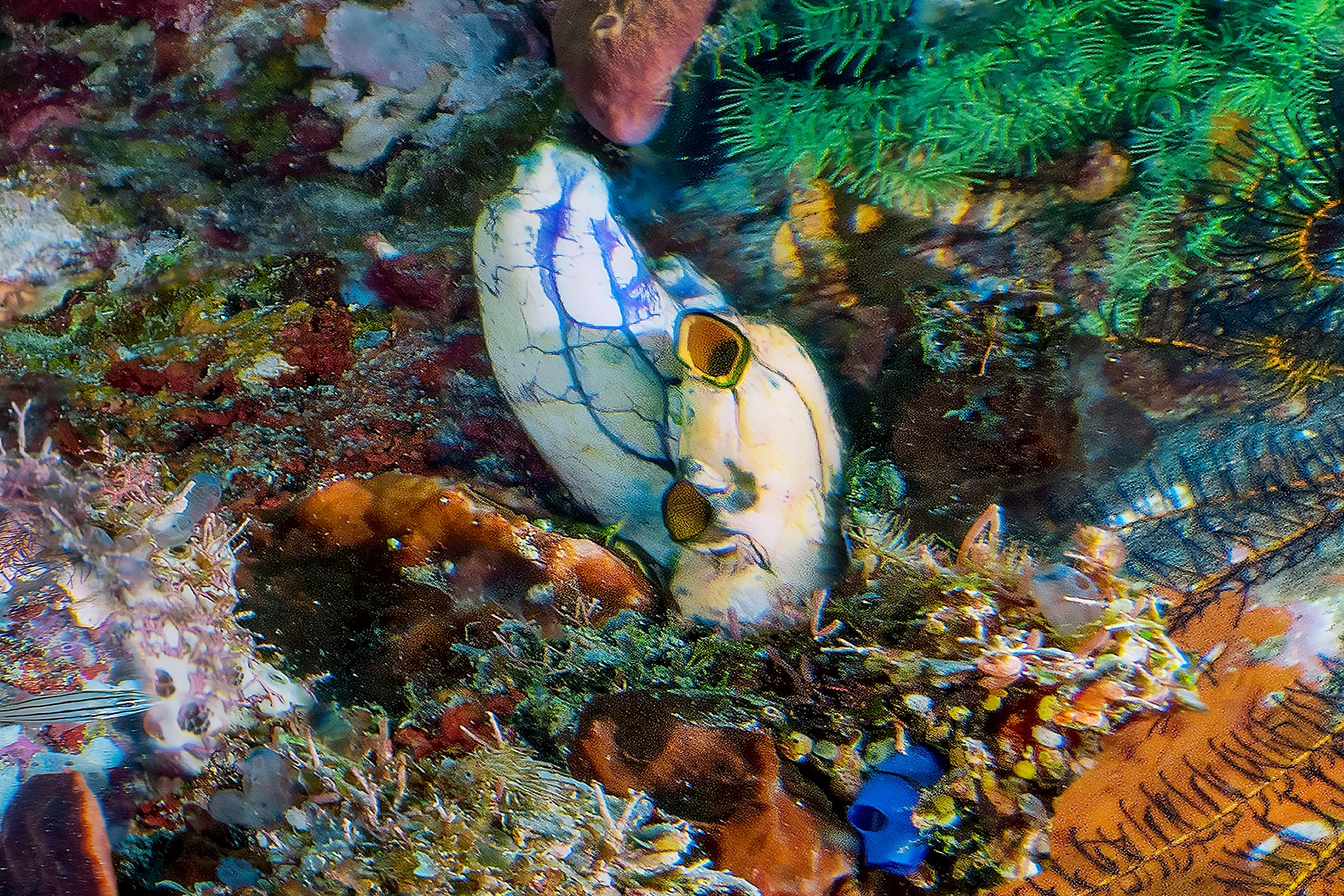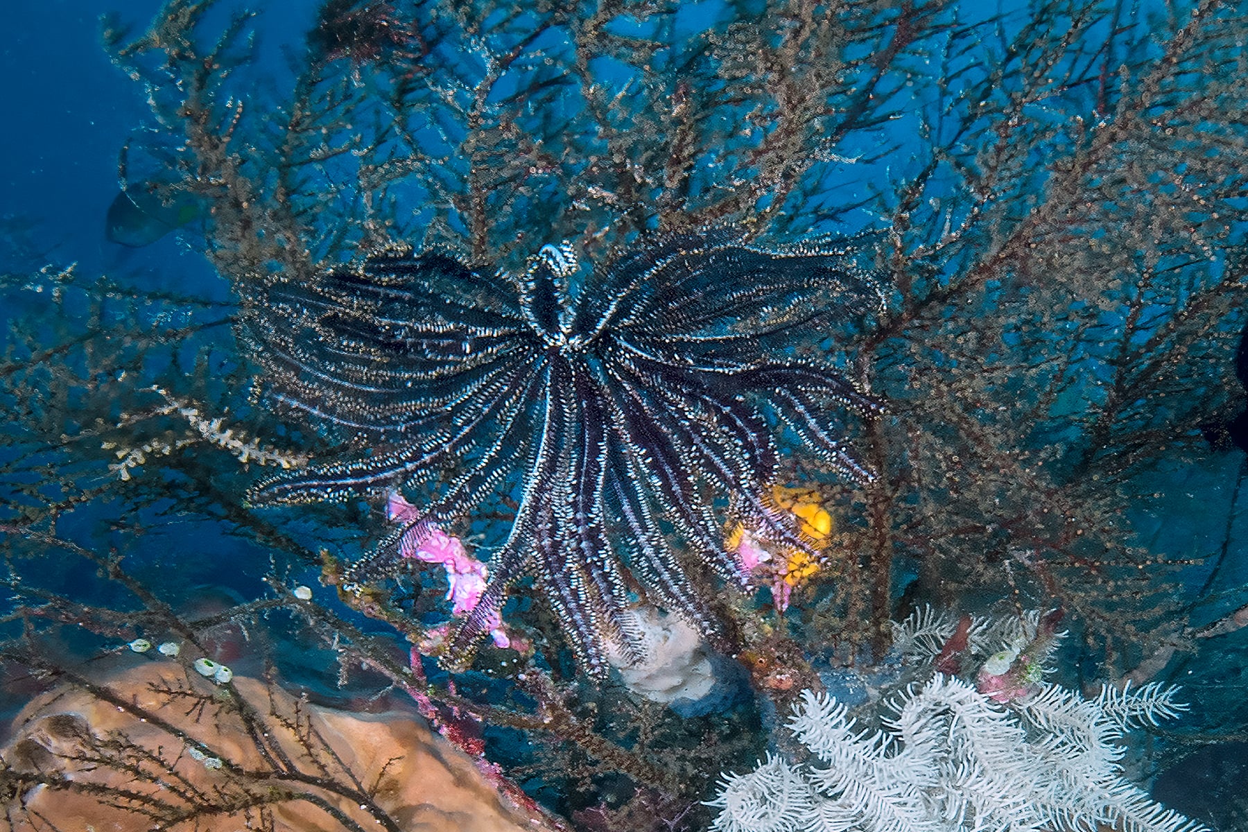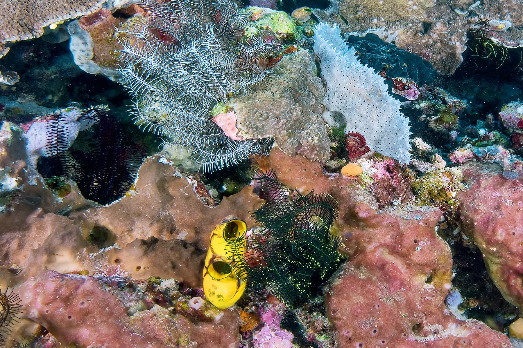This high resolution photo-composite was captured in over 50 individual frames, resulting in exceptional resolution and extreme details. Various marine life is captured in this image, including Green Sea Turtles, Clown Fish, Lionfish, Crinoids and more.