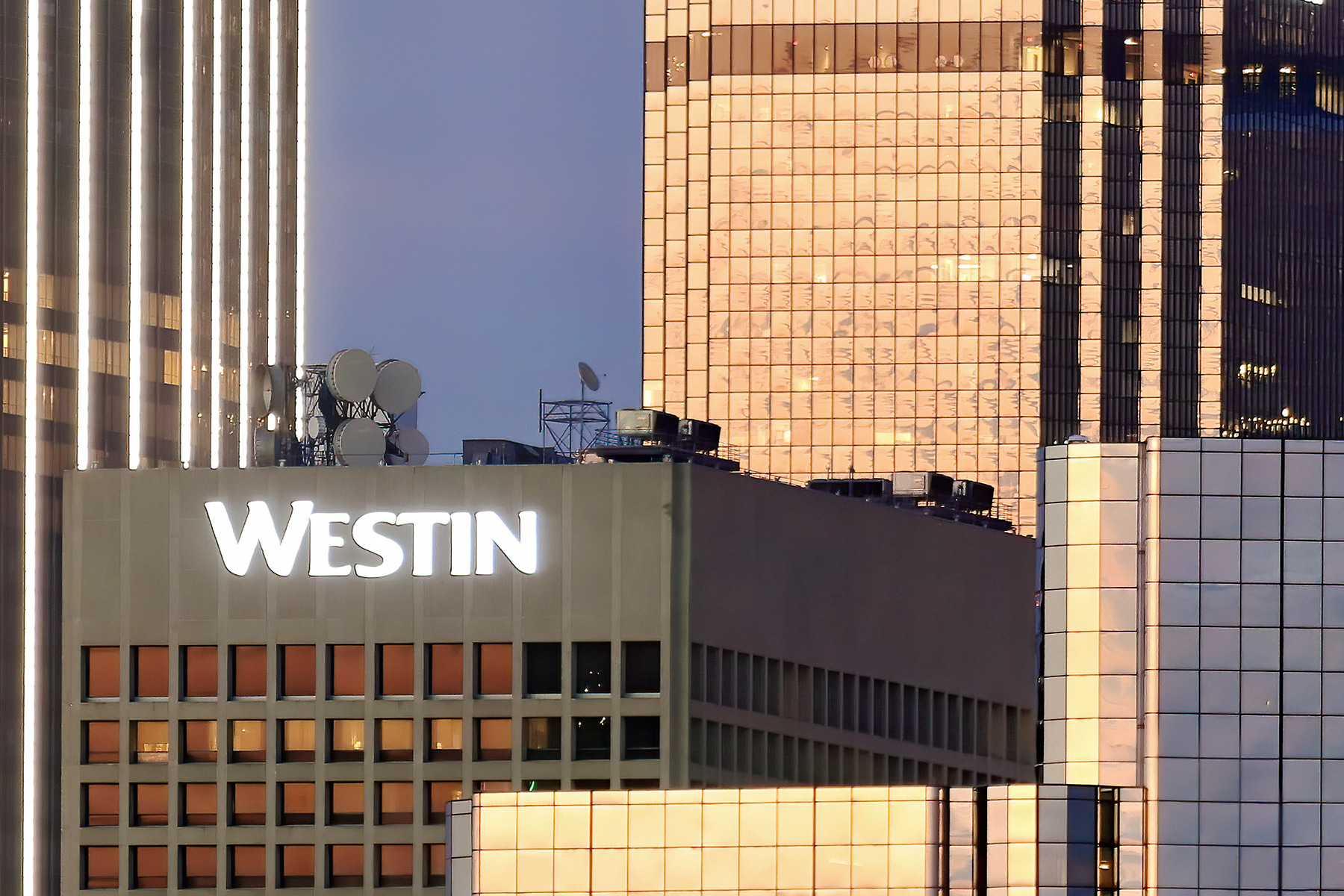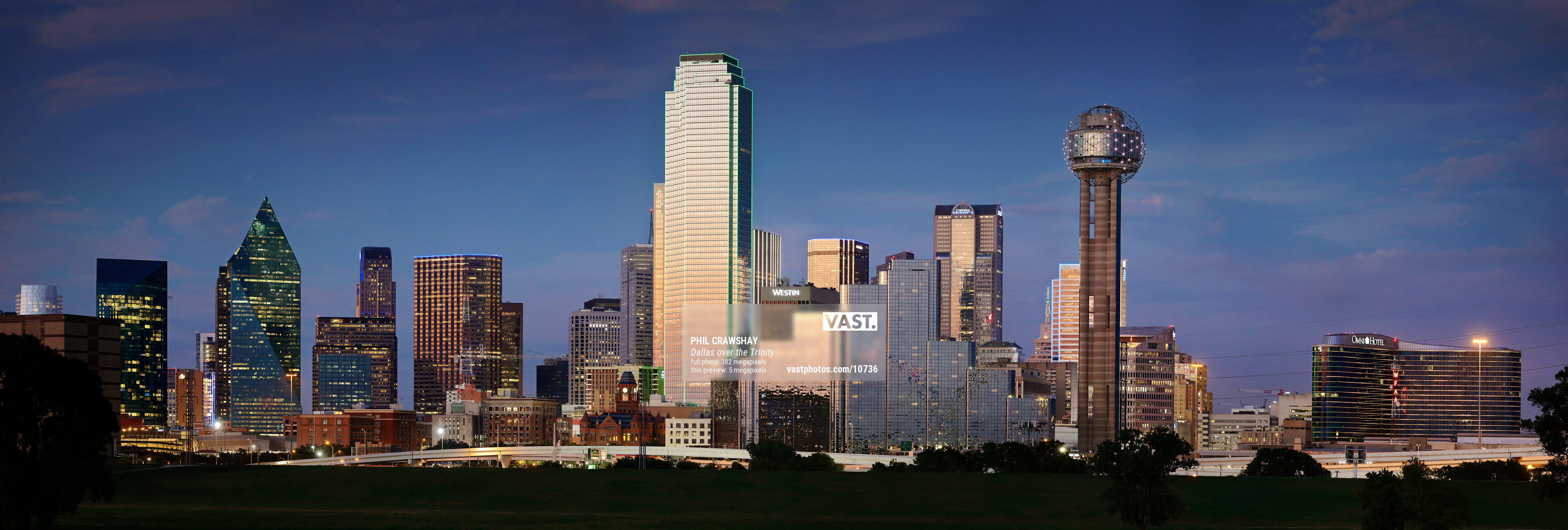 382 megapixels! A very high resolution, large-format VAST photo print of the Dallas, Texas skyline at dusk; panorama photograph created by Phil Crawshay in Dallas, Texas.