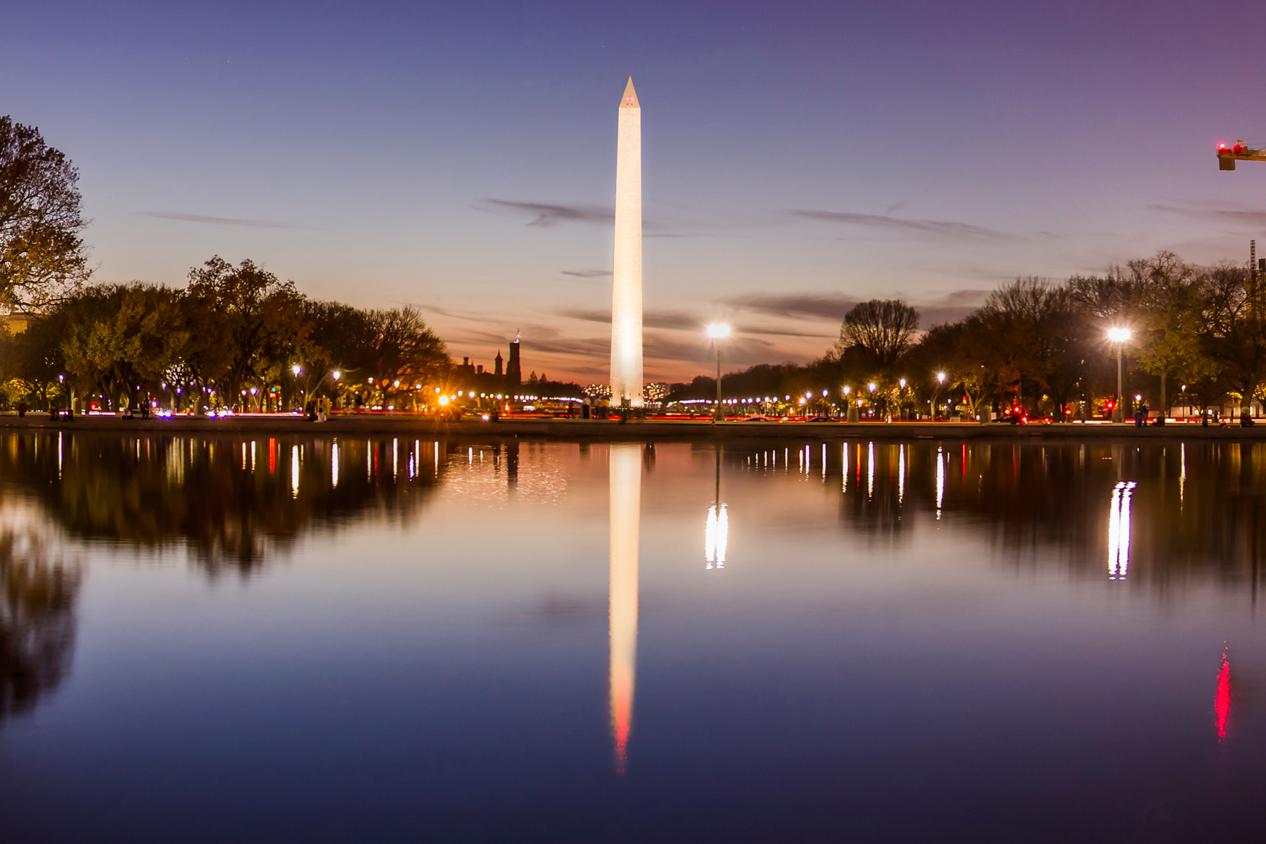 Washington DC's many reflecting pools represent fantastic opportunities to capture the stunning monuments and parks that populate the city. They do this especially well during the gloaming, which is the time of day when the very last traces of twilight remain in the sky.