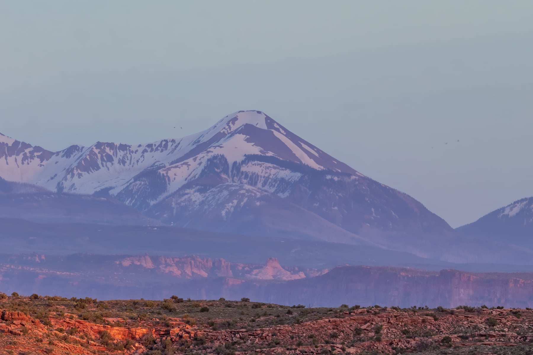 Delicate arch, also referred to as "the Chaps" or "the Schoolmarm's Bloomers" by local cowboys because of it's distinctive shape. Spring snow still lingers on the La Sal Mountains behind Delicate Arch as the arch itself is bathed in the warm light of sunset illuminating the top portion. We had hiked up to Delicate Arch to capture the Moon rise. I shot this image a few minutes before the sunset.