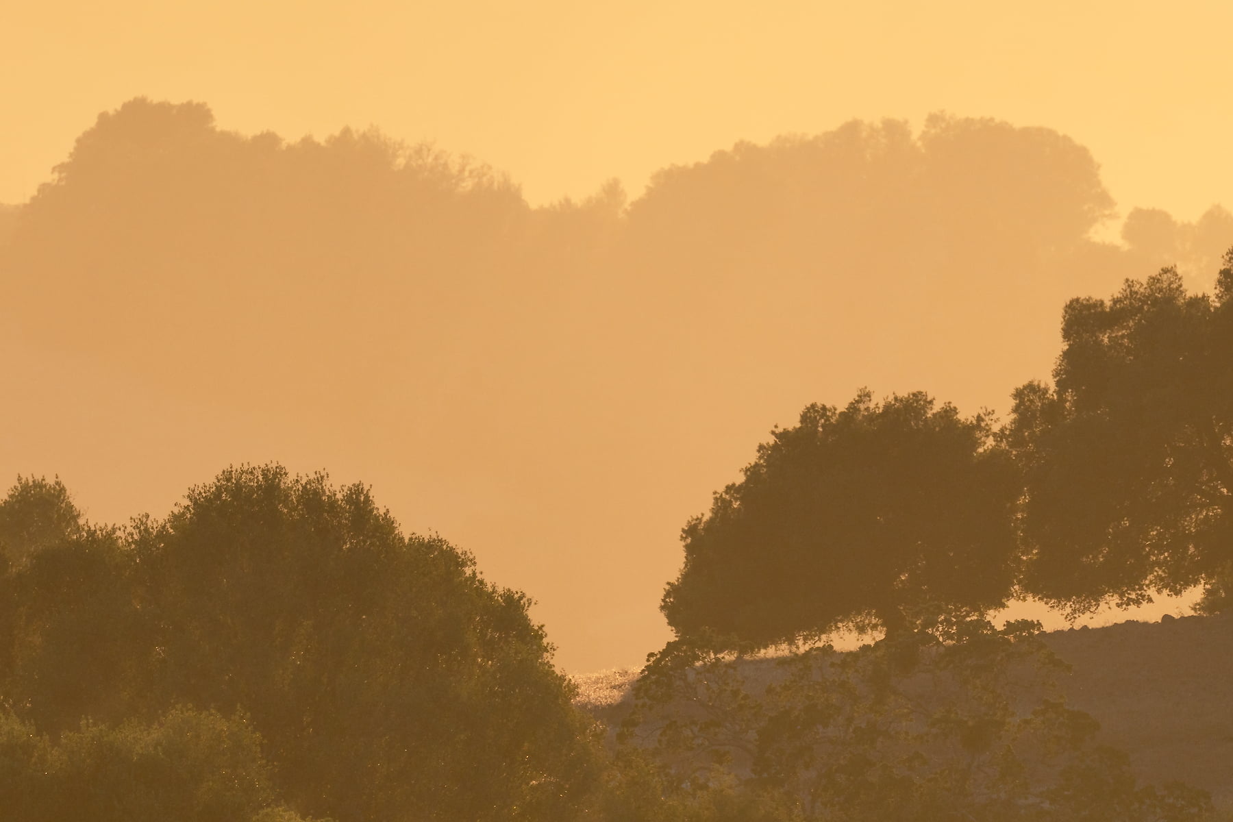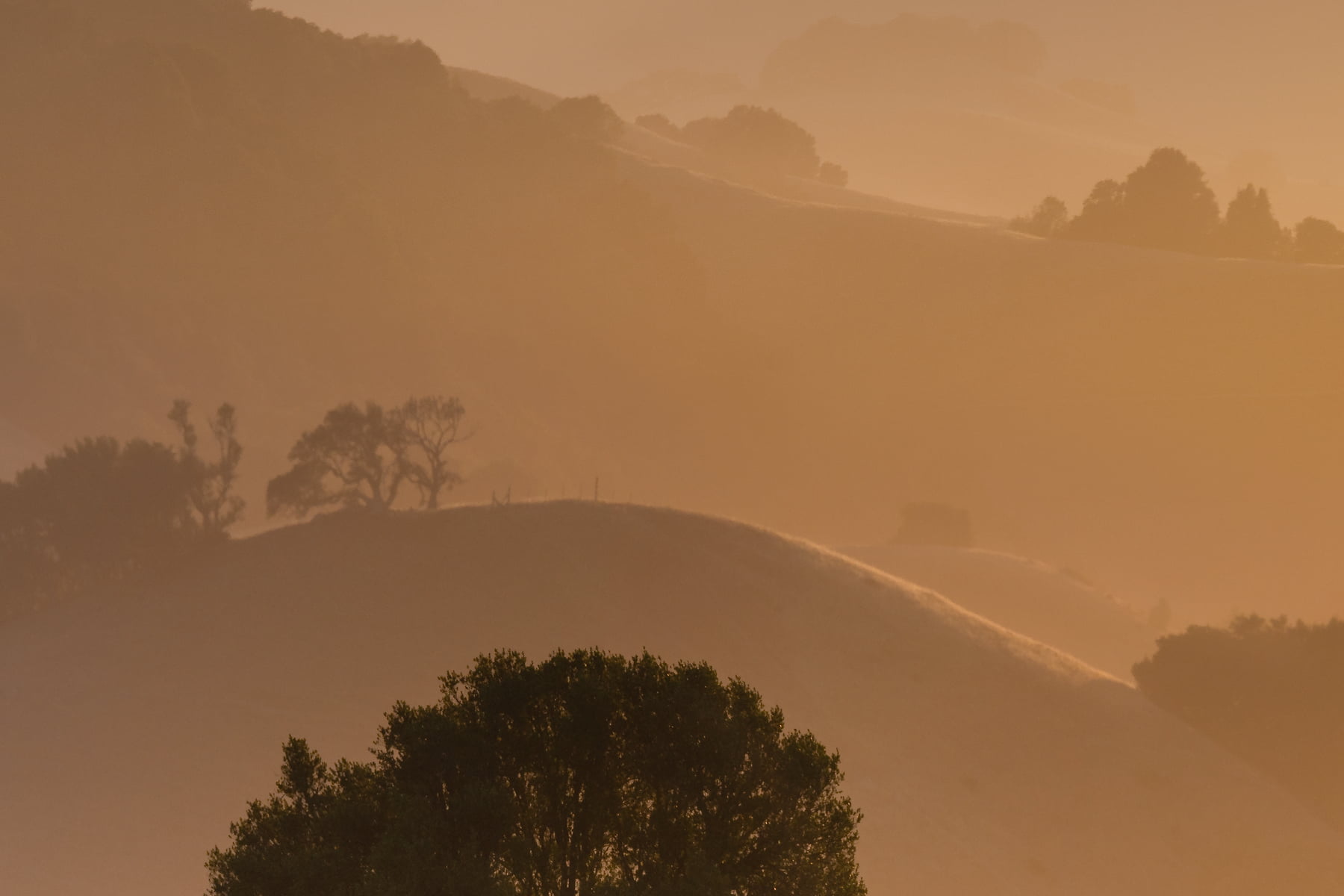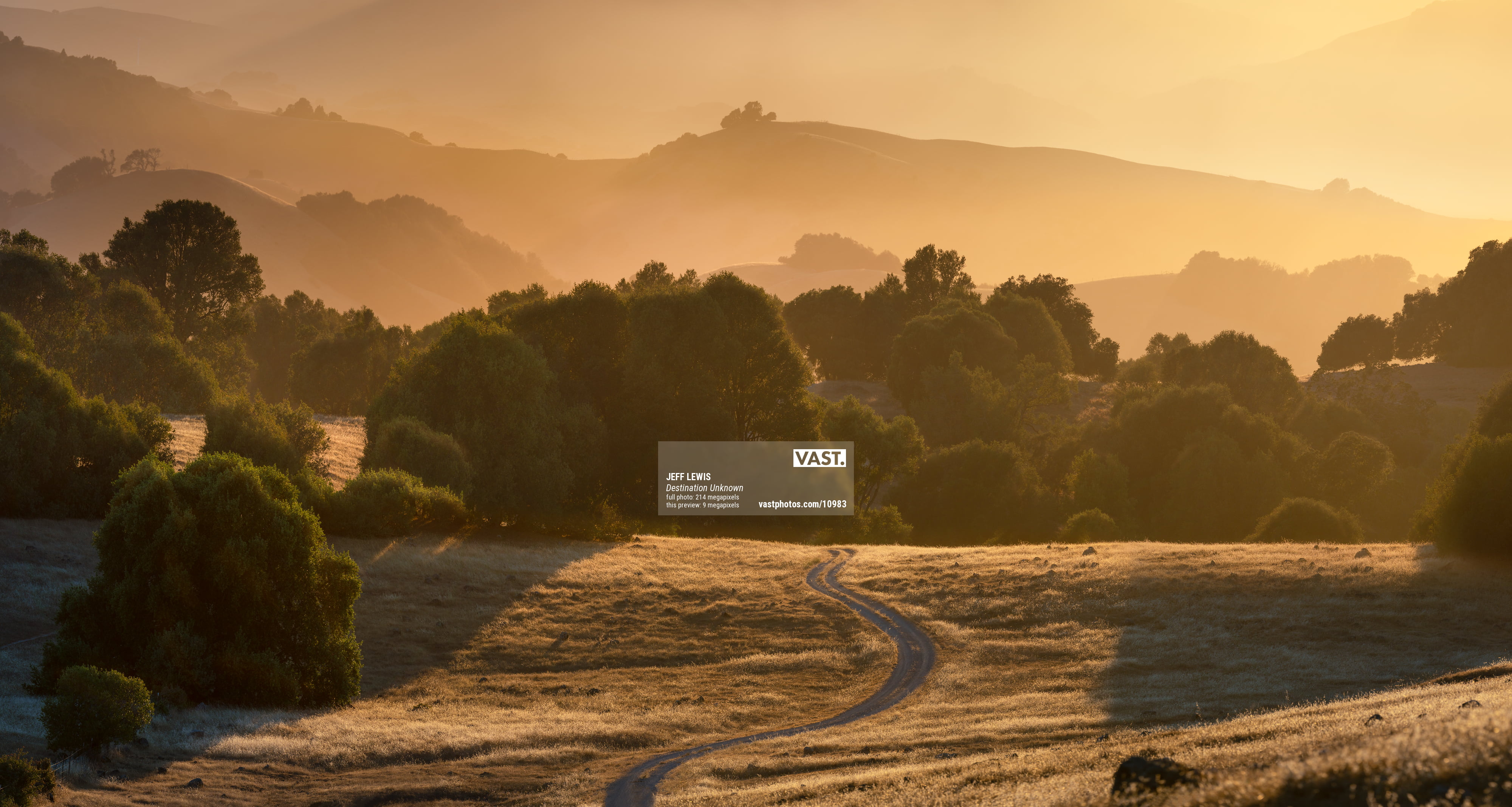 214 megapixels! A very high resolution, large-format VAST photo print of a golden sunset landscape with trees, hills, and a dirt road; landscape photograph created by Jeff Lewis in Marin County, California.