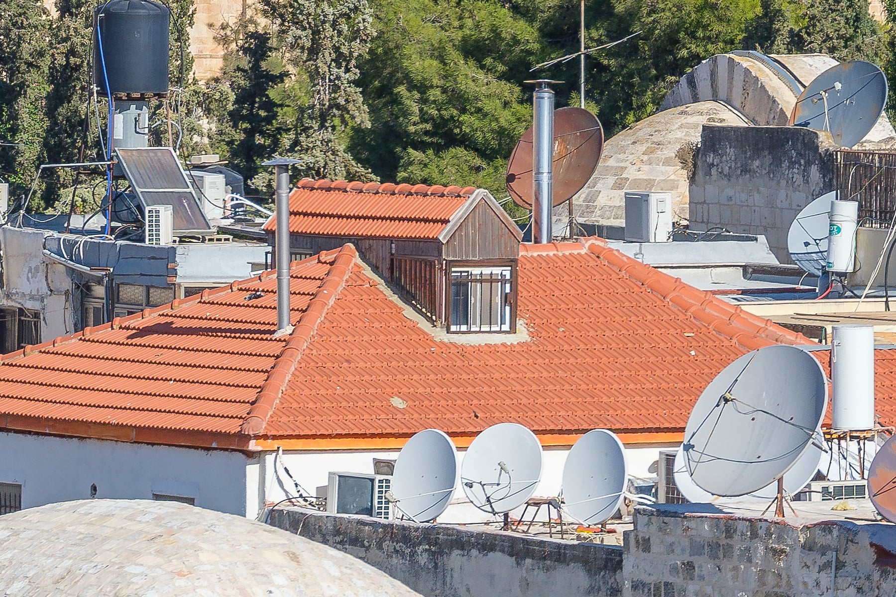 The photograph's composition is masterful, with a perfect balance between the natural and man-made elements. The golden dome is positioned off-center, adhering to the rule of thirds, which guides the viewer’s gaze across the image, allowing them to take in the various layers of detail. Including the distant hills and the scattered rooftops adds a sense of scale and context, reminding the viewer of the vastness and complexity of Jerusalem.
