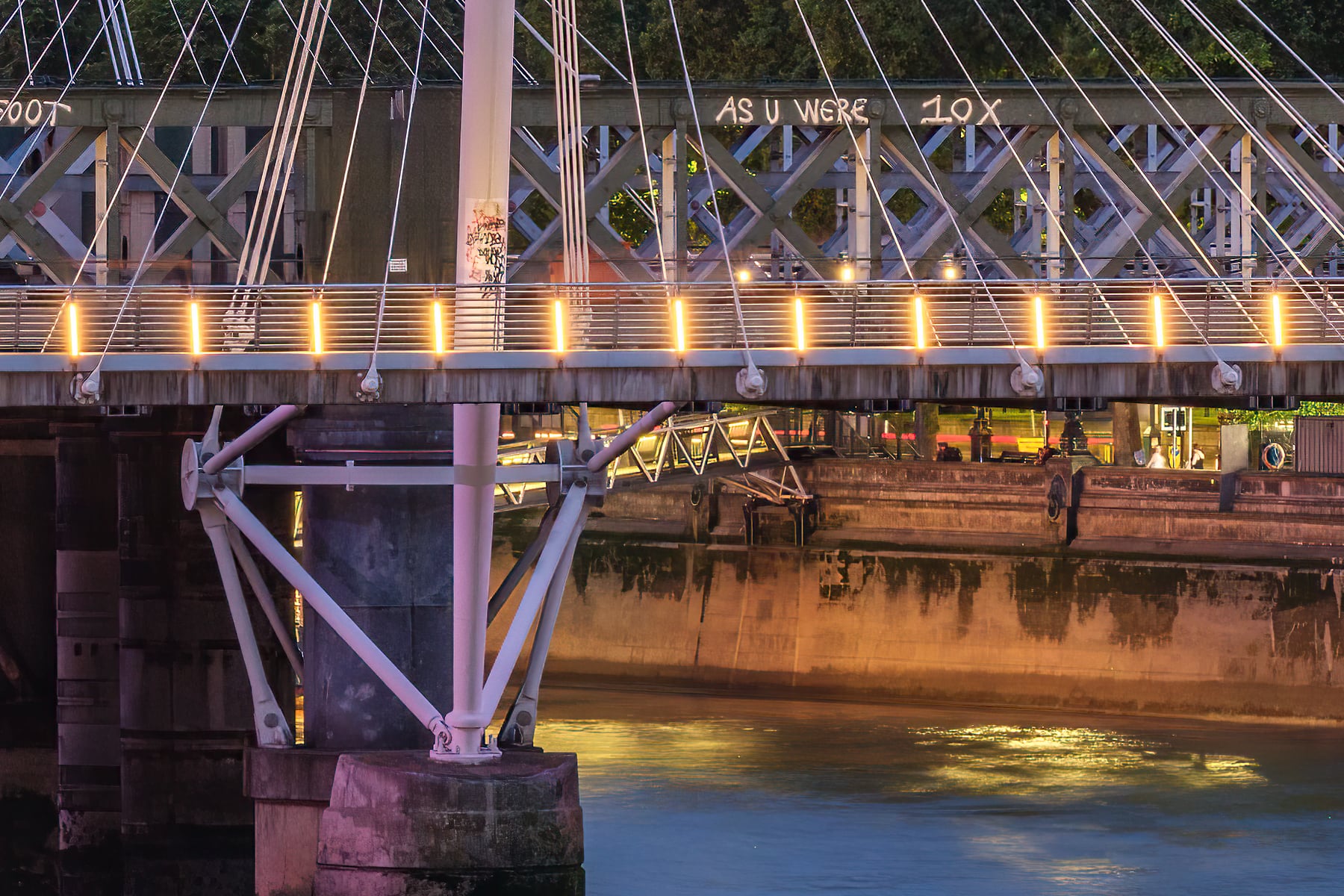 The bustling activity along the riverbanks is evident, with boats gliding gently across the water and the glow of streetlights adding warmth to the scene. The illuminated bridges, including the Hungerford Bridge with its distinctive pedestrian walkways, connect the two sides of the river, symbolising the seamless blend of modernity and history that characterises London.