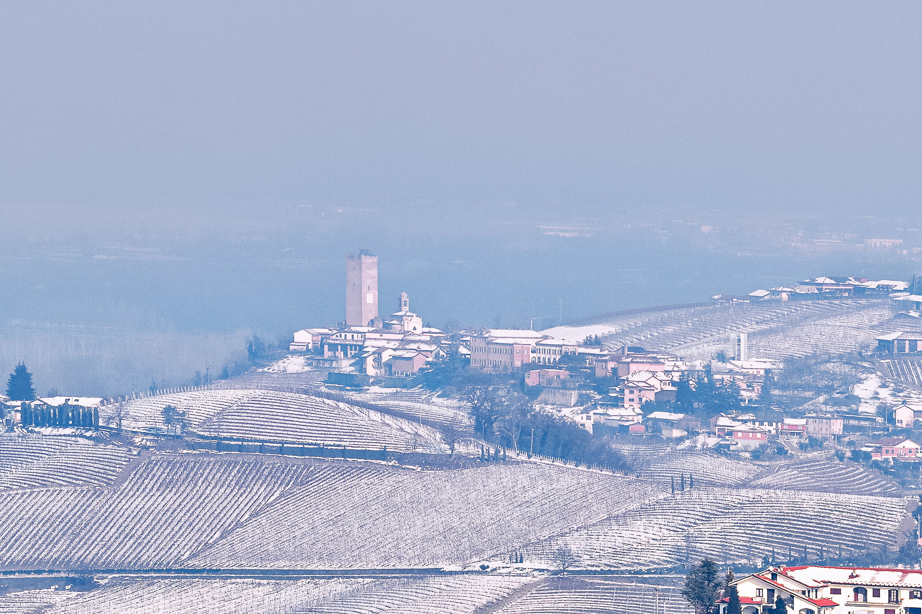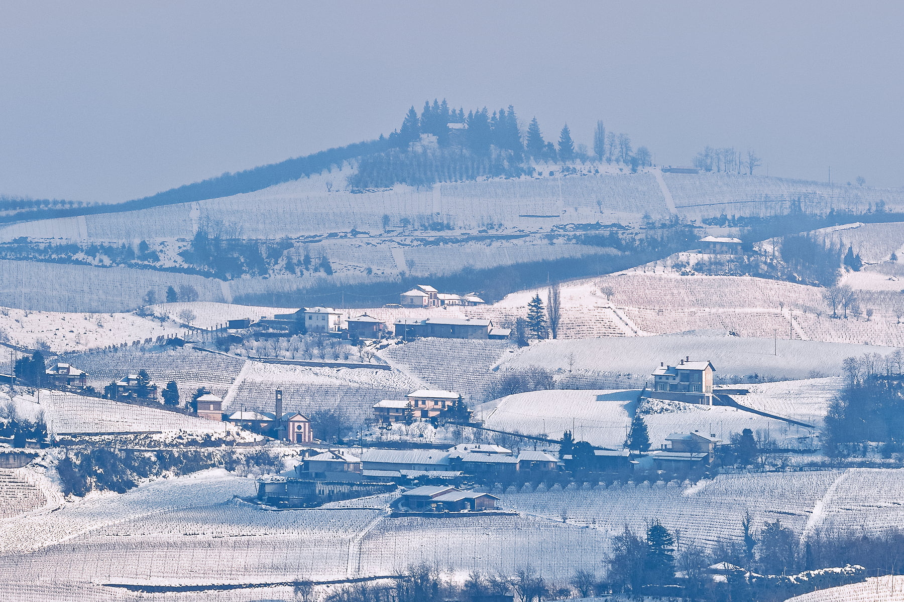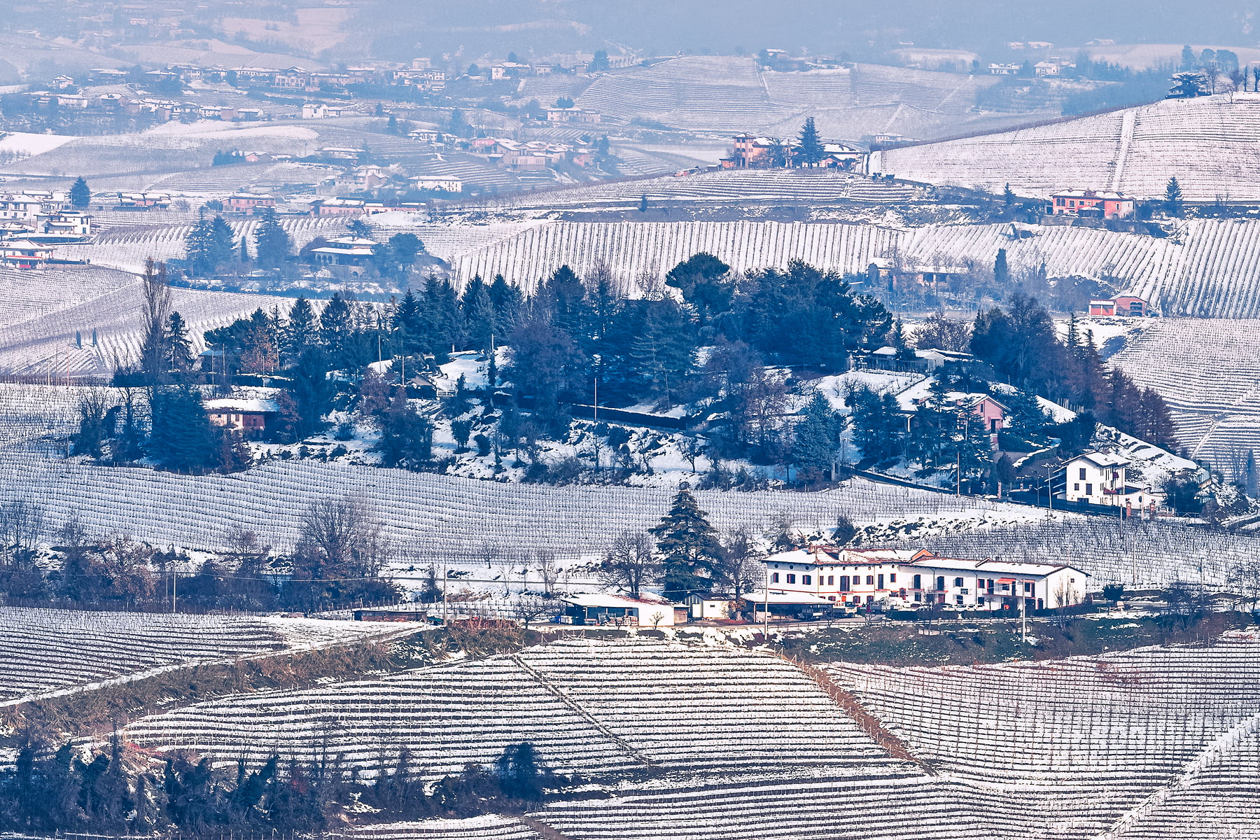 In this photo you can wander with your eyes looking for towers and churches perched on the highest peaks of the hills, the farms with their vineyards, the villages with their roads, in an endless path, all under a soft blanket of snow, abundant in this winter