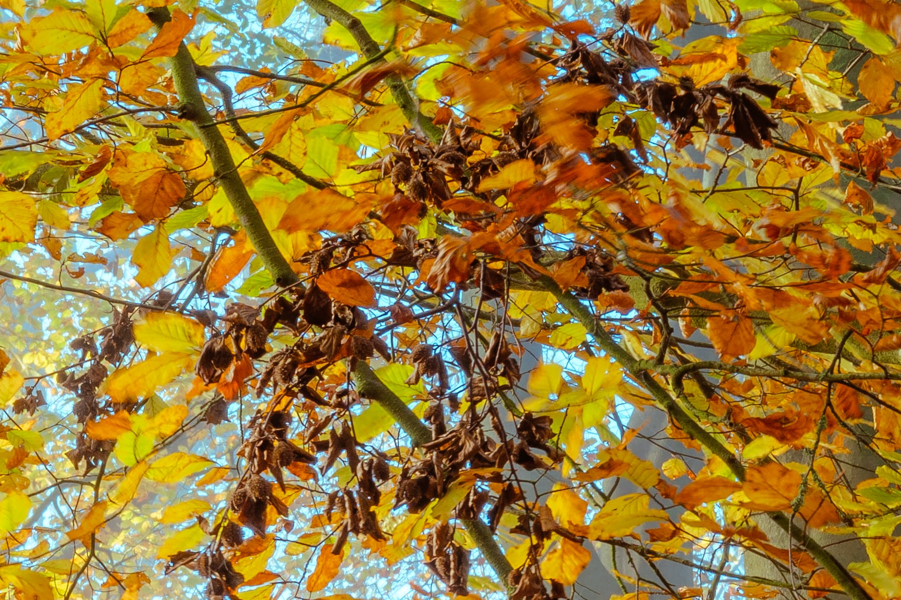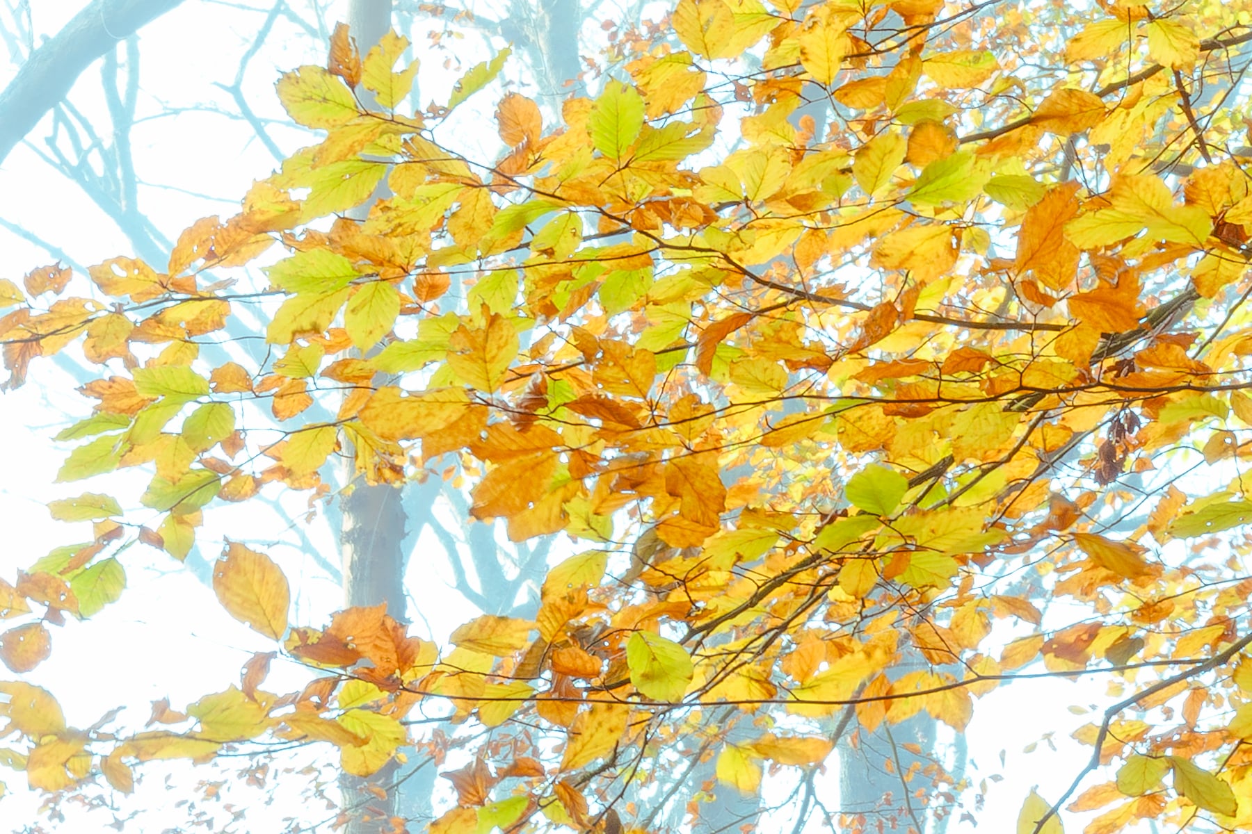 As the eye moves deeper into the woodland, the mist thickens, lending an enchanting and mysterious atmosphere to the landscape. The trees, their trunks sturdy and strong, stand in silent harmony, their fading foliage a reminder of the inevitable transition from autumn to winter. Dappled sunlight filters through the thinning canopy, illuminating certain patches of forest floor while others remain cloaked in shadow, creating a mesmerizing contrast.