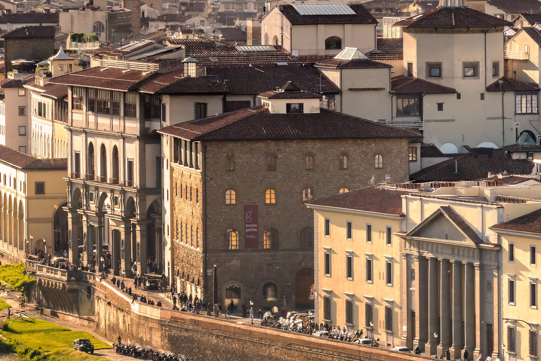 From the Piazzale Michelangelo on the south side of the river, you get a sweeping view of the city, and are able to see in incredible high resolution detail all of the famous locations and attractions. This includes the Cathedral of Santa Maria del Fiore on the right with its beautiful red-tiled dome (the "duomo"), and even Ponte Vecchio, the famous bridge filled with high-end shops and wonderful views of both sides of the embankments of the Arno river.