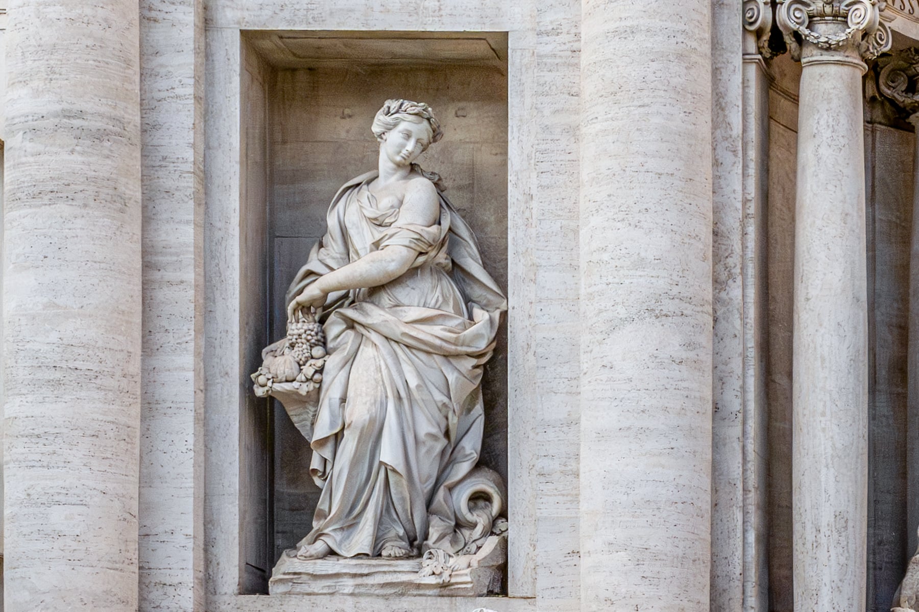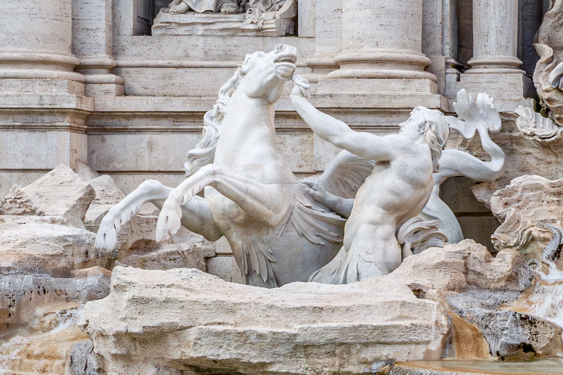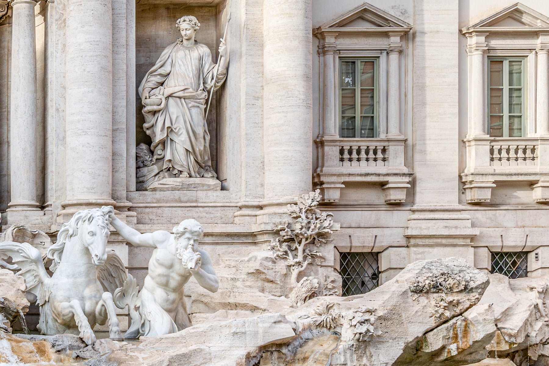 At over 85 feet tall and 160 feet wide, it’s the largest fountain in the city. It was sculpted from Travertine Stone and depicts Oceanus, the god of fresh water, being pulled to the sea on his shell-shaped chariot by winged hippocamps (half horse and half fish) and tritons. The changing sea tides are represented by the calm hippocamp on one side and the unruly one on the other side. The statues on either side of Oceanus represent Abundance to the left and Health to the right. The four statues on the top of the building represent the abundance that water brings: fruit, wheat, grapes for wine, and flowers, as seen in the statues’ hands.